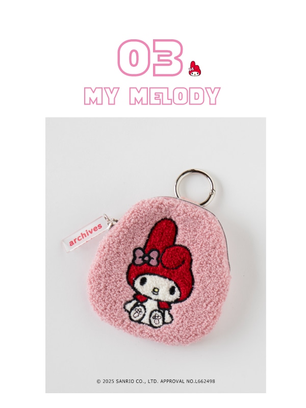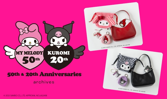 MY MELODY KUROMI 50th&20th ANNIVERSARY マイメロディの50周年、クロミの20周年 を記念してarchivesでもスペシャルなアイテムをご用意しました♪ マイメロディ巾着ポーチ¥3,300(taxin) マイメロディチャーム¥2,200(taxin) マイメロディサガラポーチ¥2,750(taxin) マイメロディチャーム付きバッグ¥6,930(taxin) クロミ巾着ポーチ¥3,300(taxin) クロミチャーム¥2,200(taxin) クロミサガラポーチ¥2,750(taxin) クロミチャーム付きバッグ¥6,930(taxin) SPECIALITEMはこちら