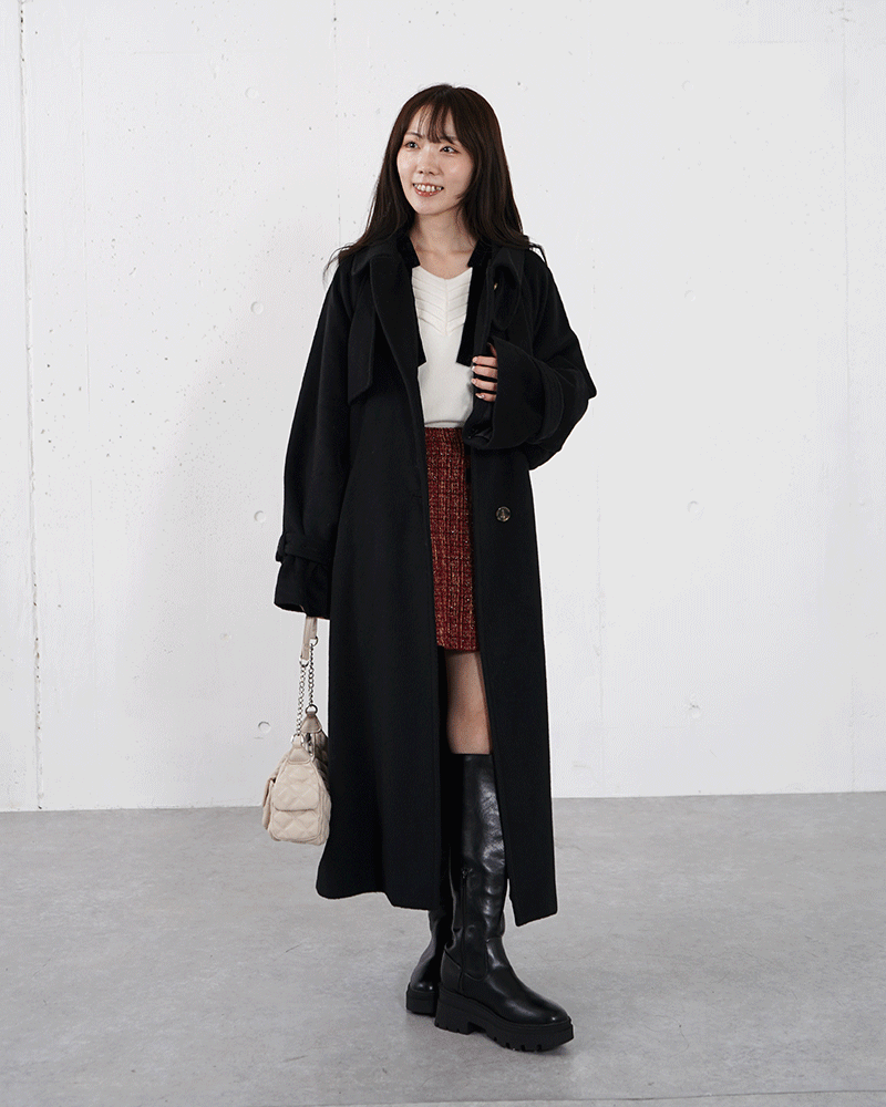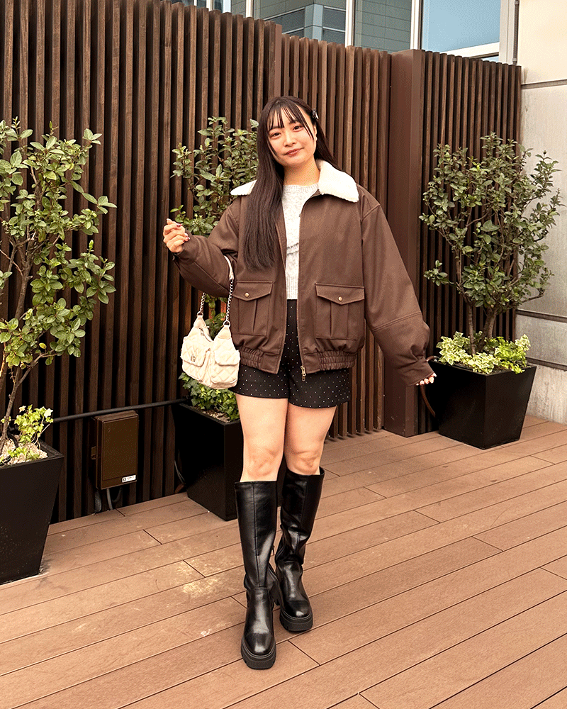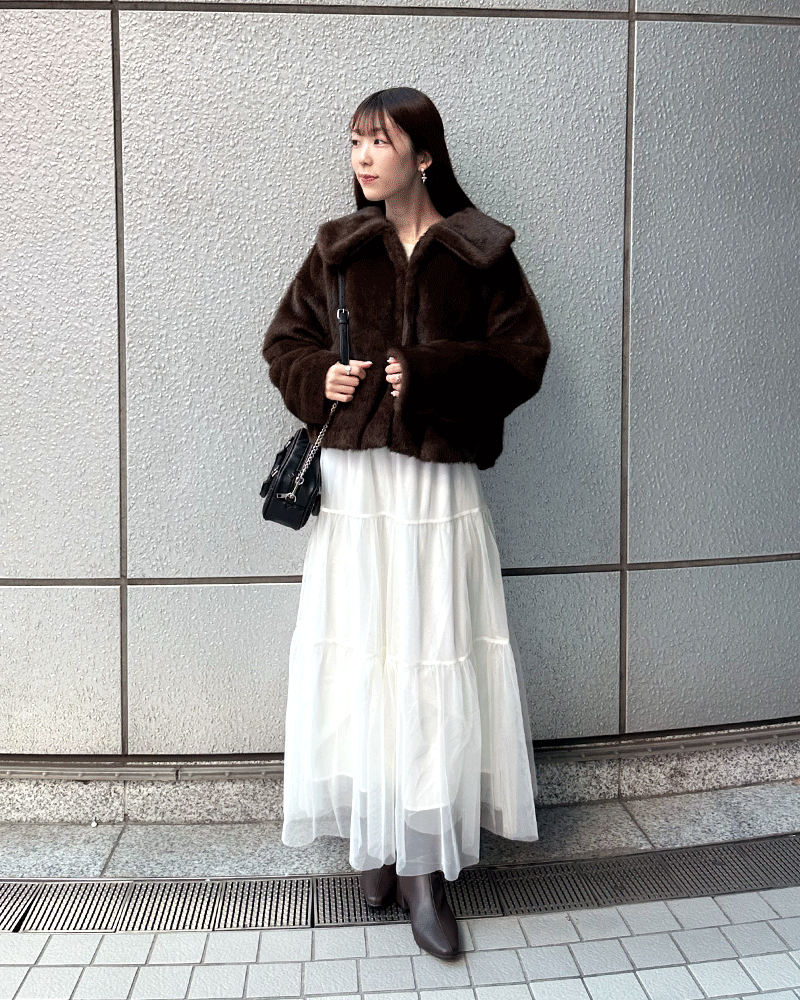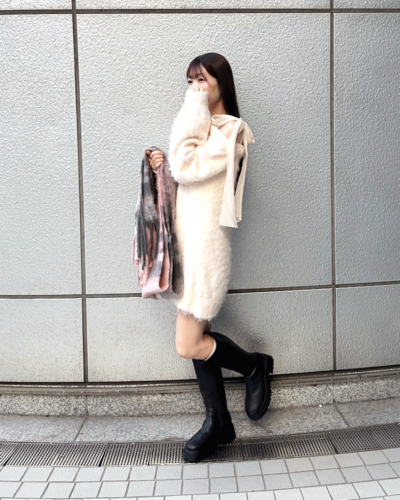 outer¥19,800 / knit¥5,940 / skirt¥5,940 / boots¥11,000 / bag¥6,930