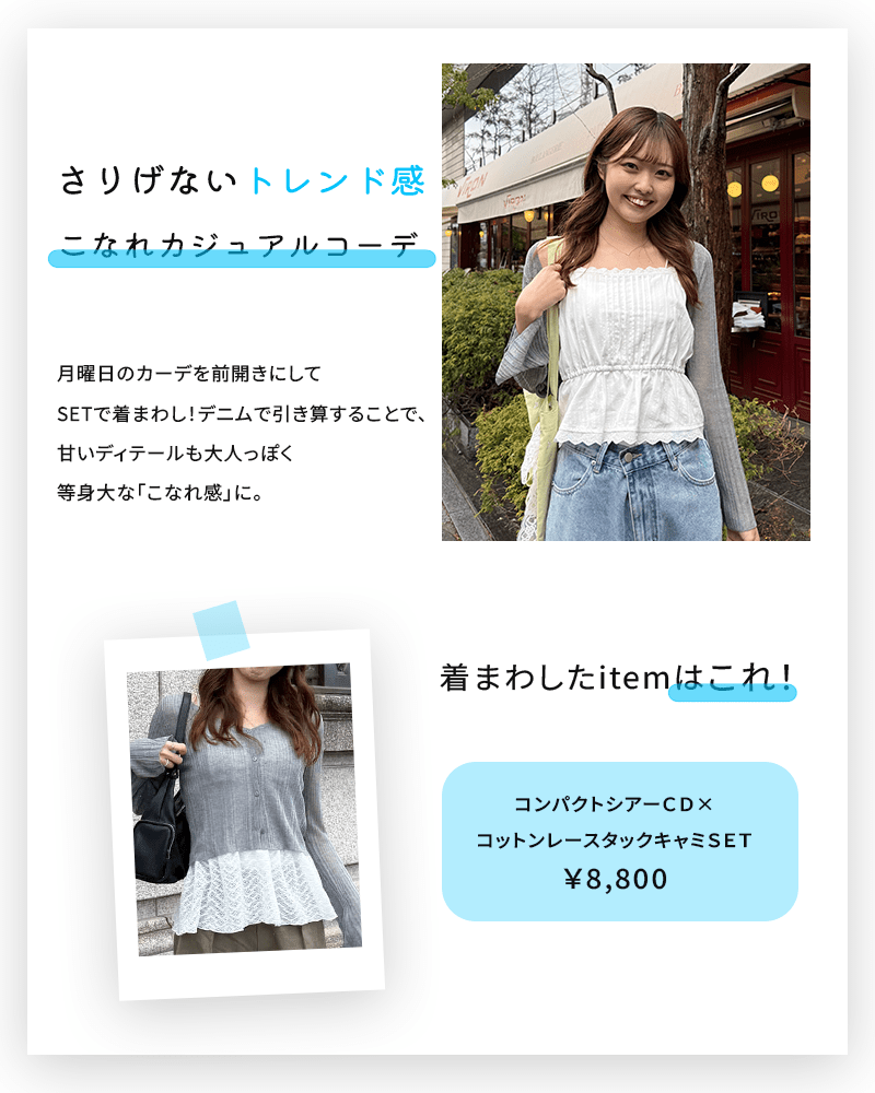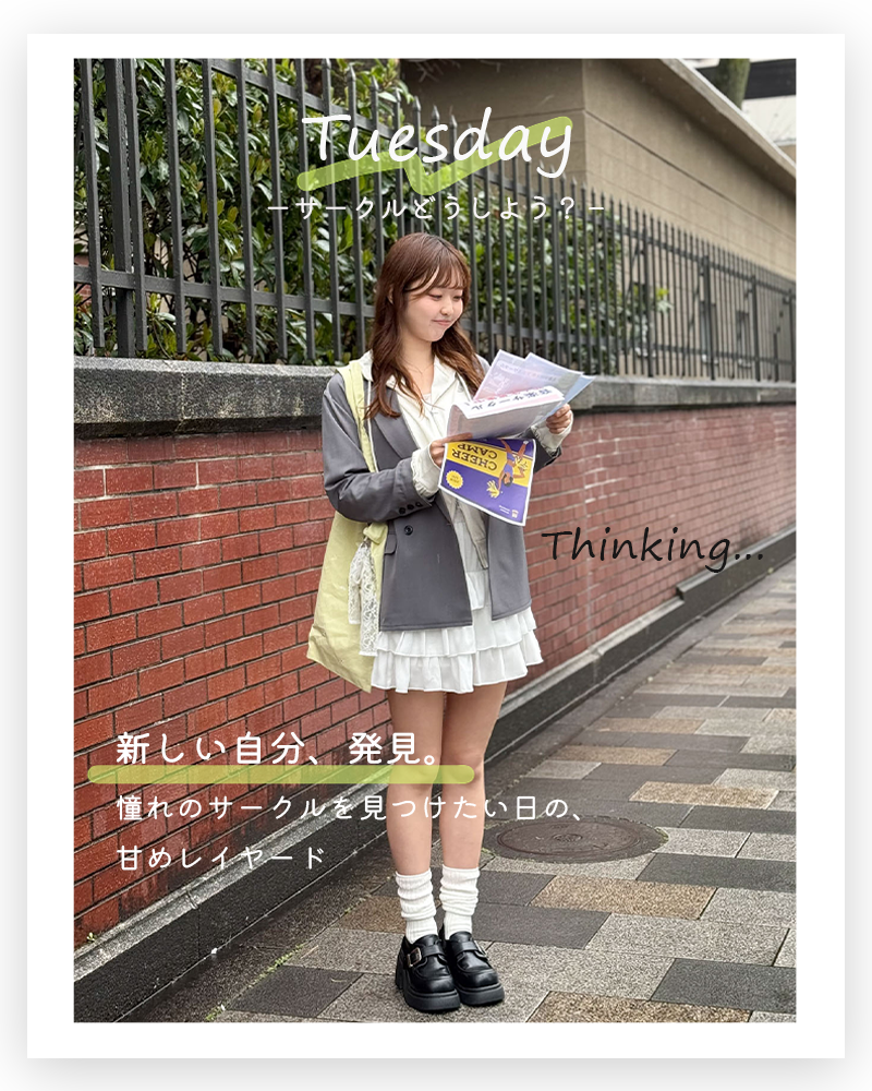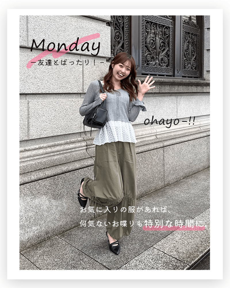新年度、何着る? ー曜日別着回し5daysー いよいよ新年度! 大学生活、5日間何着よう...? 毎日を可愛く着まわせるおすすめコーデを シーンごとにご紹介します♪ 月曜日コーデはこちら 火曜日コーデはこちら 水曜日コーデはこちら 木曜日コーデはこちら 金曜日コーデはこちら 1週間着まわしたアイテムはこちら!