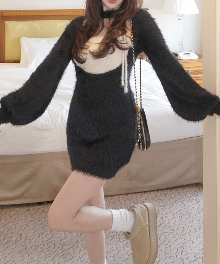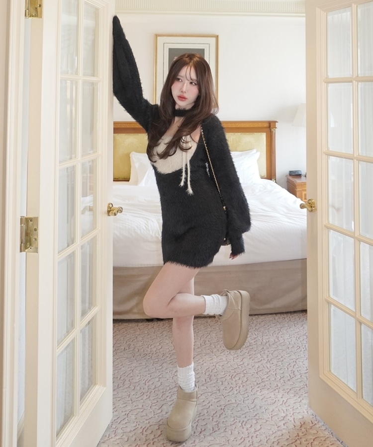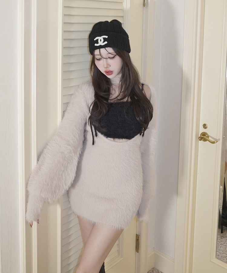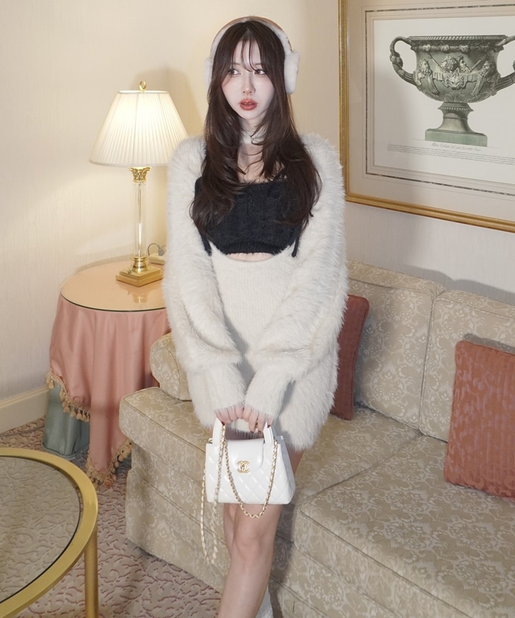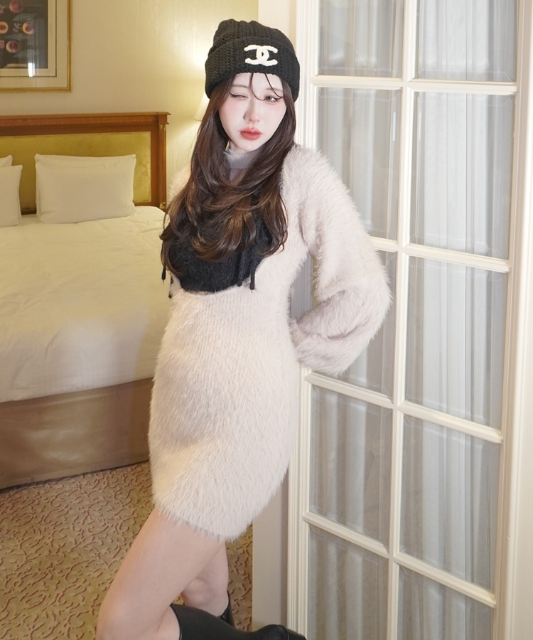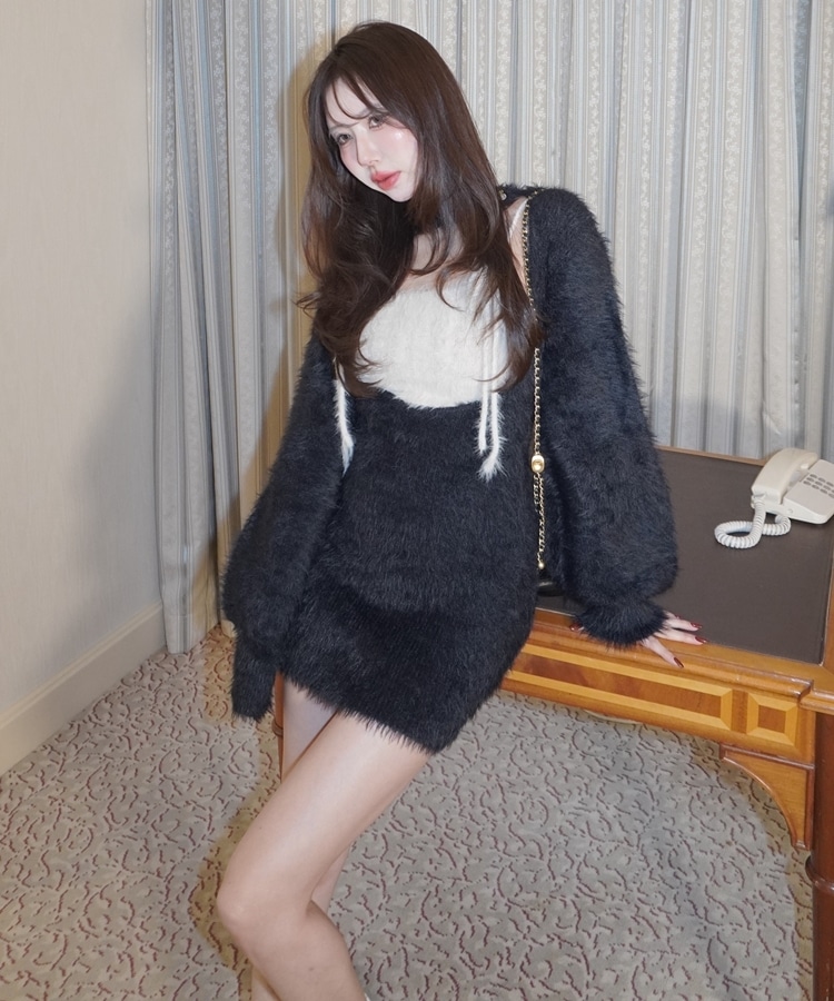 フワフワのフェザー素材のビスチェとワンピースのセットアイテム