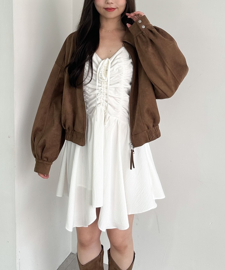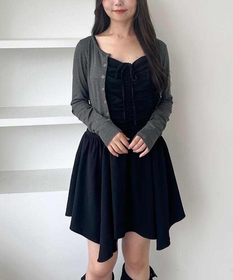 フロントのドロストデザインが目を引くミニキャミワンピース。
