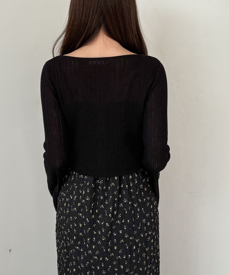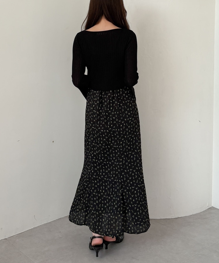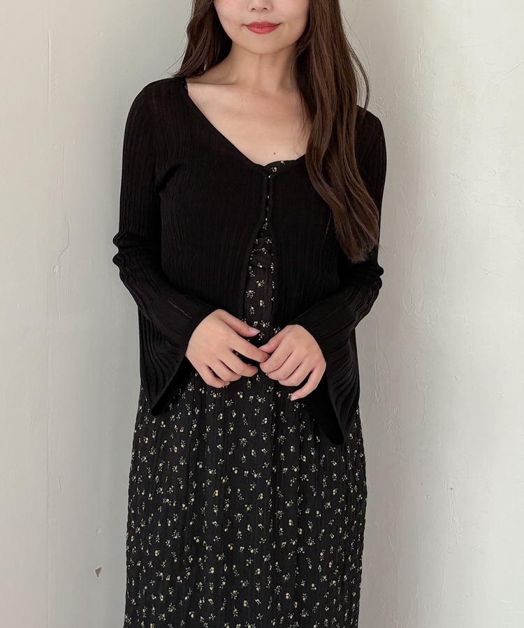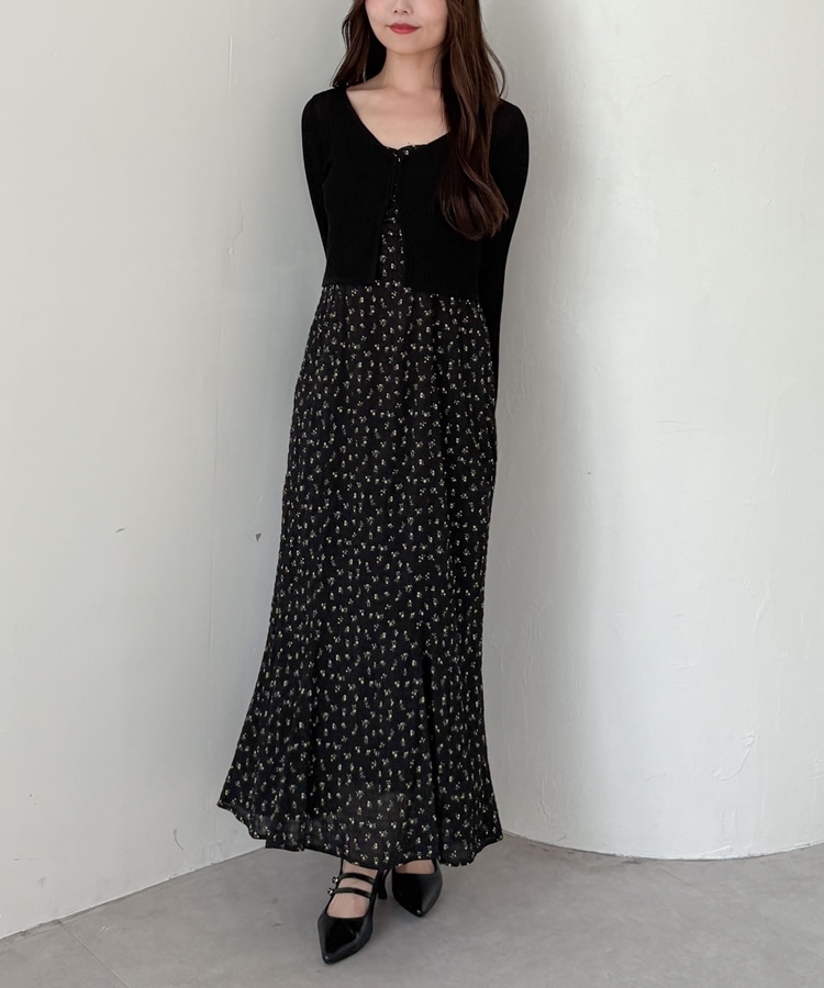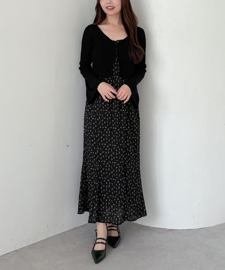 シアーリブニットカーディガン×花柄キャミワンピースSET BLACK