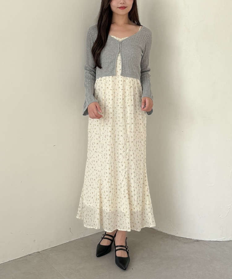 シアーリブニットカーディガン×花柄キャミワンピースSET IVORY