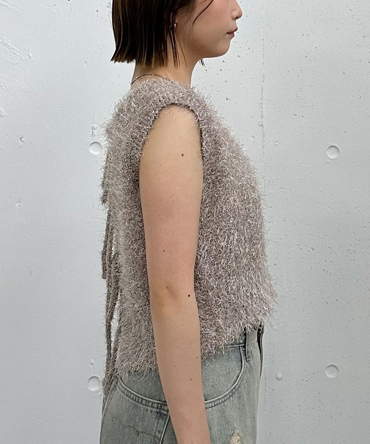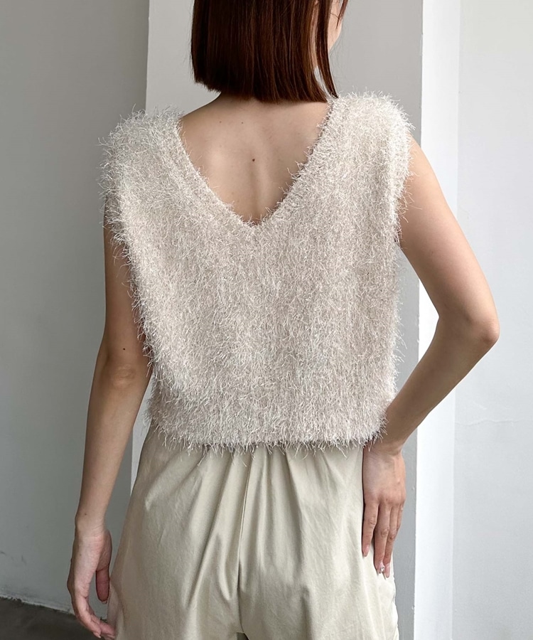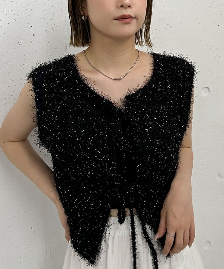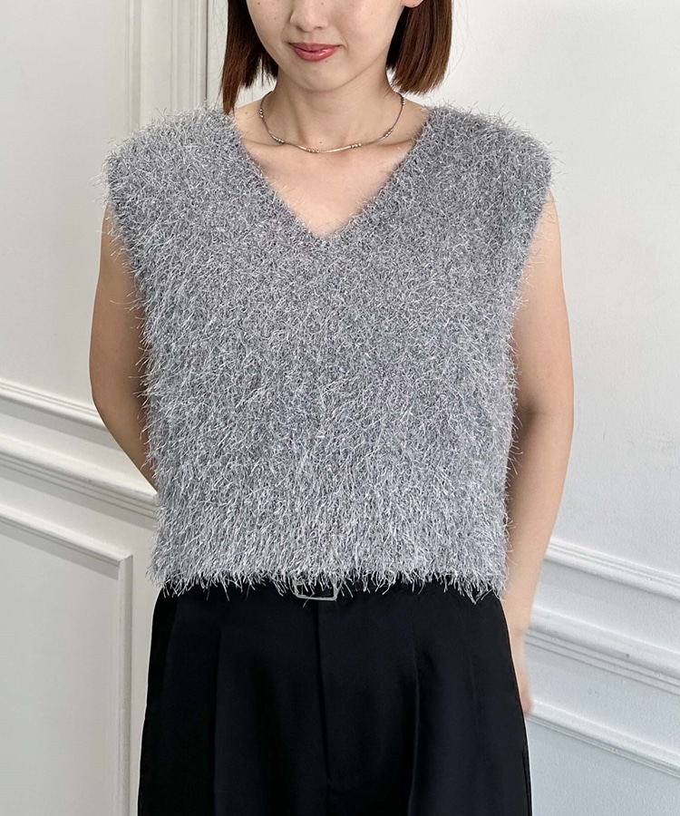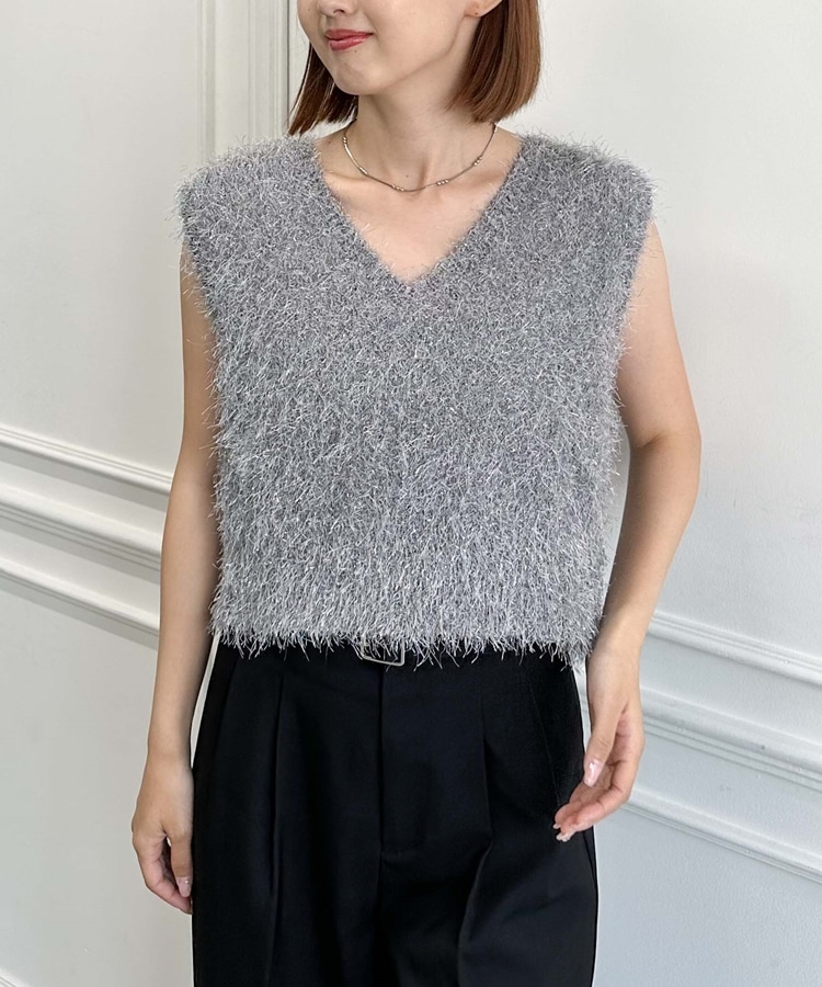 フェザー素材と華やかなラメが特徴のショート丈ニットベスト。