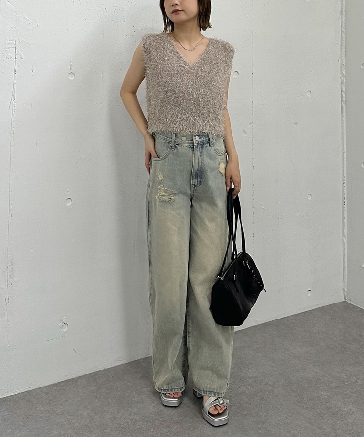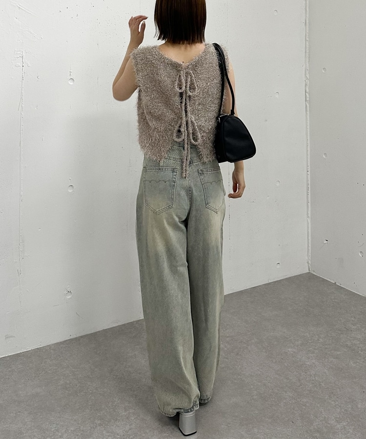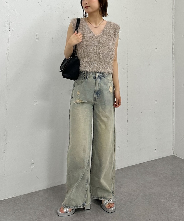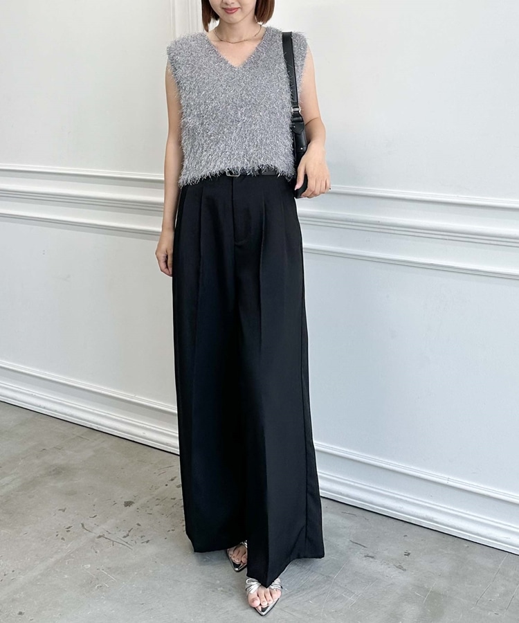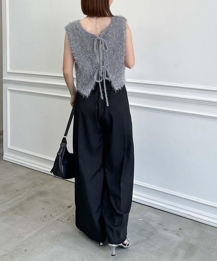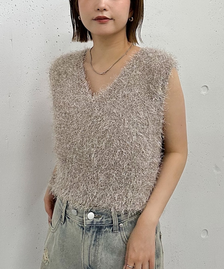 フェザー素材と華やかなラメが特徴のショート丈ニットベスト。