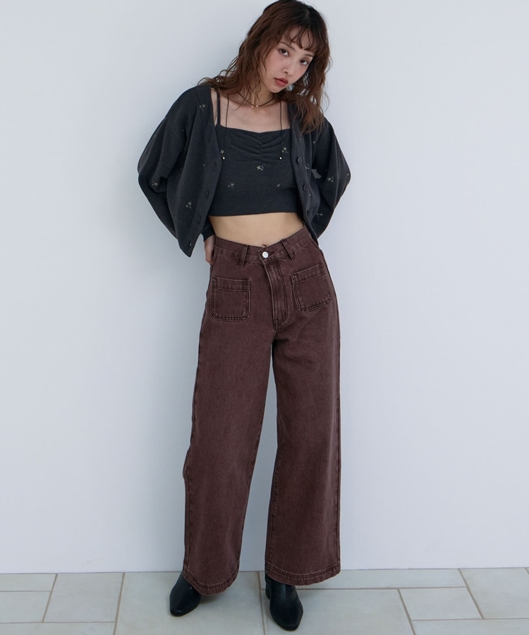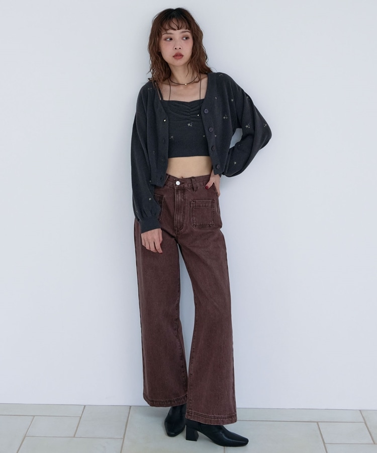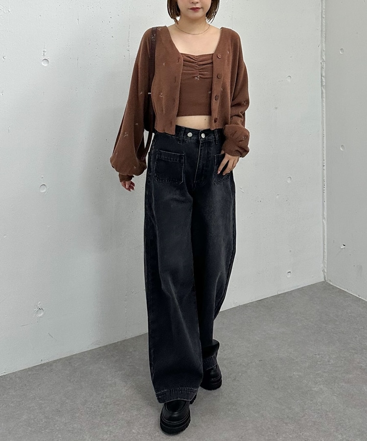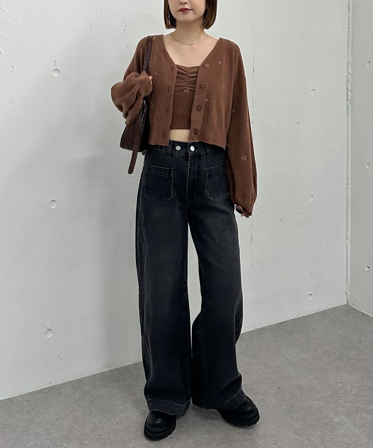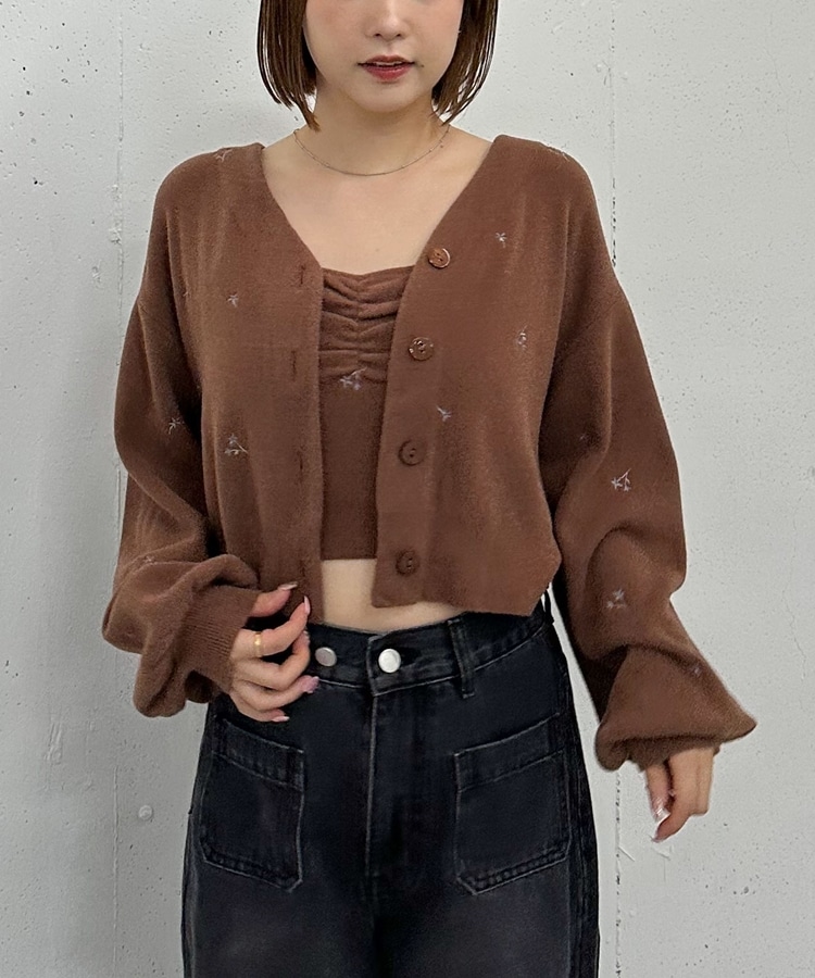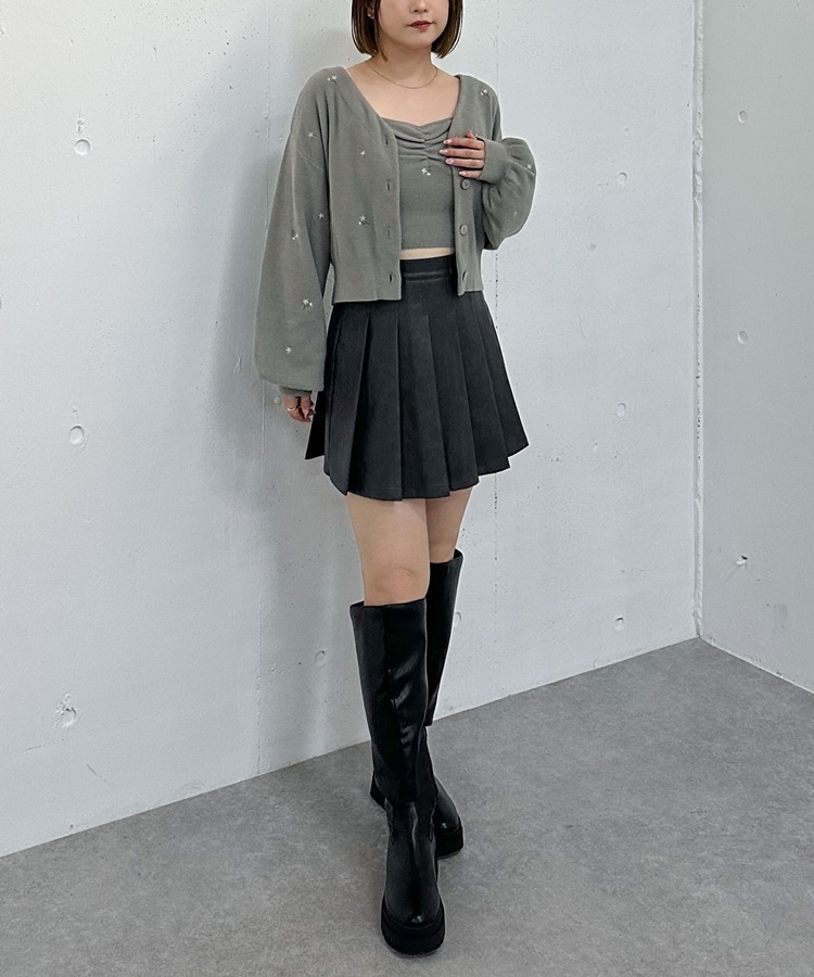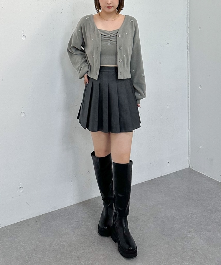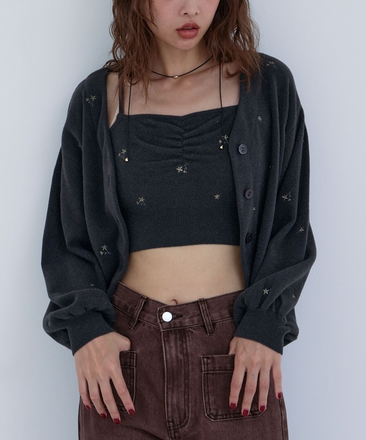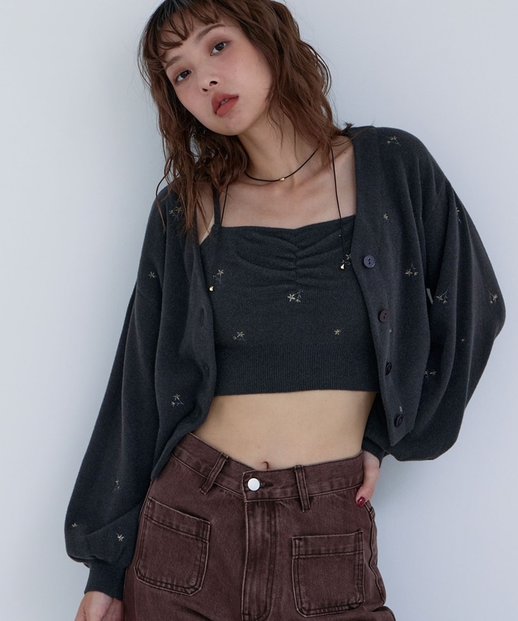 同素材のカーディガンとビスチェで一気にオシャレな着こなしに。