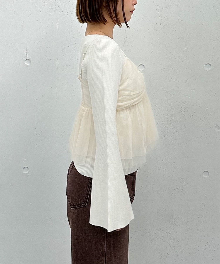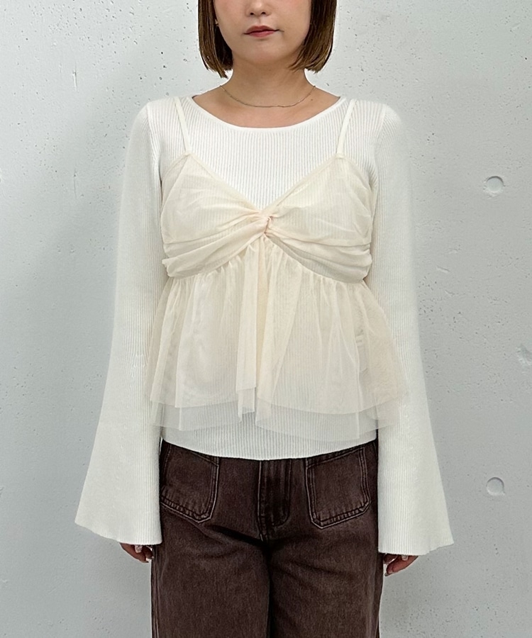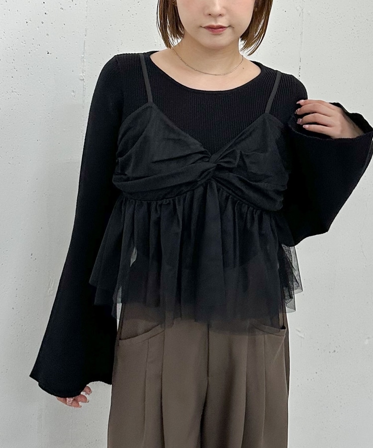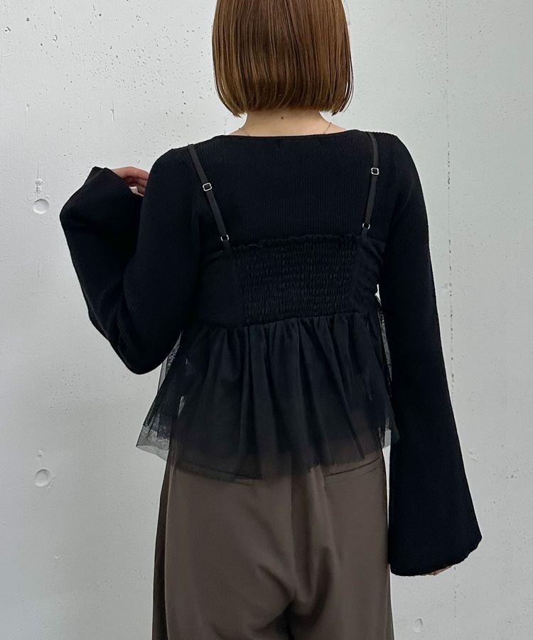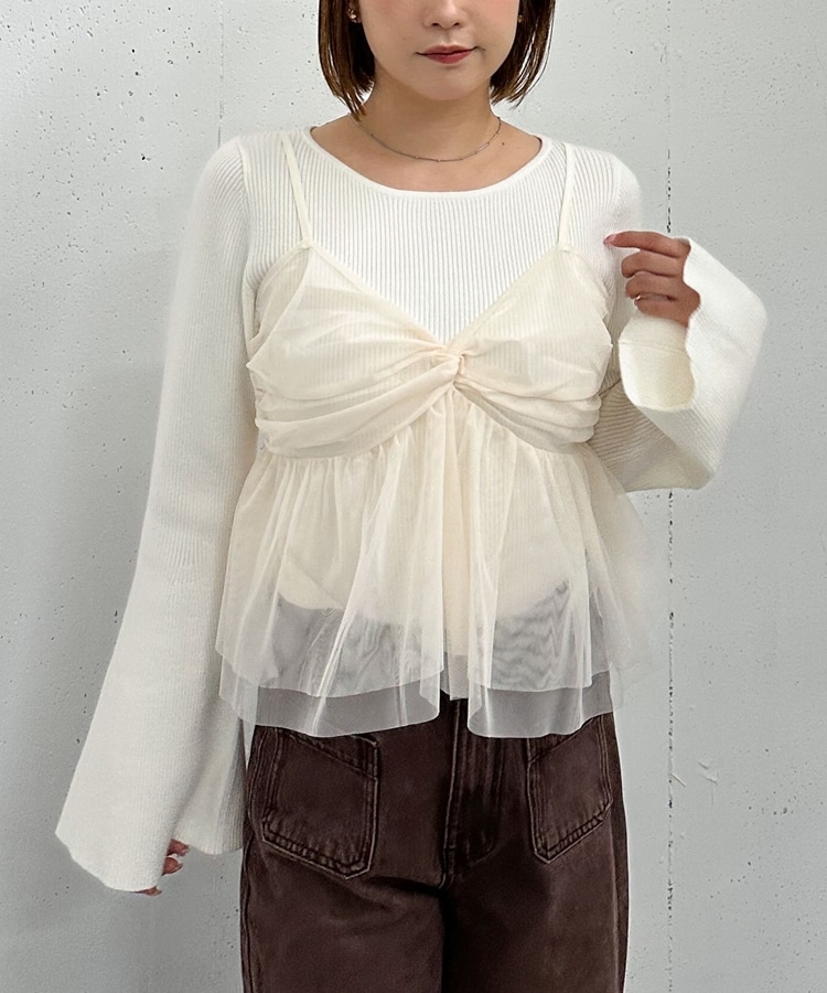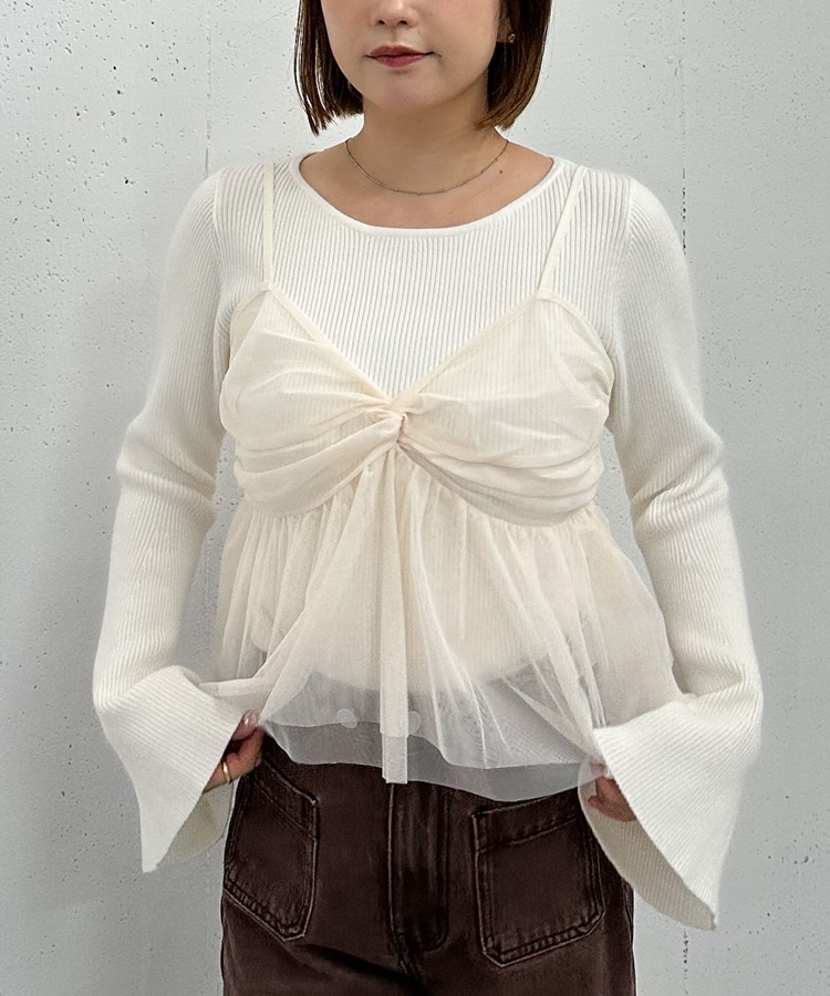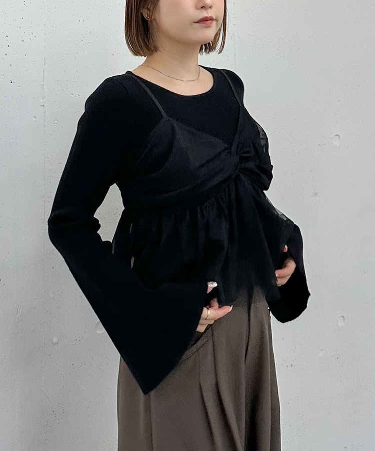 ■一枚でオシャレに着まる■archivesで人気のチュールビスチェにフレアスリーブニットがセットになった着回し力抜群アイテム。胸元のチュールにねじれを加えてボリュームアップ。裾も2枚チュールなのでふんわりとしたボリュームをプラス。透け感がしっかりとあるので柔らかく着て頂けます。セットのニットは着回ししやすいリブニット。袖がフレアになっているので女性らしさもアップ。デザイン性の高いアイテムなのでデニムやスラックスなどとシンプルにスタイリングするのがおススメです。ーーーーーーーーーーーーーーー透け感:チュニックあり/ニットなし裏地:なし伸縮性:あり光沢感:なし生地厚さ:普通洗濯方法:手洗い可※詳しいお手入れ方法は商品についているタグをご覧くださいーーーーーーーーーーーーーーー※ご利用のモニター環境により、実際の色味と多少異なる場合がございます。