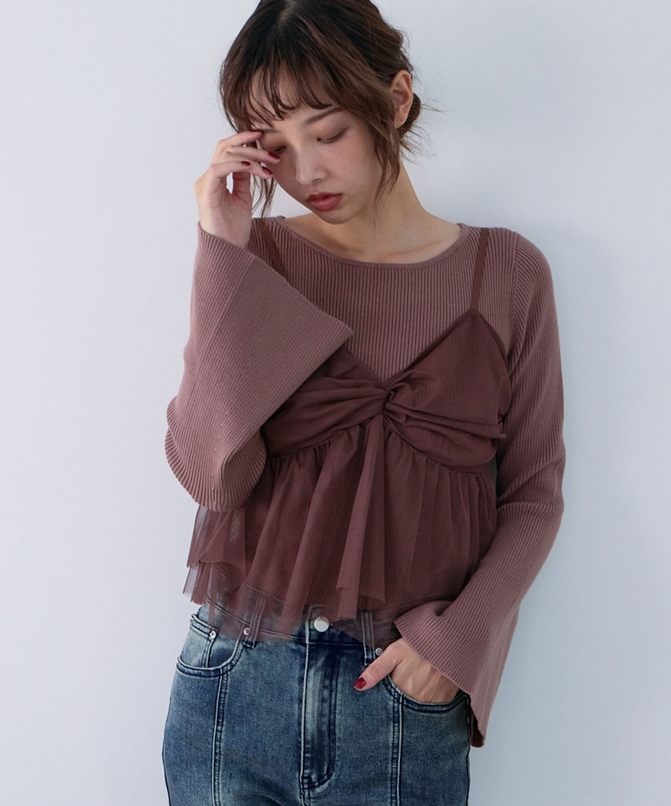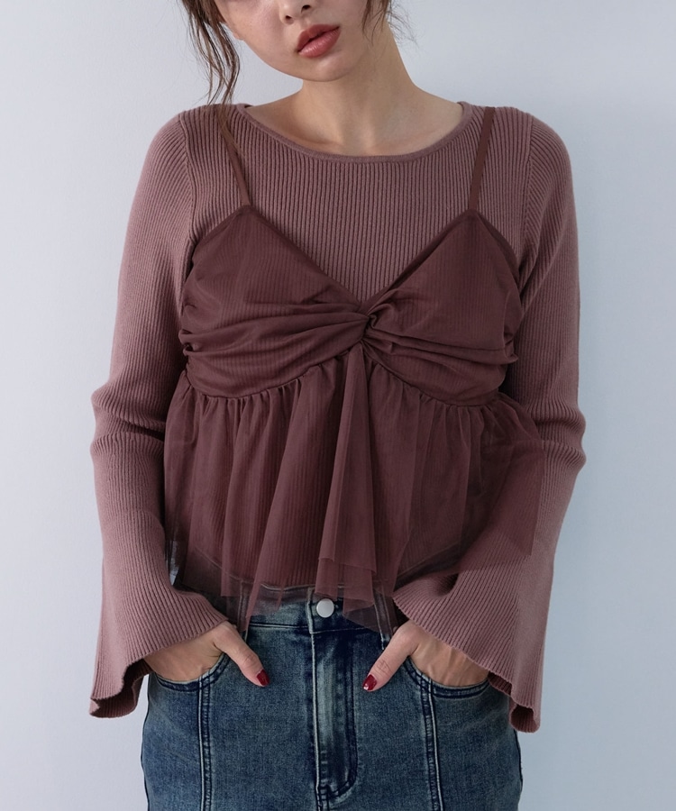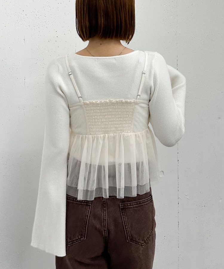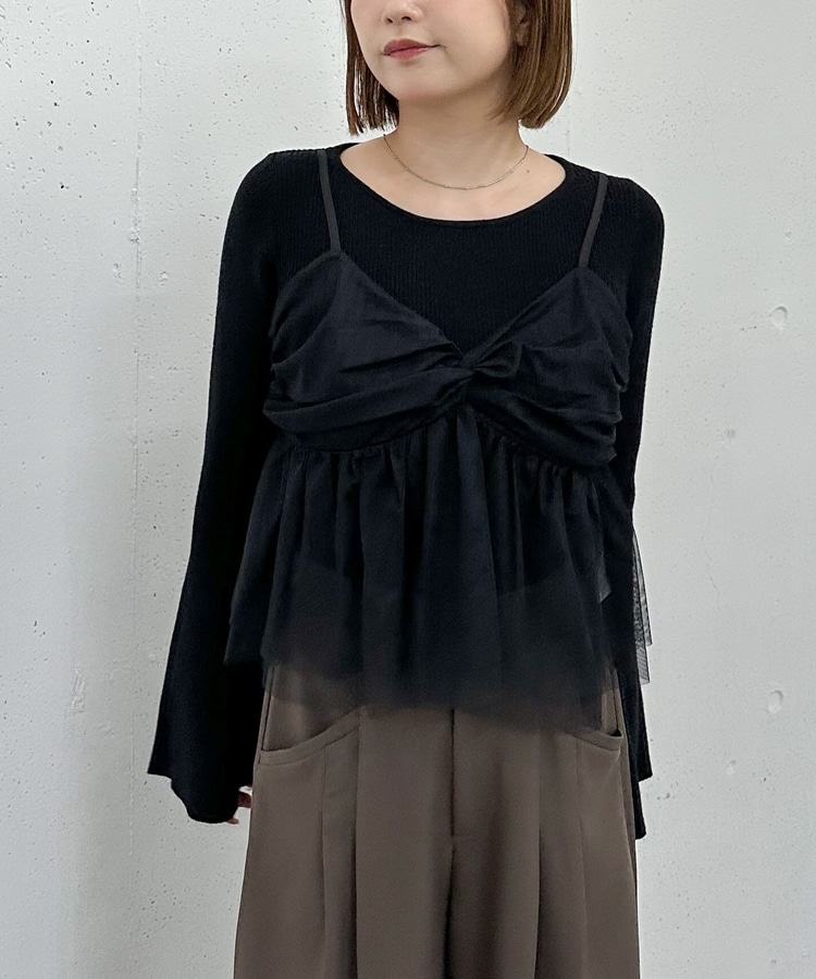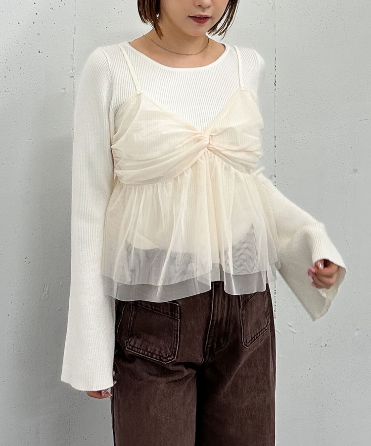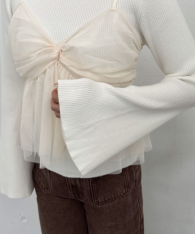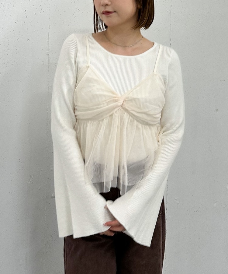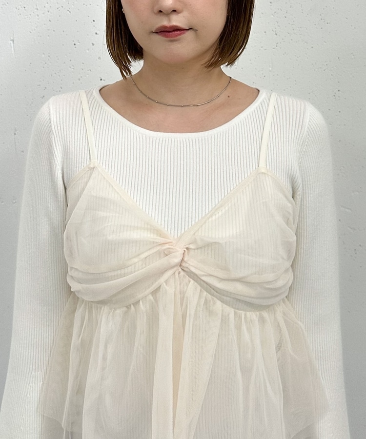 ■一枚でオシャレに着まる■archivesで人気のチュールビスチェにフレアスリーブニットがセットになった着回し力抜群アイテム。胸元のチュールにねじれを加えてボリュームアップ。裾も2枚チュールなのでふんわりとしたボリュームをプラス。透け感がしっかりとあるので柔らかく着て頂けます。セットのニットは着回ししやすいリブニット。袖がフレアになっているので女性らしさもアップ。デザイン性の高いアイテムなのでデニムやスラックスなどとシンプルにスタイリングするのがおススメです。ーーーーーーーーーーーーーーー透け感:チュニックあり/ニットなし裏地:なし伸縮性:あり光沢感:なし生地厚さ:普通洗濯方法:手洗い可※詳しいお手入れ方法は商品についているタグをご覧くださいーーーーーーーーーーーーーーー※ご利用のモニター環境により、実際の色味と多少異なる場合がございます。