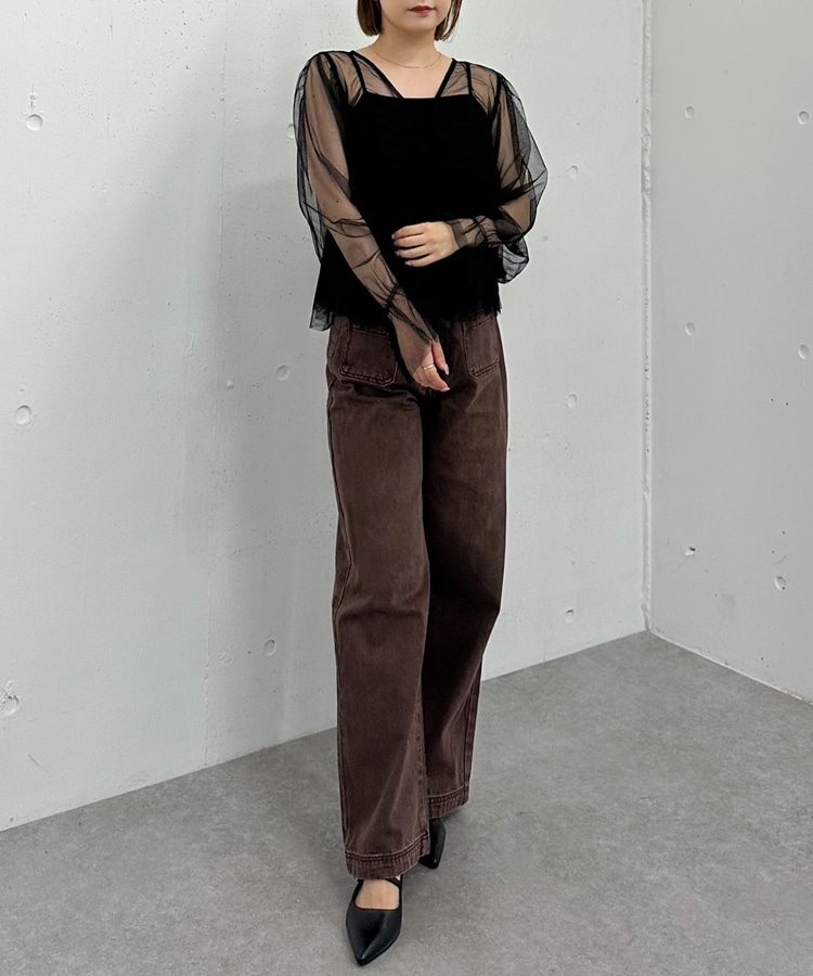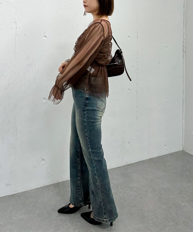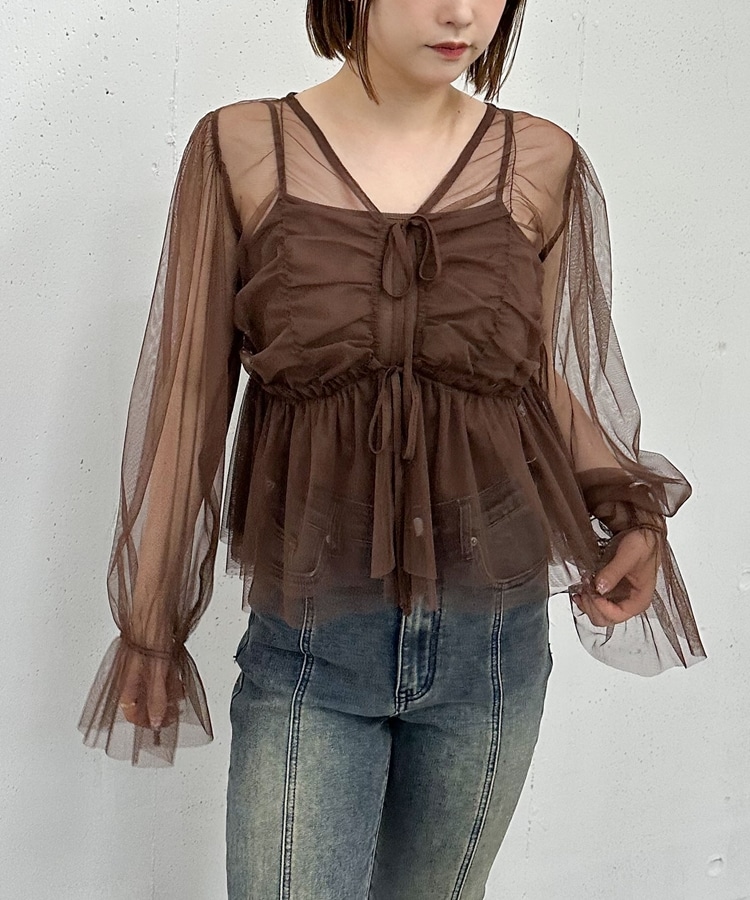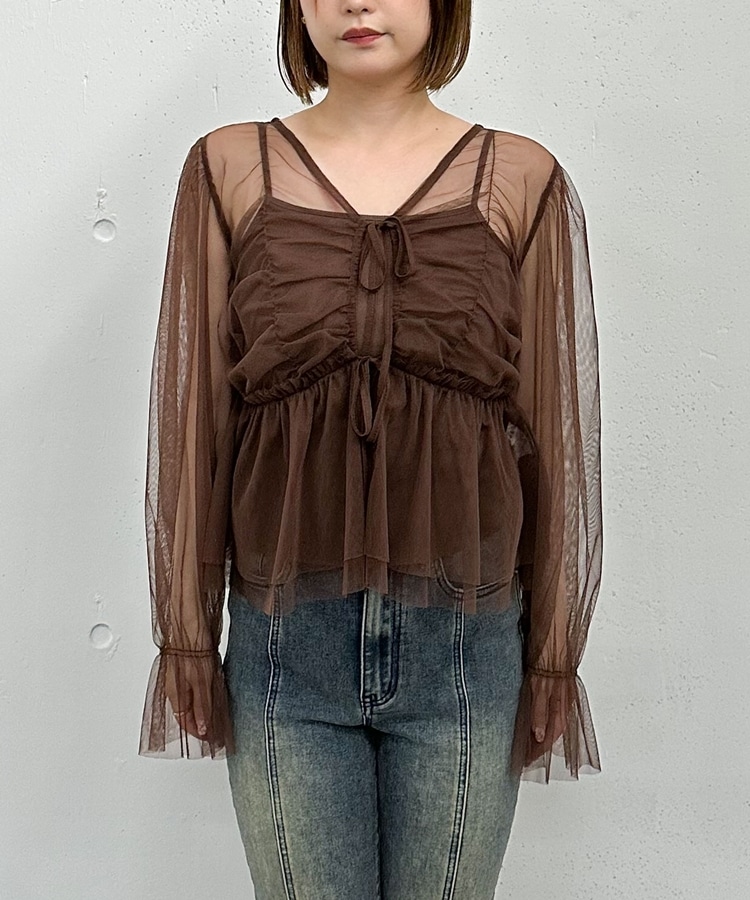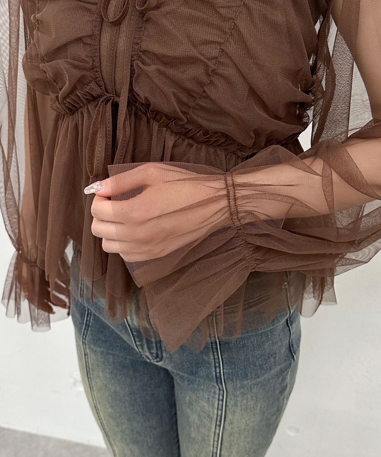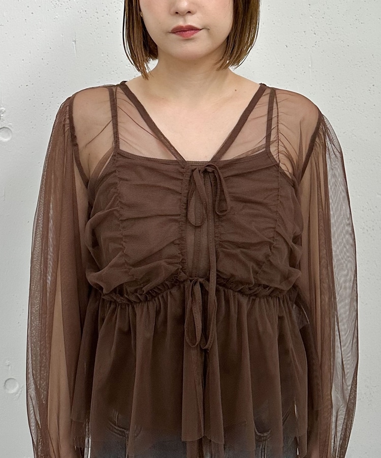 チュールギャザーペプラムブラウス BROWN