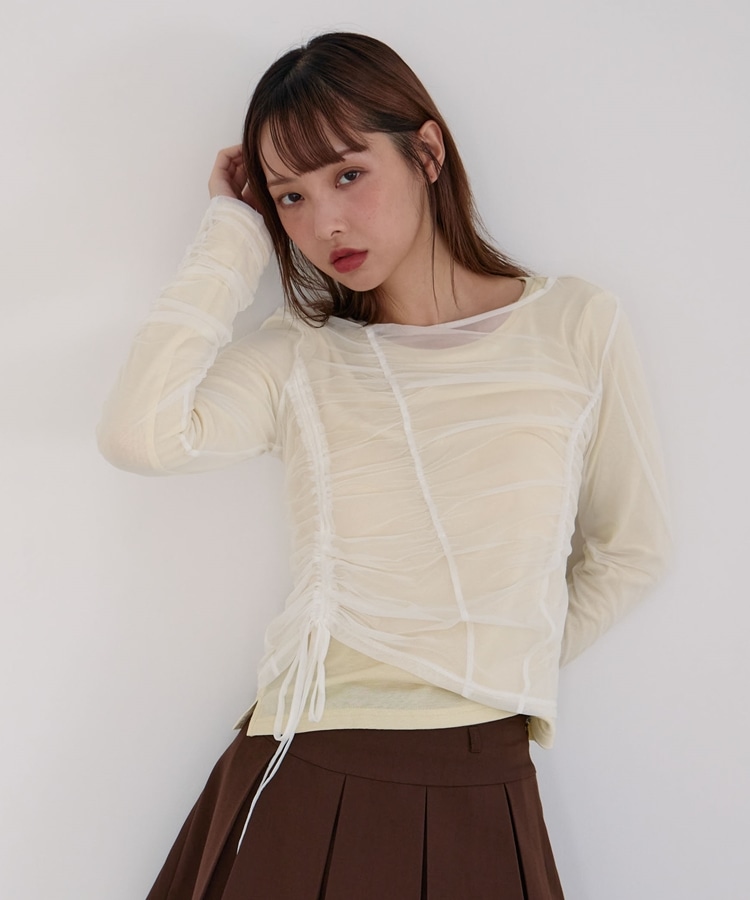 チュールトップスは斜めのドロストギャザーが立体感&くびれラインを演出。