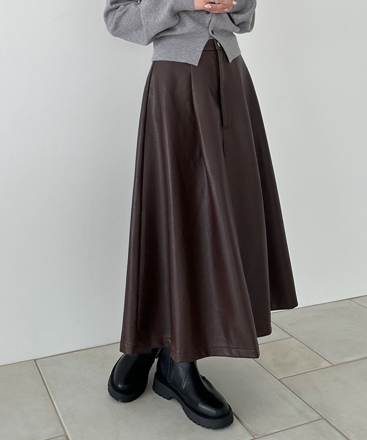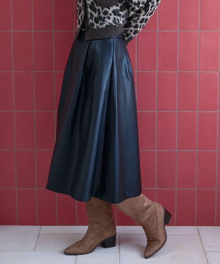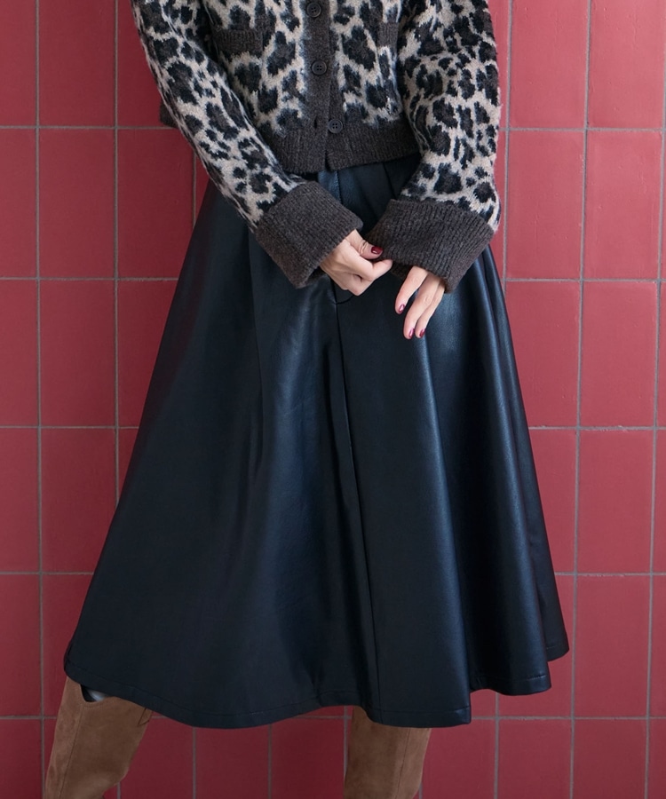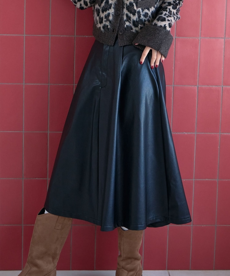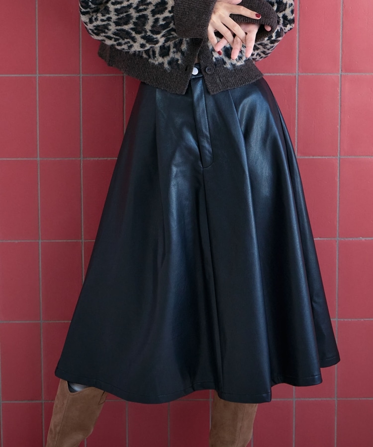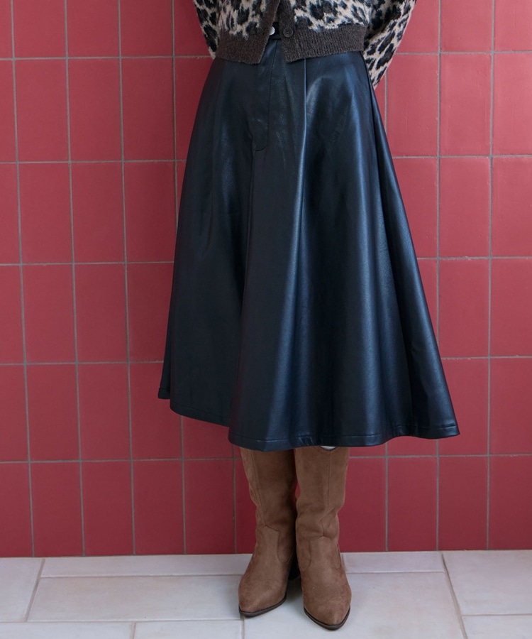 軽やかなフェイクレザー素材が特徴のフレアミディスカート。