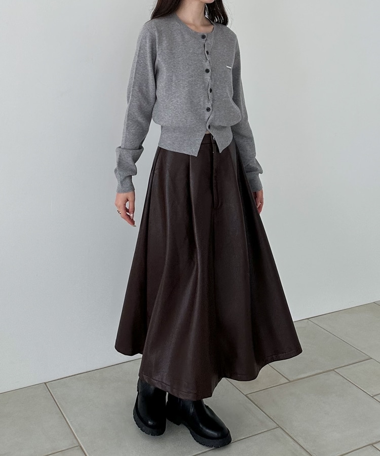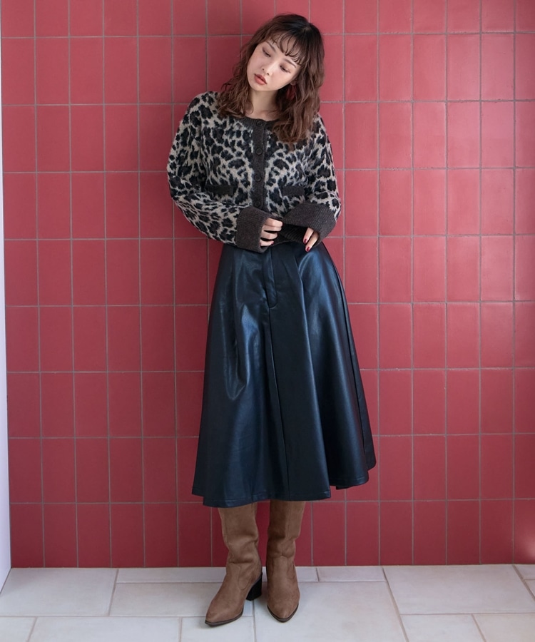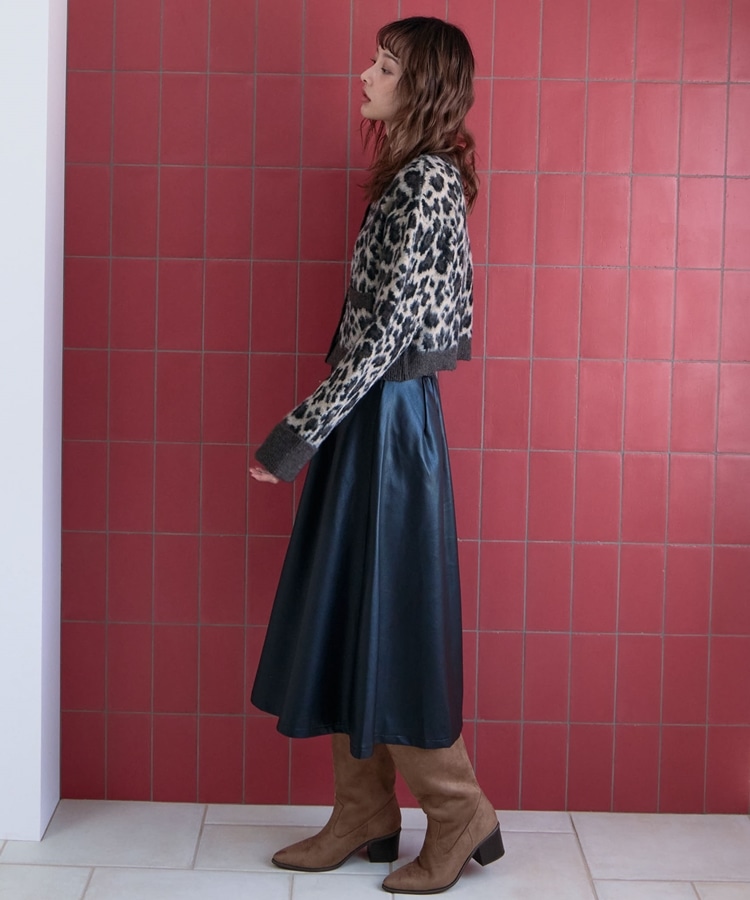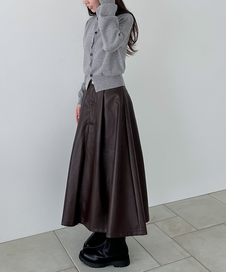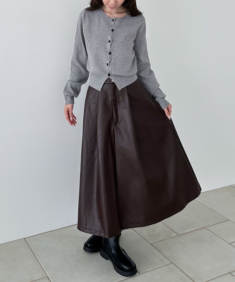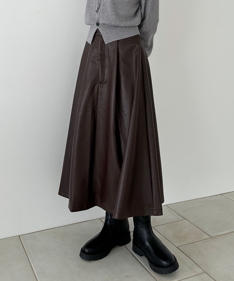 軽やかなフェイクレザー素材が特徴のフレアミディスカート。