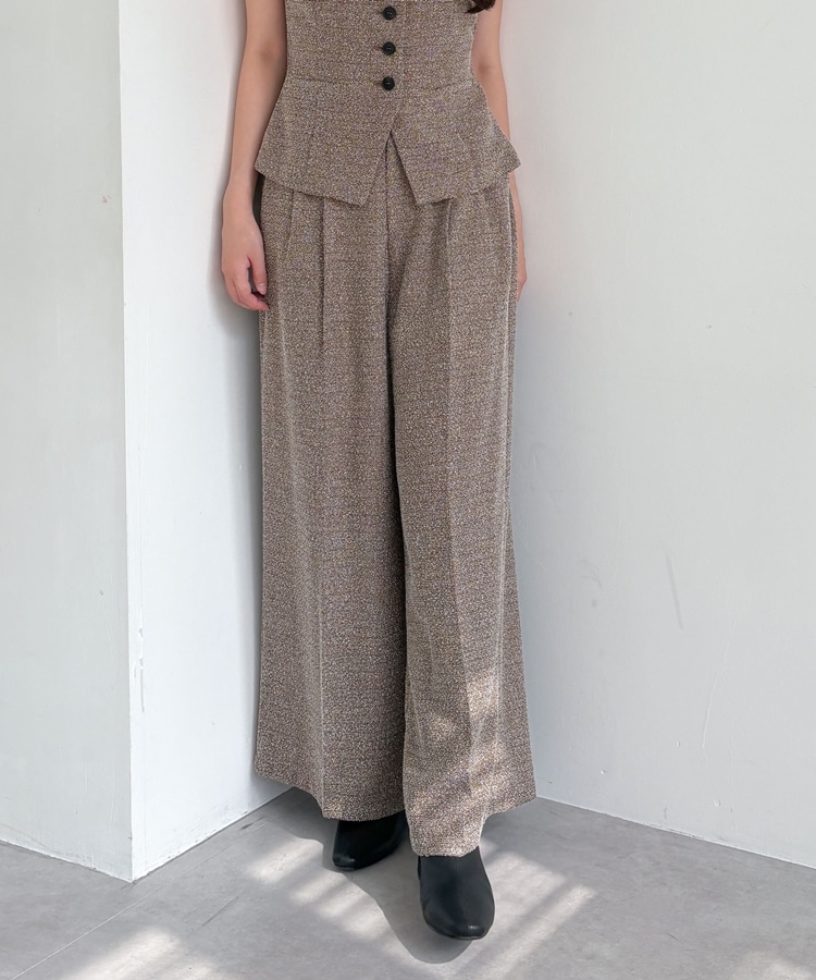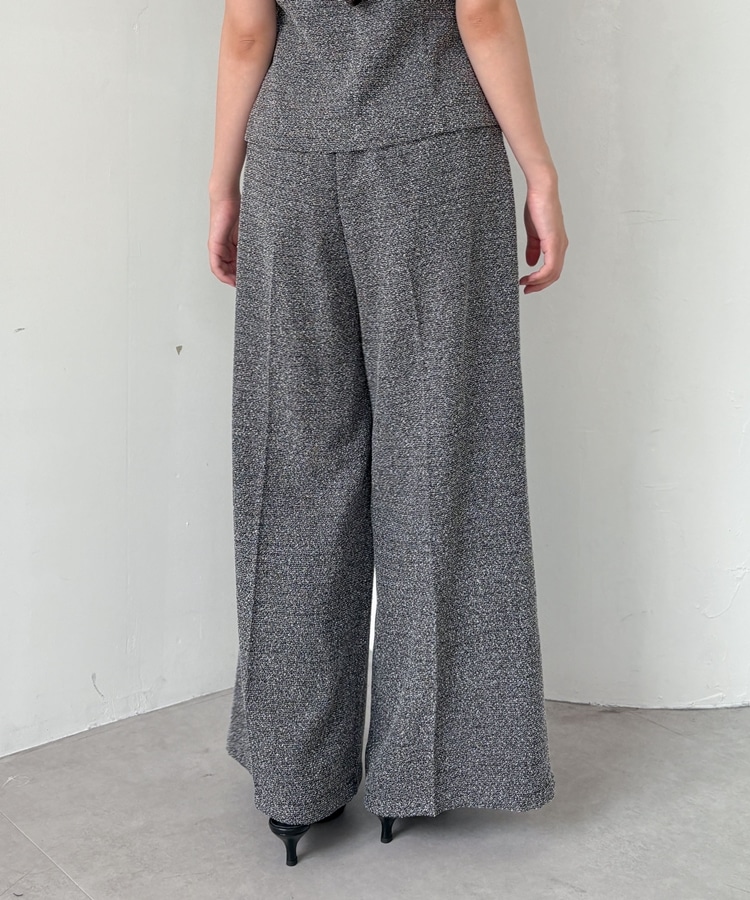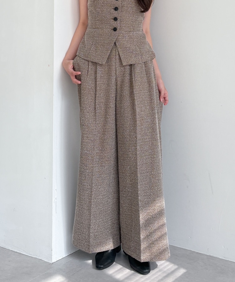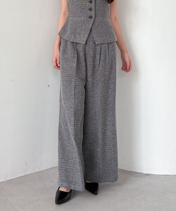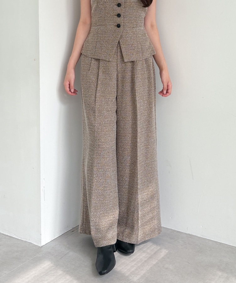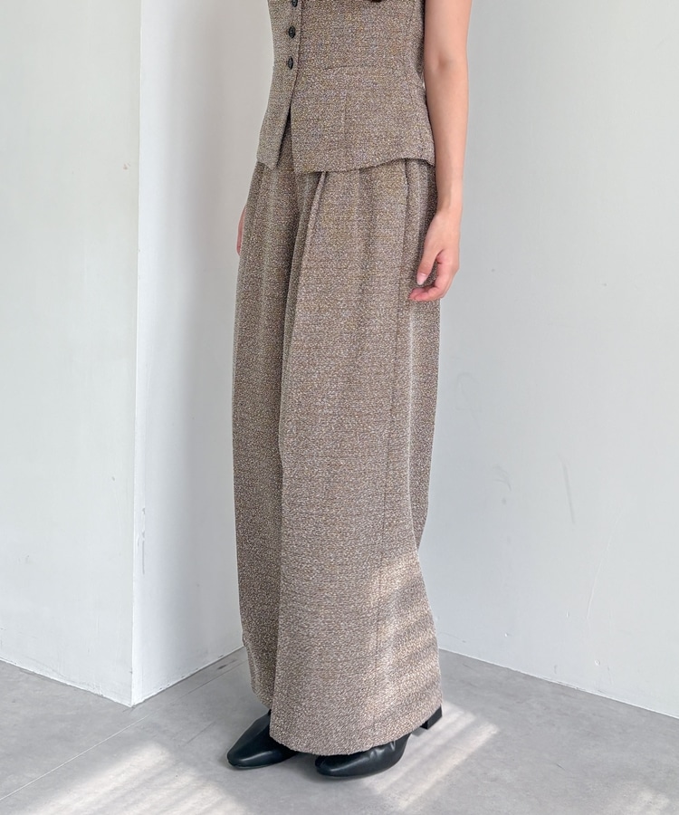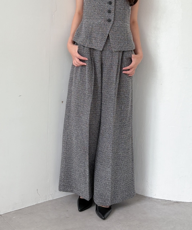 ■秋に穿きたくなるツイード■秋らしいツイードパンツ。穿くだけで一気に秋らしくスタイリングしてくれます。柔らかい生地感のツイード。きっちりと見えがちなツイードもカジュアルに穿きこなせます。シルエットはゆとりのあるワイドシルエット。脚の形を拾わずに穿いて頂けます。同素材のトップスとセットアップとしても可愛く着こなせます。ーーーーーーーーーーーーーーー透け感:なし裏地:あり伸縮性:あり光沢感:なし生地厚さ:普通洗濯方法:洗濯可※詳しいお手入れ方法は商品についているタグをご覧くださいーーーーーーーーーーーーーーー※ご利用のモニター環境により、実際の色味と多少異なる場合がございます。