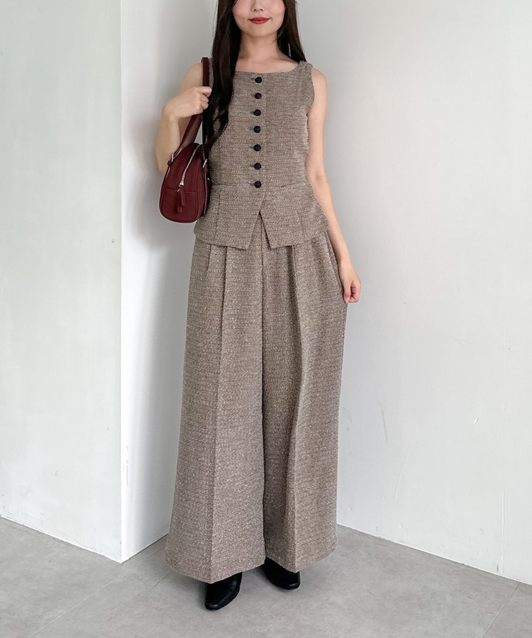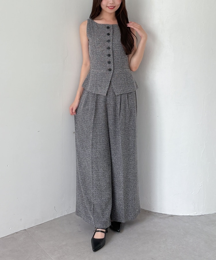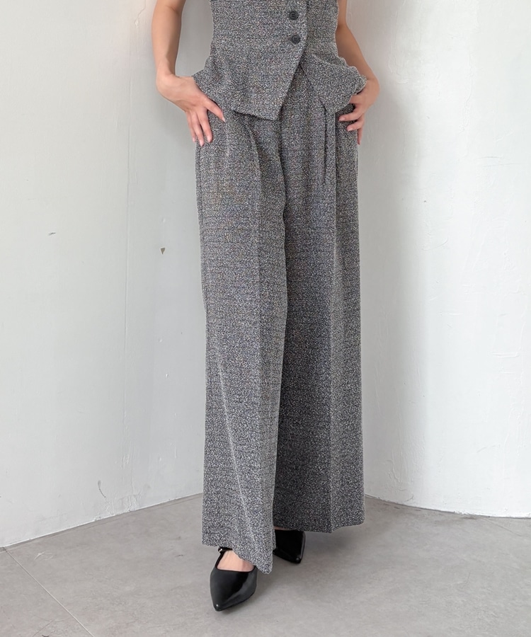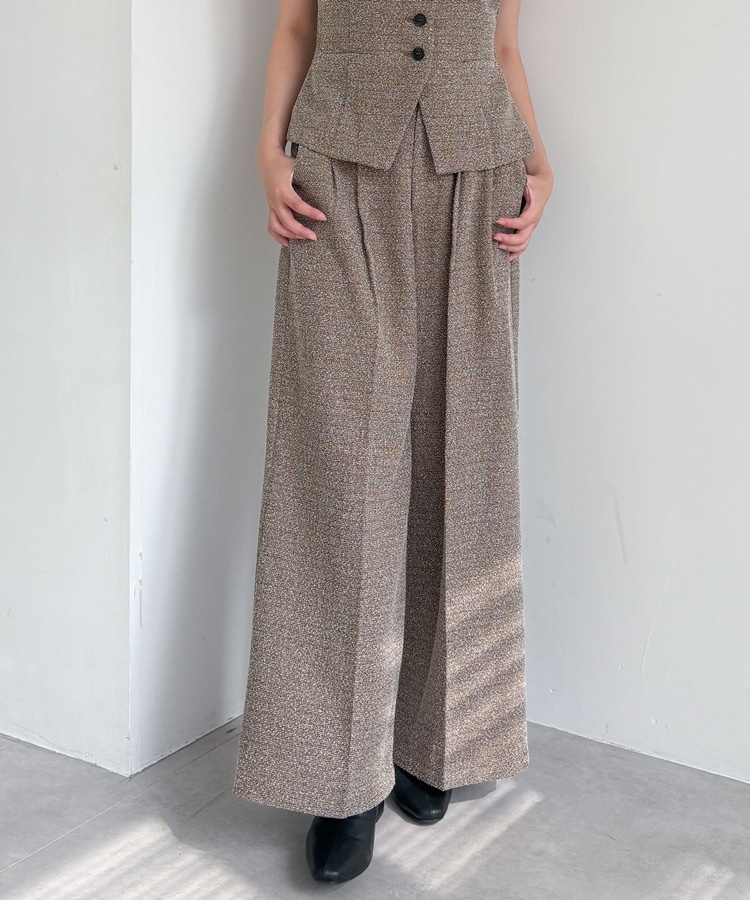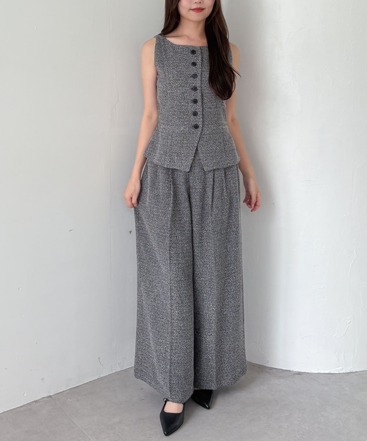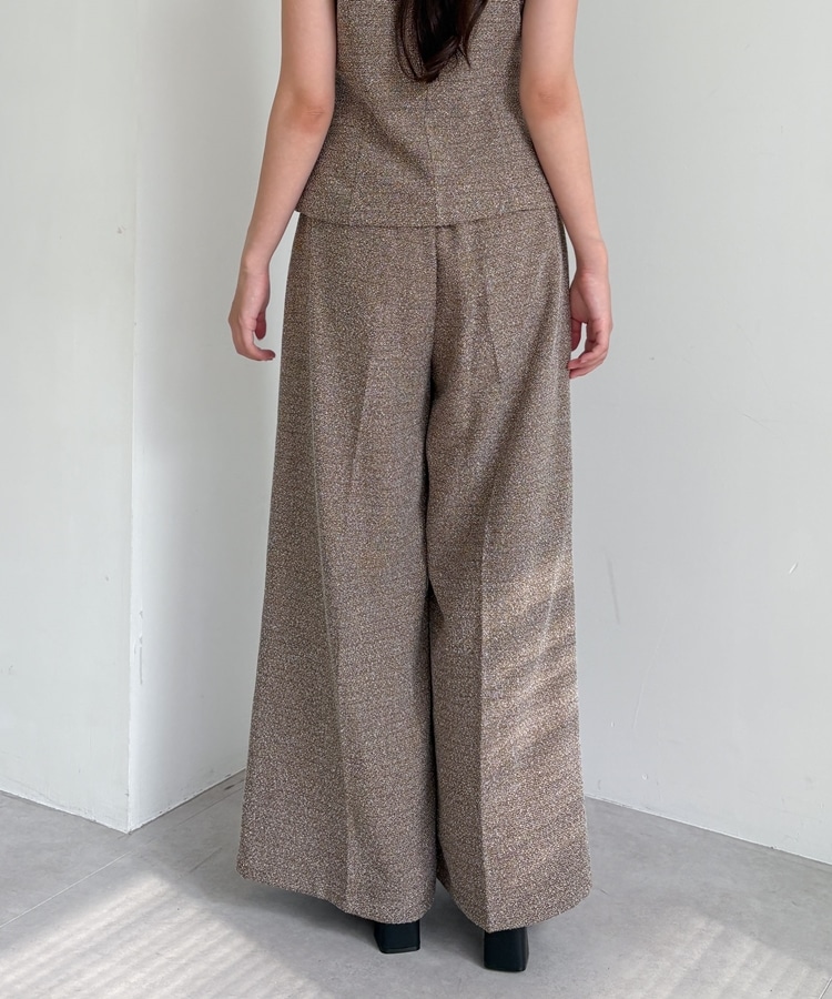 ■秋に穿きたくなるツイード■秋らしいツイードパンツ。穿くだけで一気に秋らしくスタイリングしてくれます。柔らかい生地感のツイード。きっちりと見えがちなツイードもカジュアルに穿きこなせます。シルエットはゆとりのあるワイドシルエット。脚の形を拾わずに穿いて頂けます。同素材のトップスとセットアップとしても可愛く着こなせます。ーーーーーーーーーーーーーーー透け感:なし裏地:あり伸縮性:あり光沢感:なし生地厚さ:普通洗濯方法:洗濯可※詳しいお手入れ方法は商品についているタグをご覧くださいーーーーーーーーーーーーーーー※ご利用のモニター環境により、実際の色味と多少異なる場合がございます。