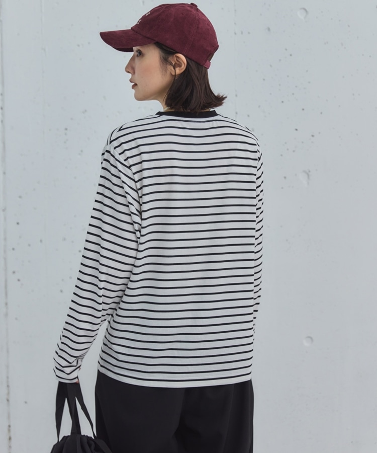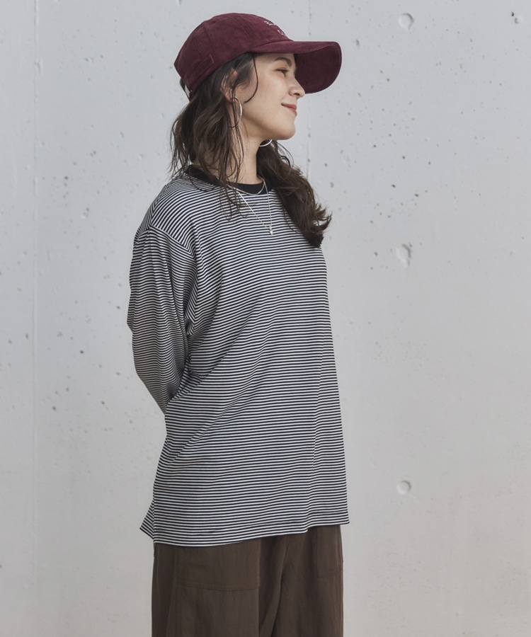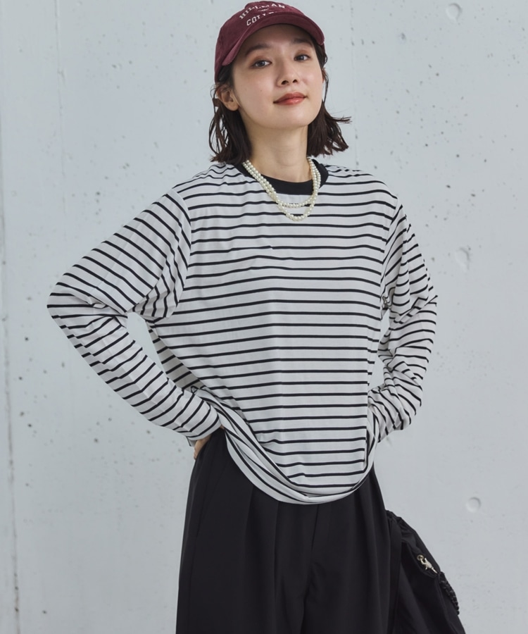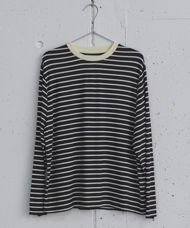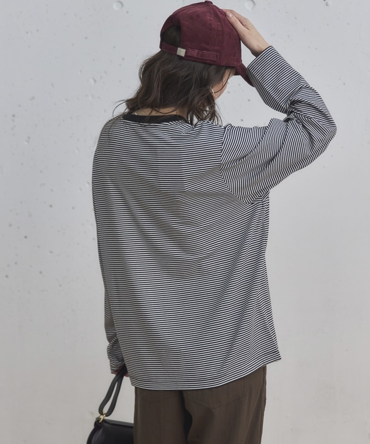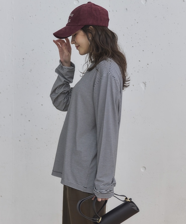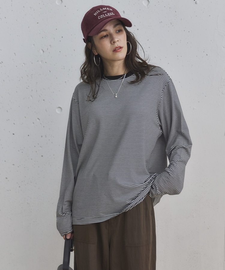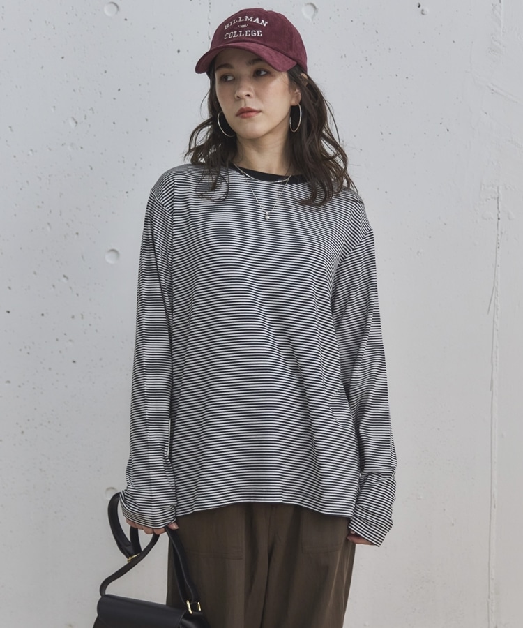 細目のボーダーが合わせやすいシンプルなTシャツ