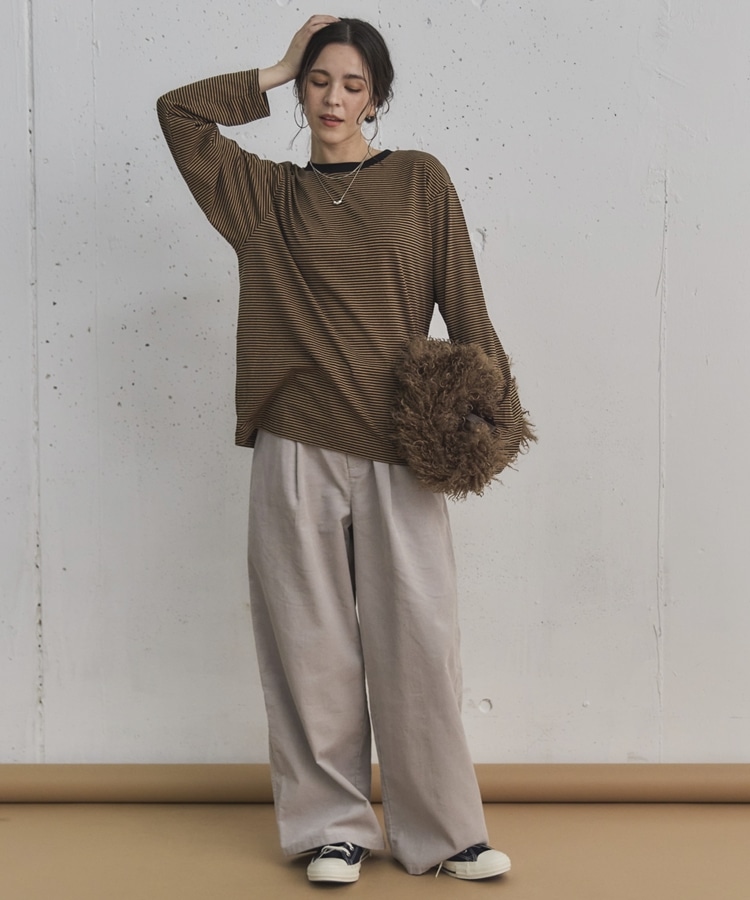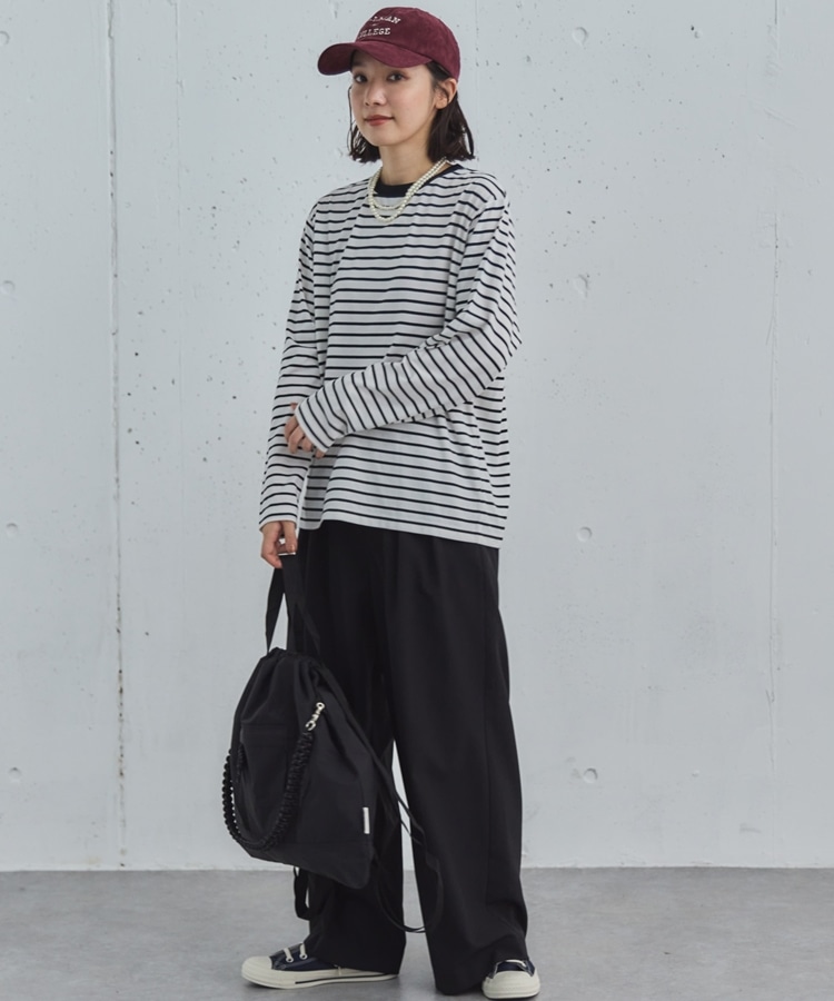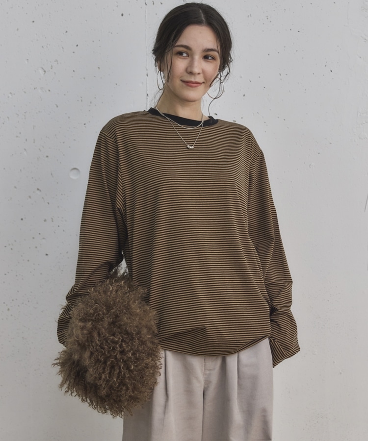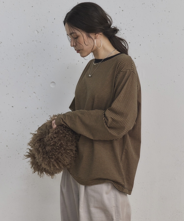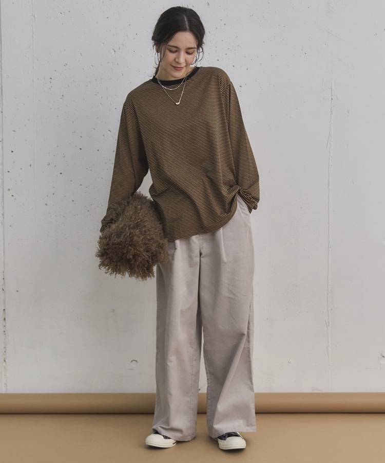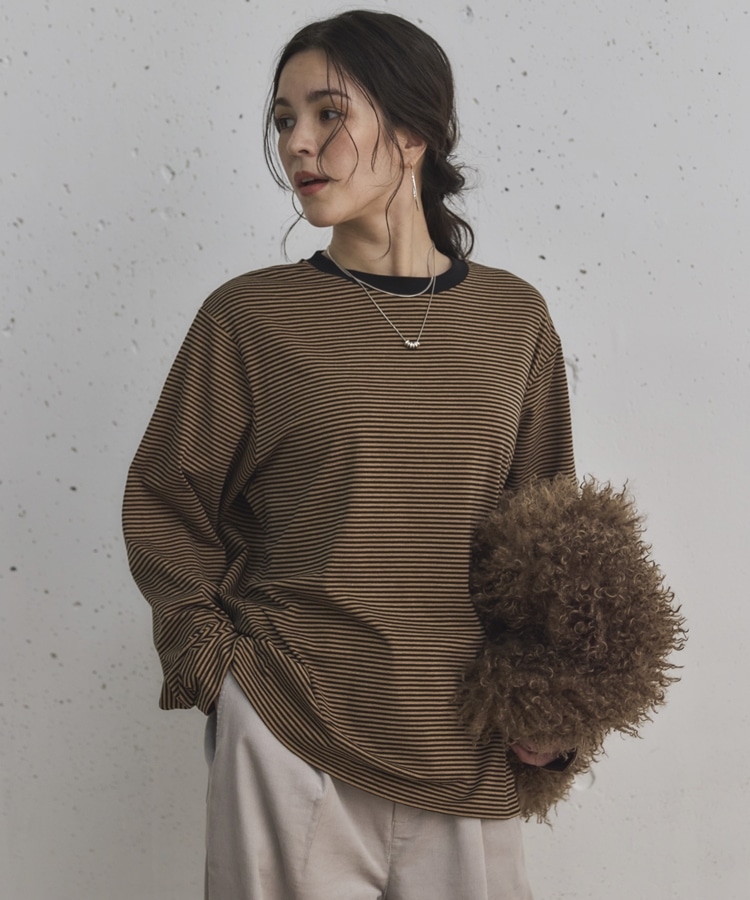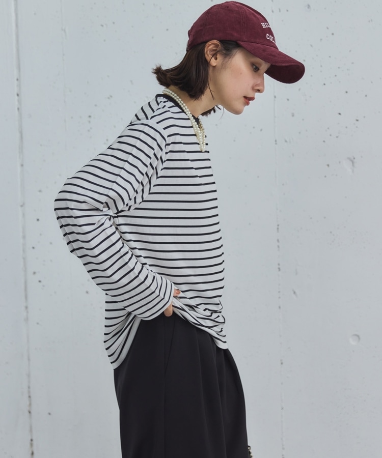 細目のボーダーが合わせやすいシンプルなTシャツ