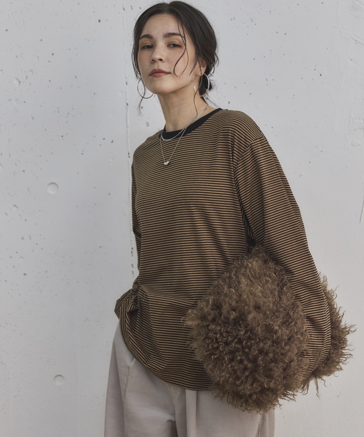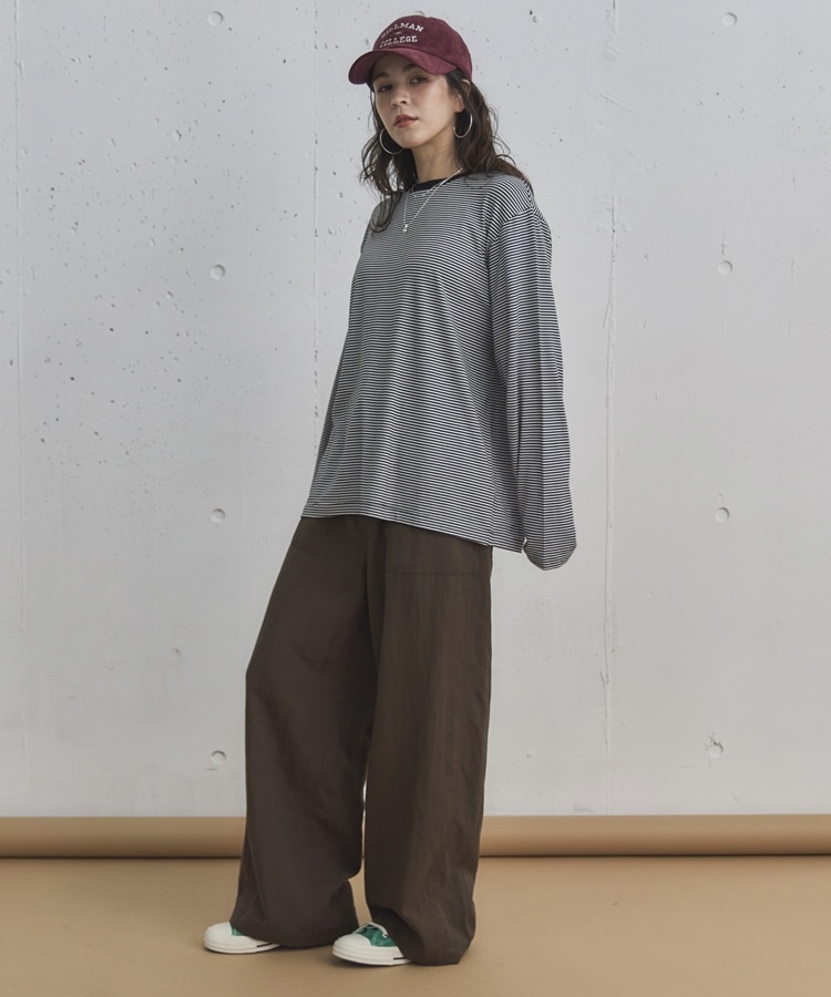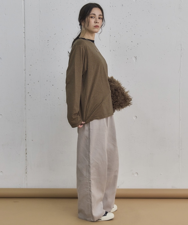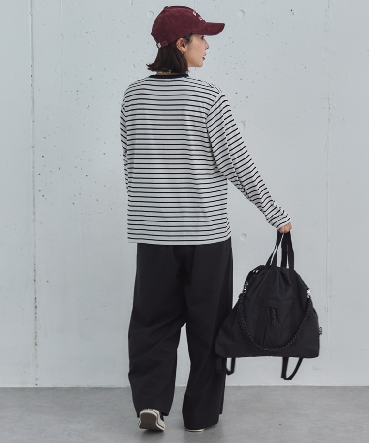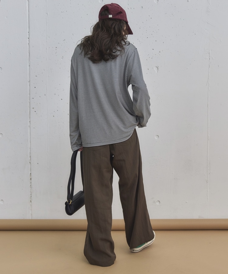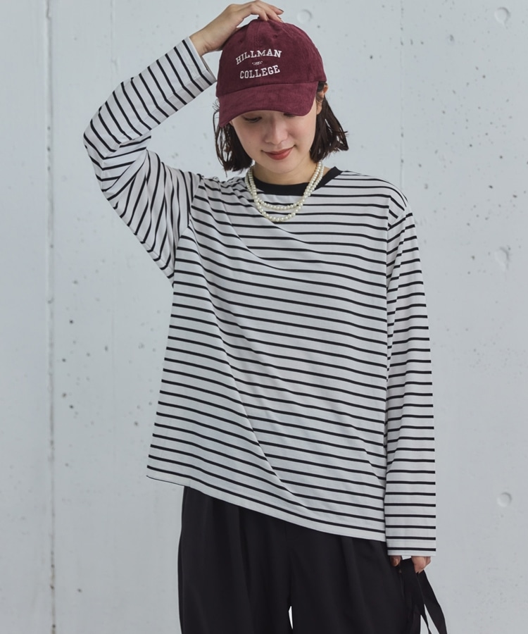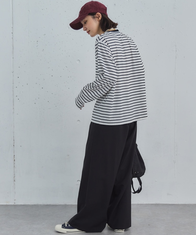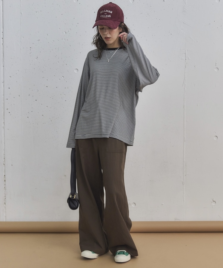 細目のボーダーが合わせやすいシンプルなTシャツ