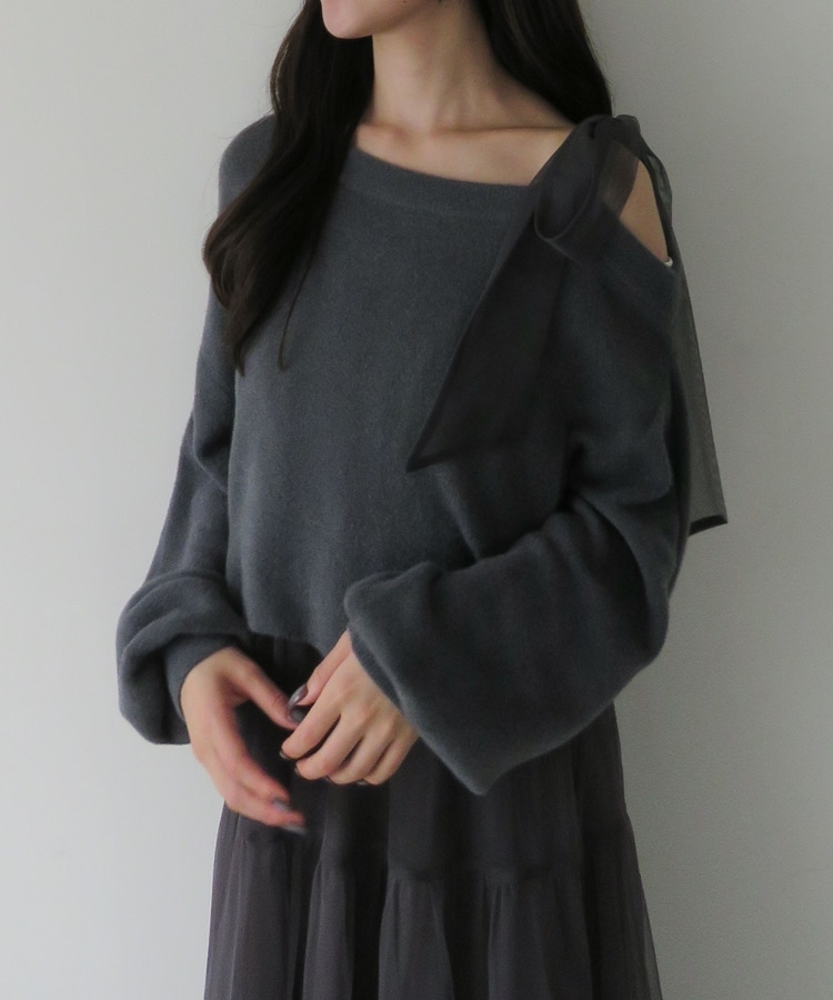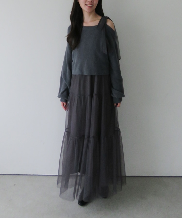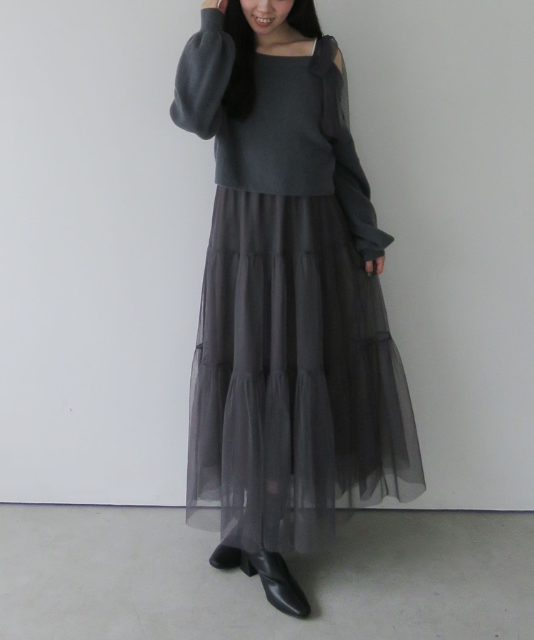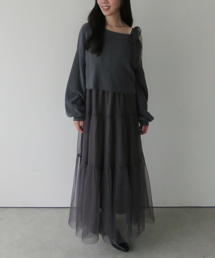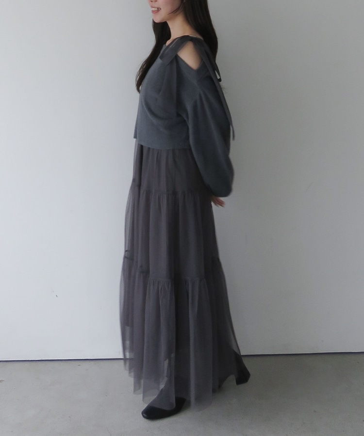 肩リボンニットプルオーバー×チュールキャミワンピースSET GRAY