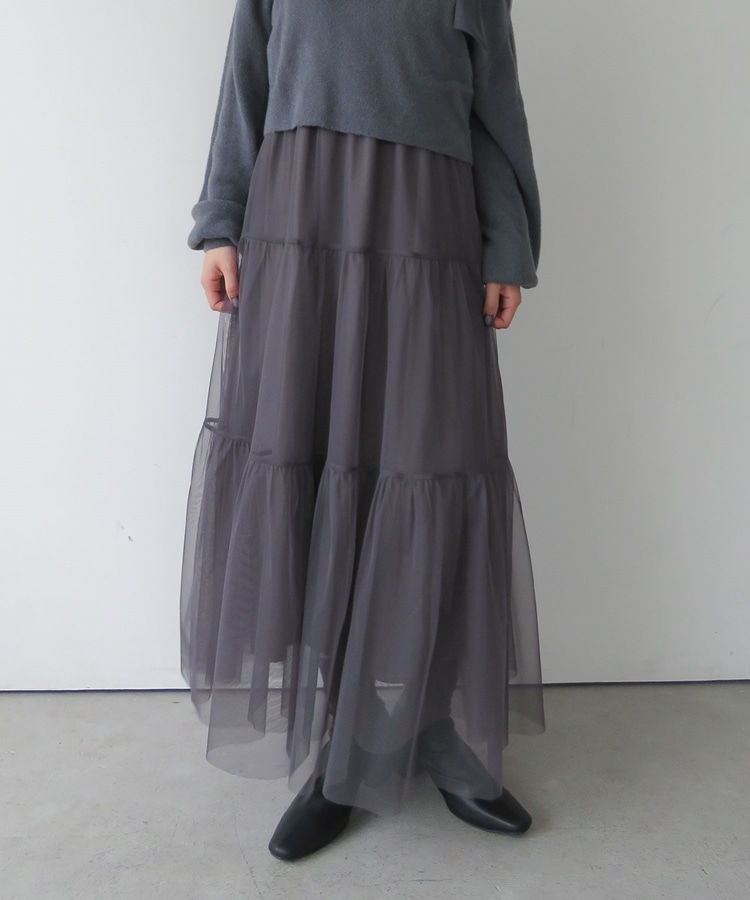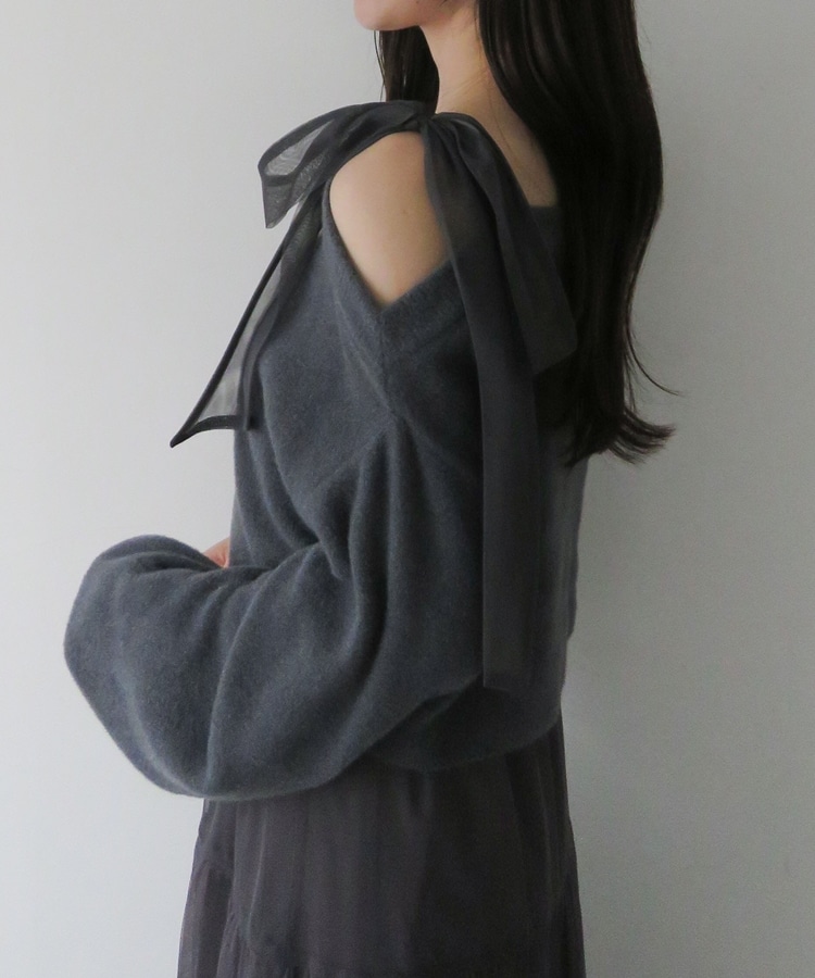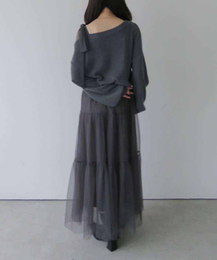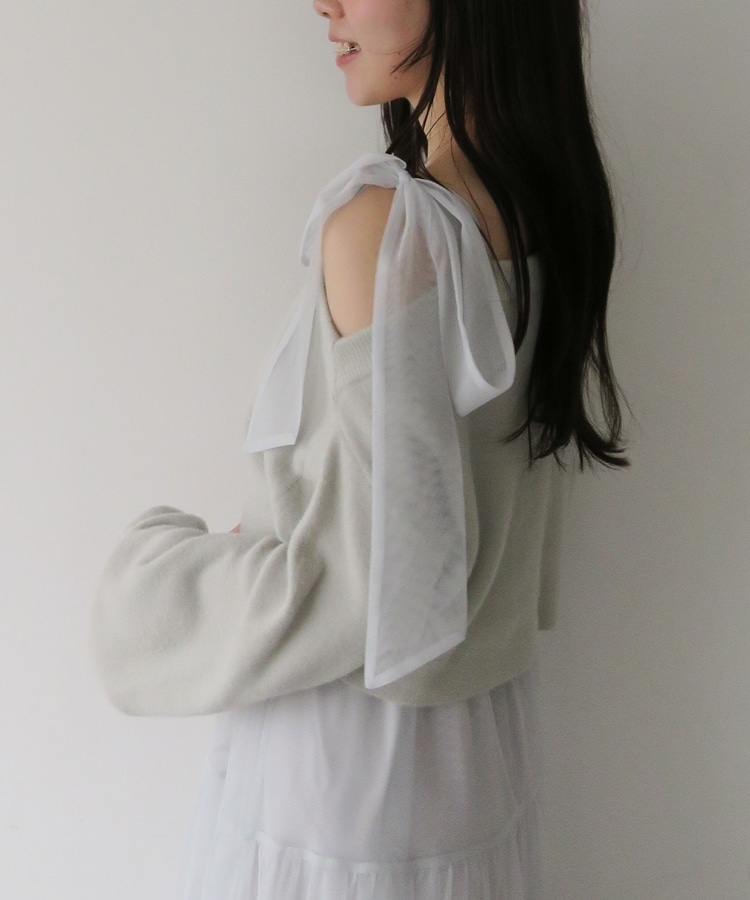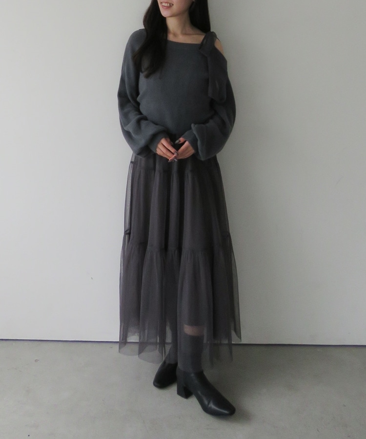 肩リボンニットプルオーバー×チュールキャミワンピースSET GRAY