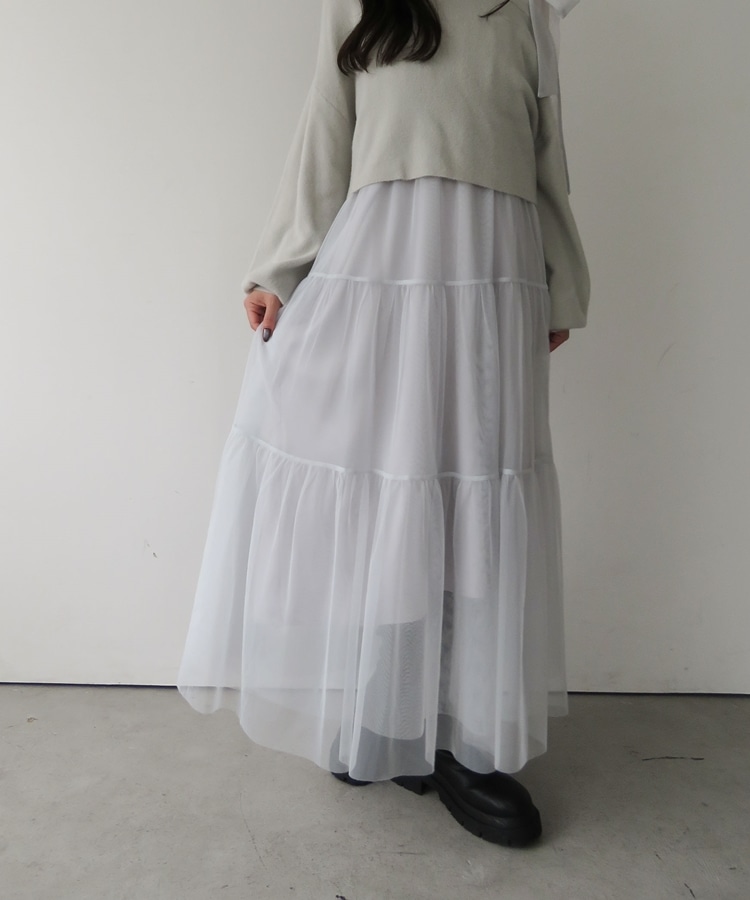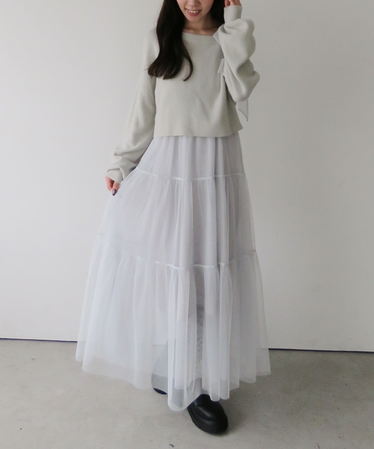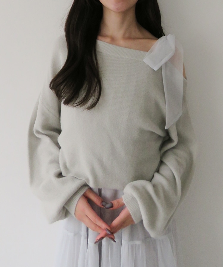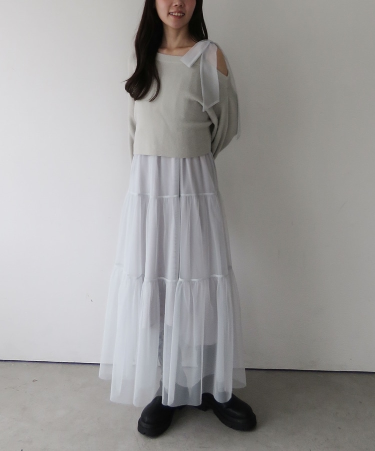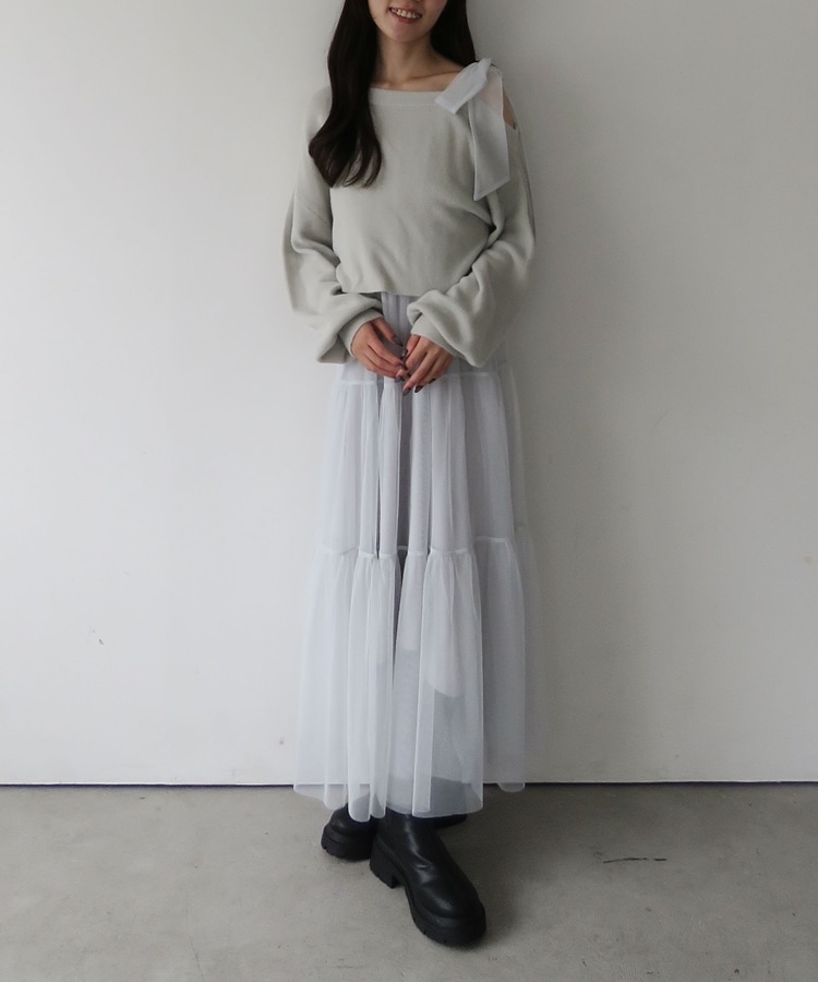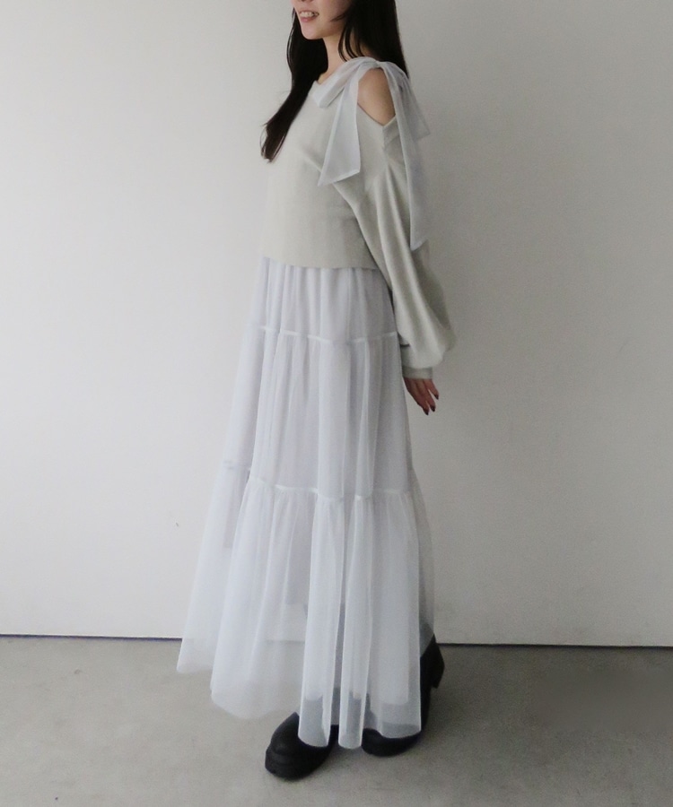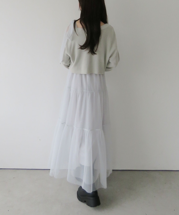 肩リボンニットプルオーバー×チュールキャミワンピースSET SILVER GRAY
