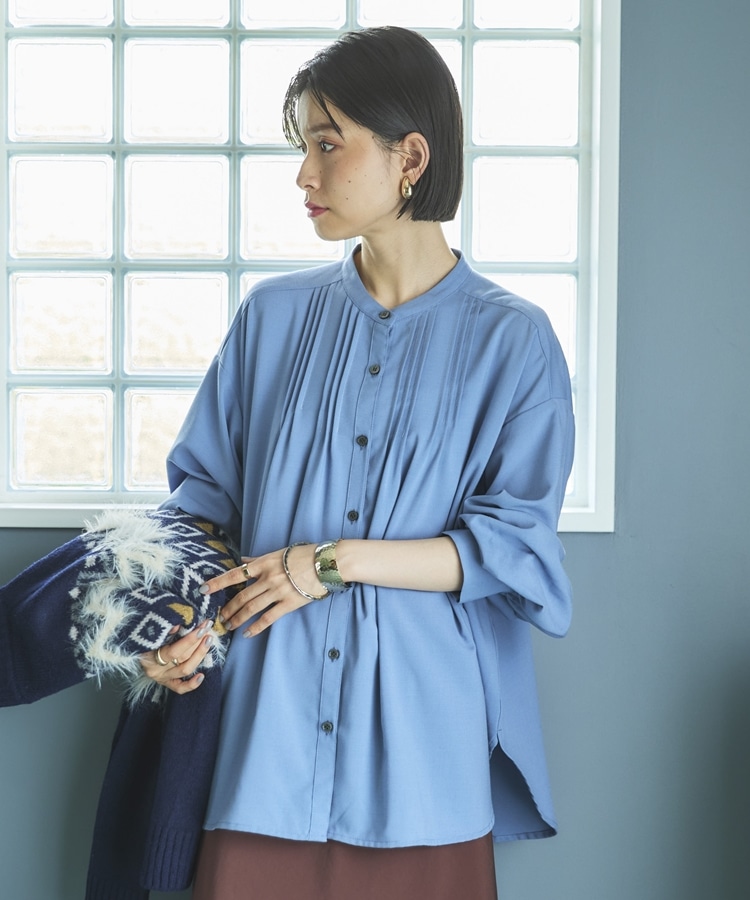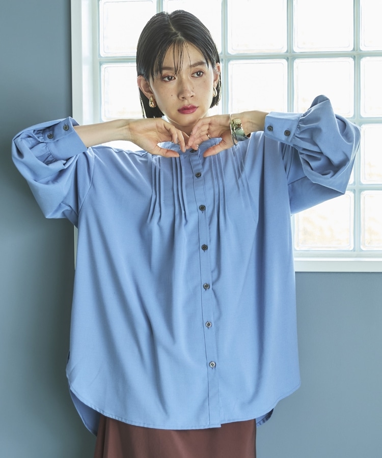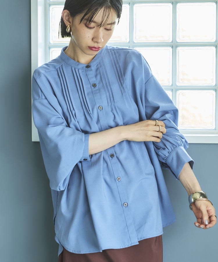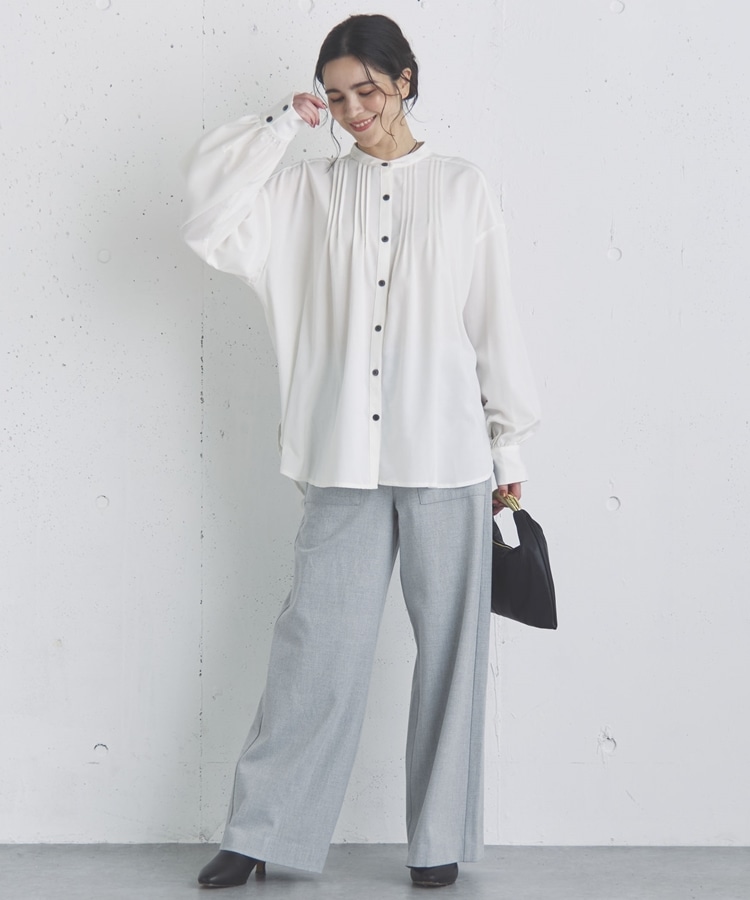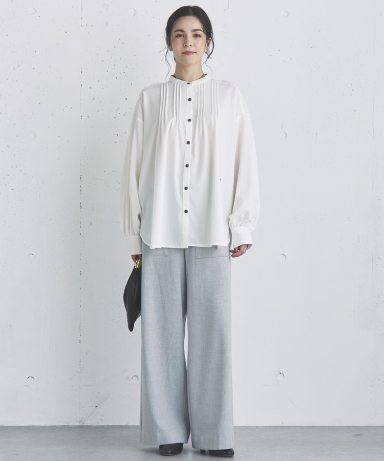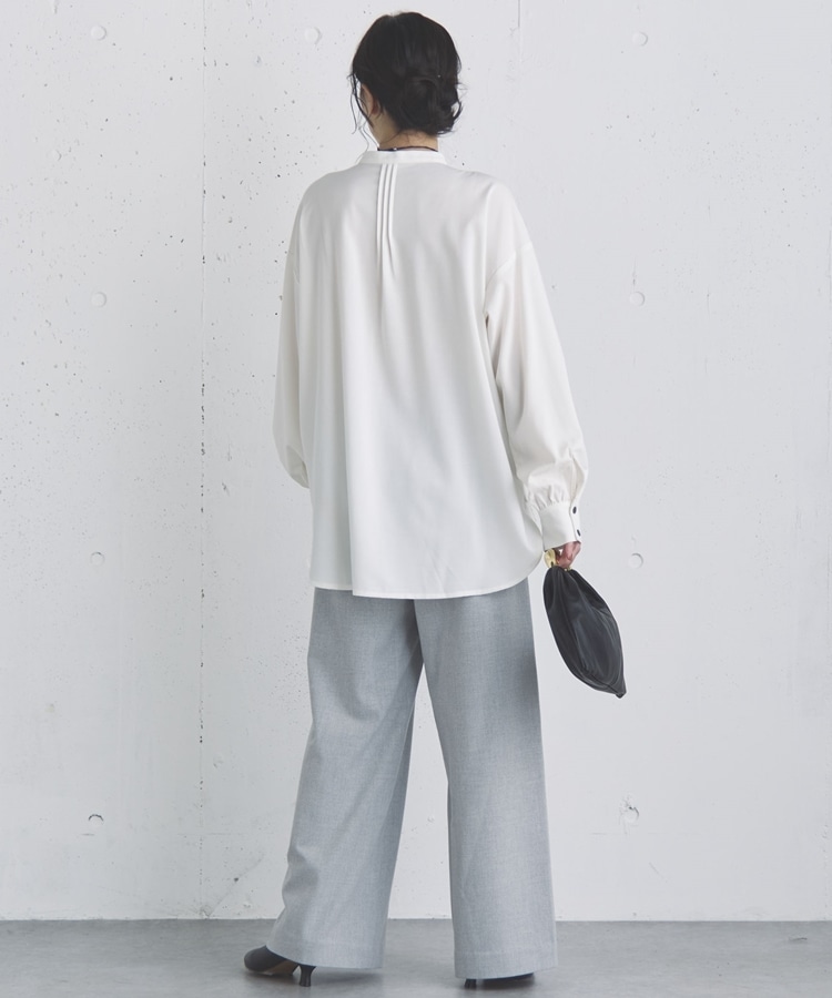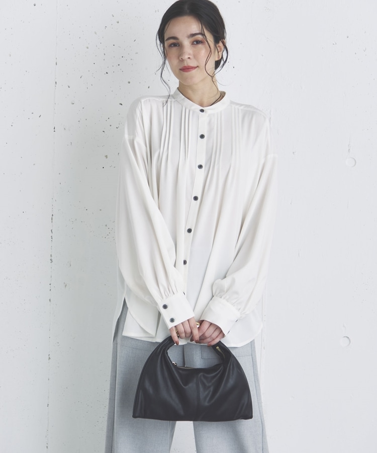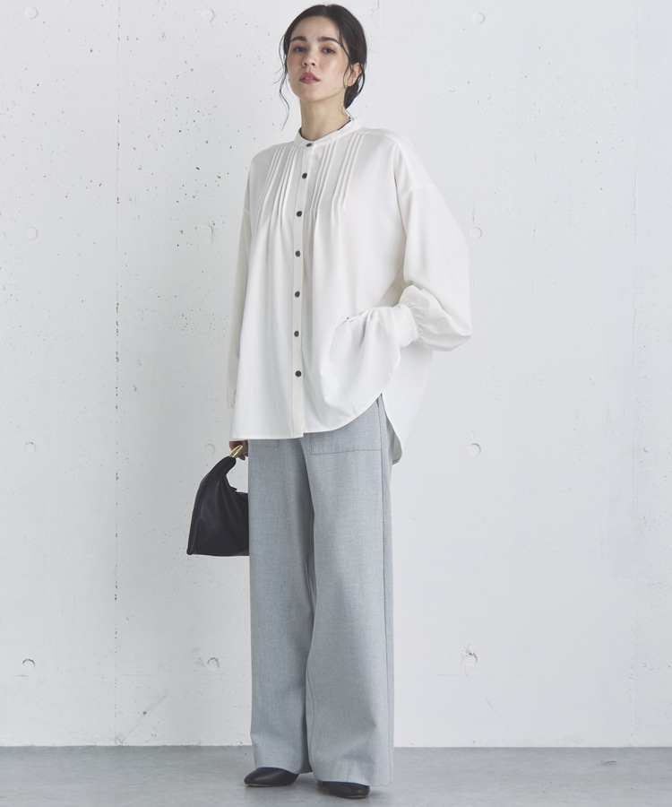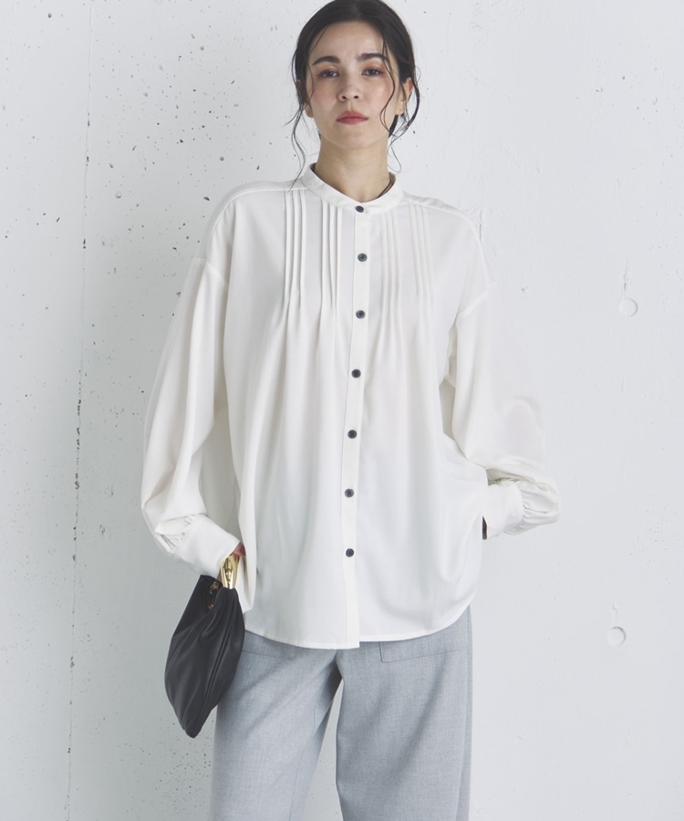 ・ピンタック×ノーカラーがシンプルながらきちんと感を演出
