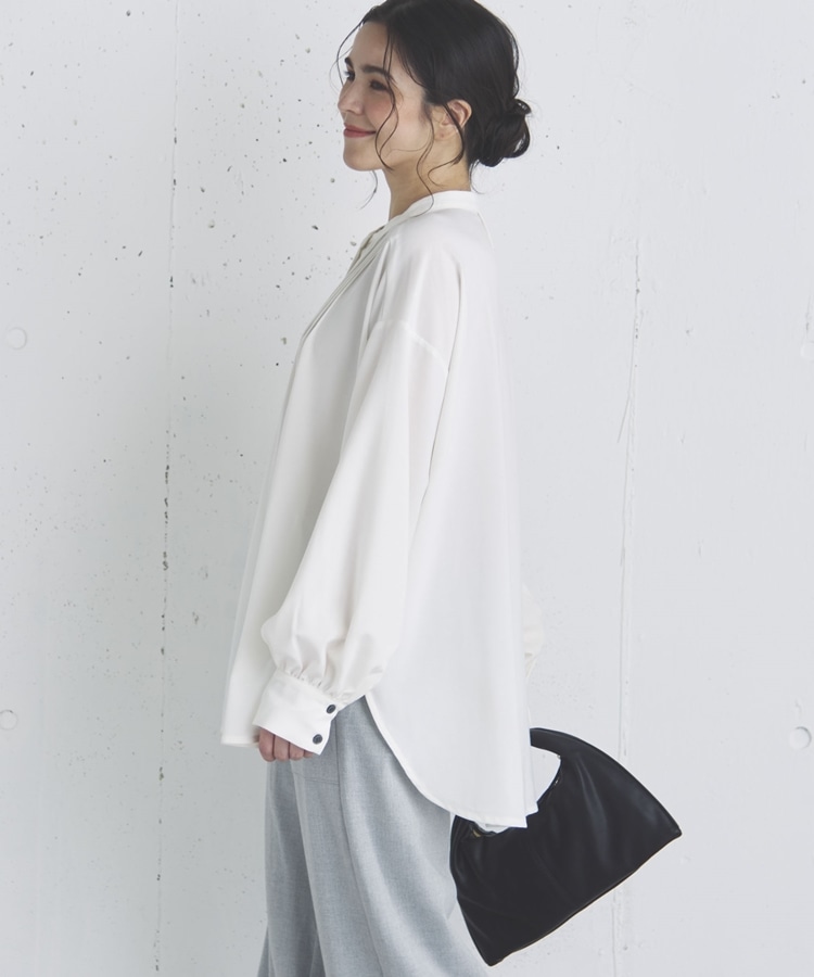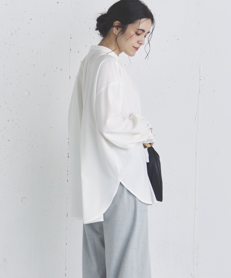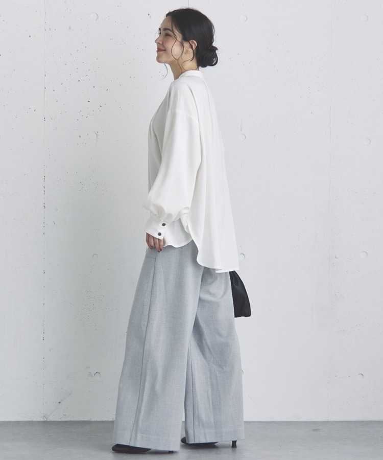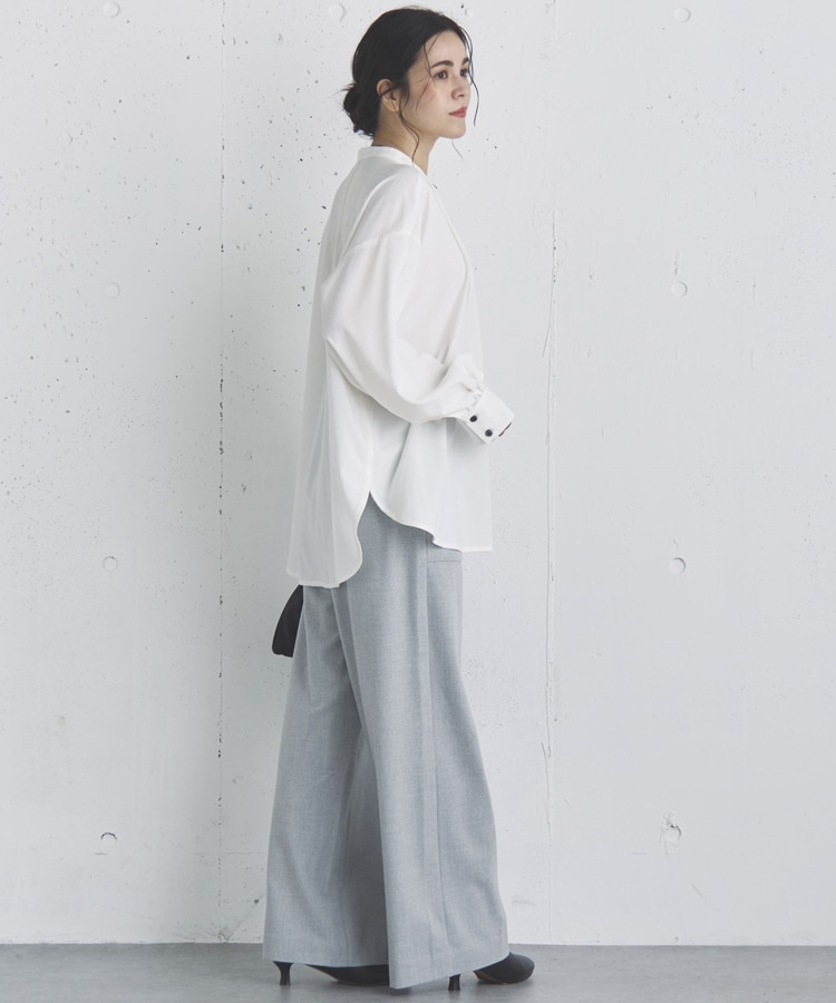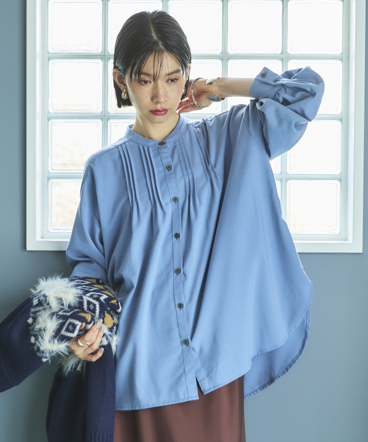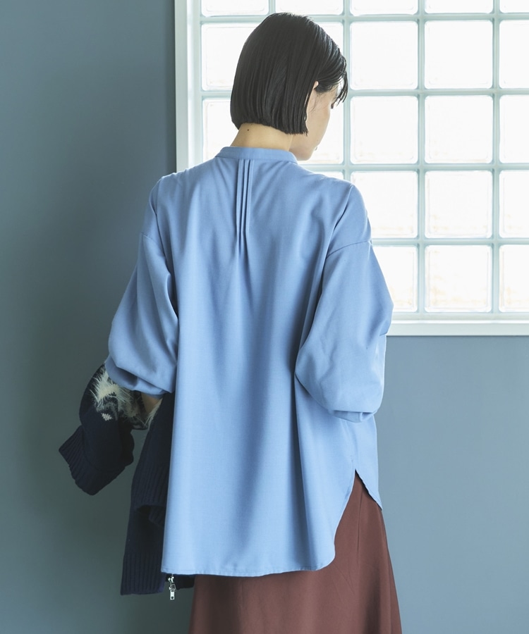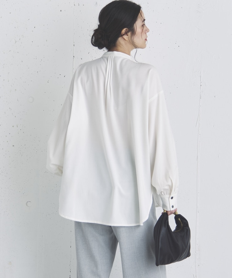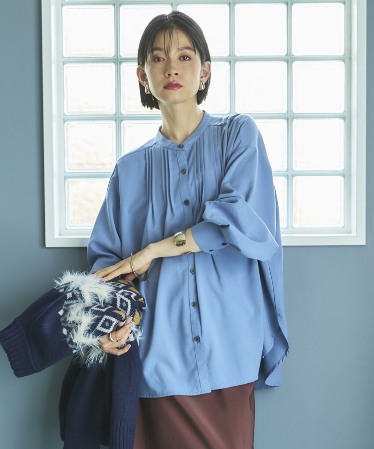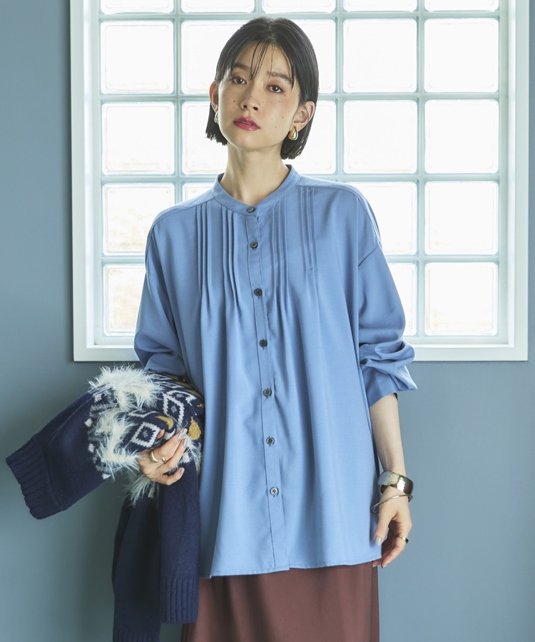 ・ピンタック×ノーカラーがシンプルながらきちんと感を演出