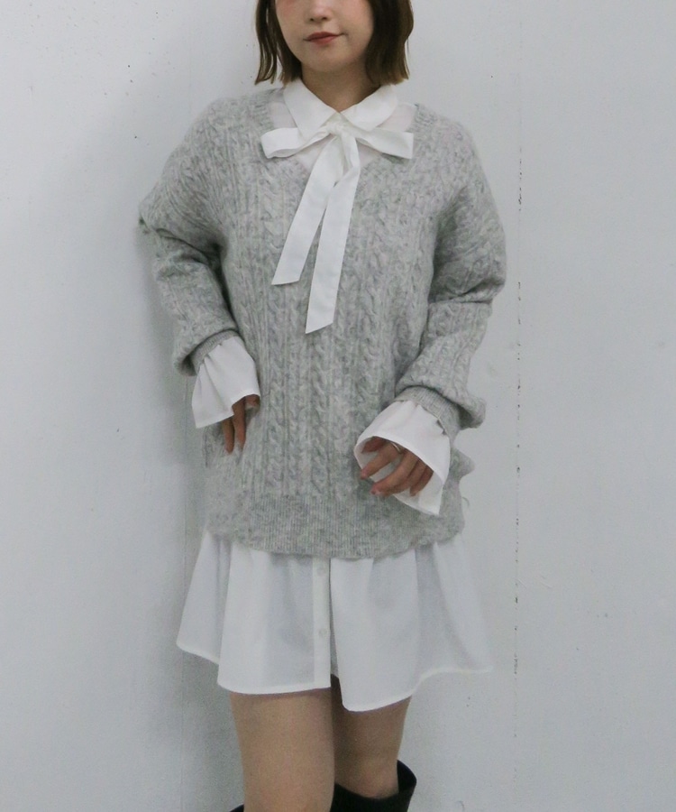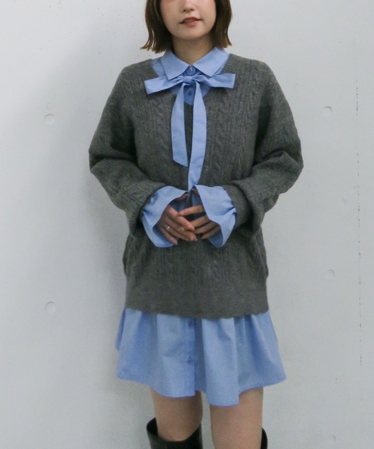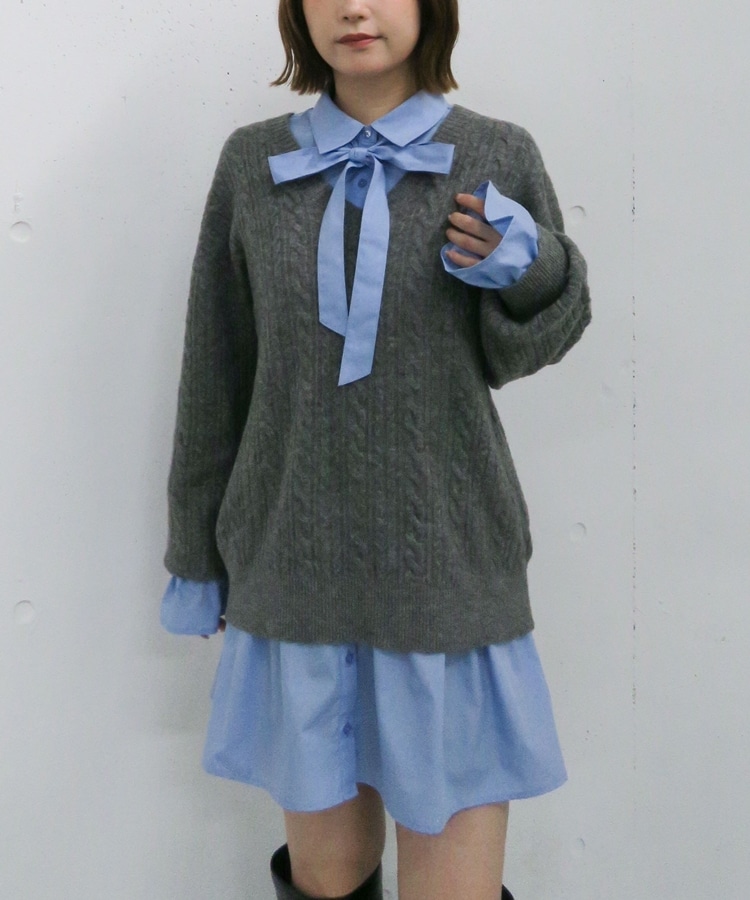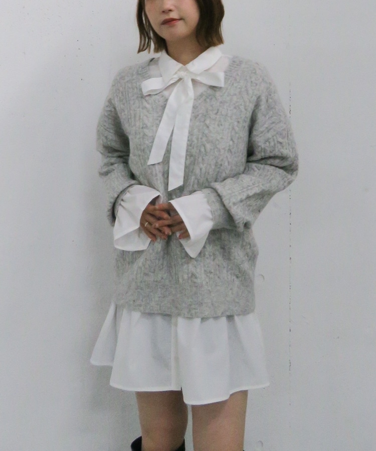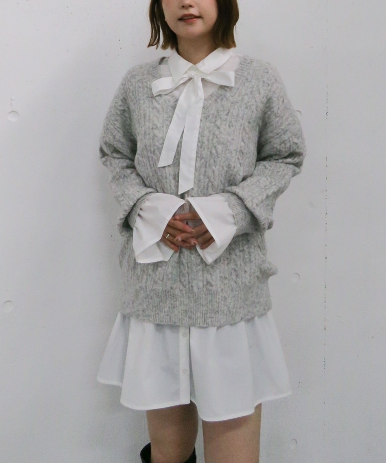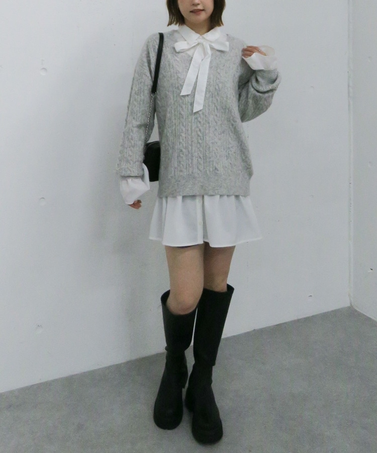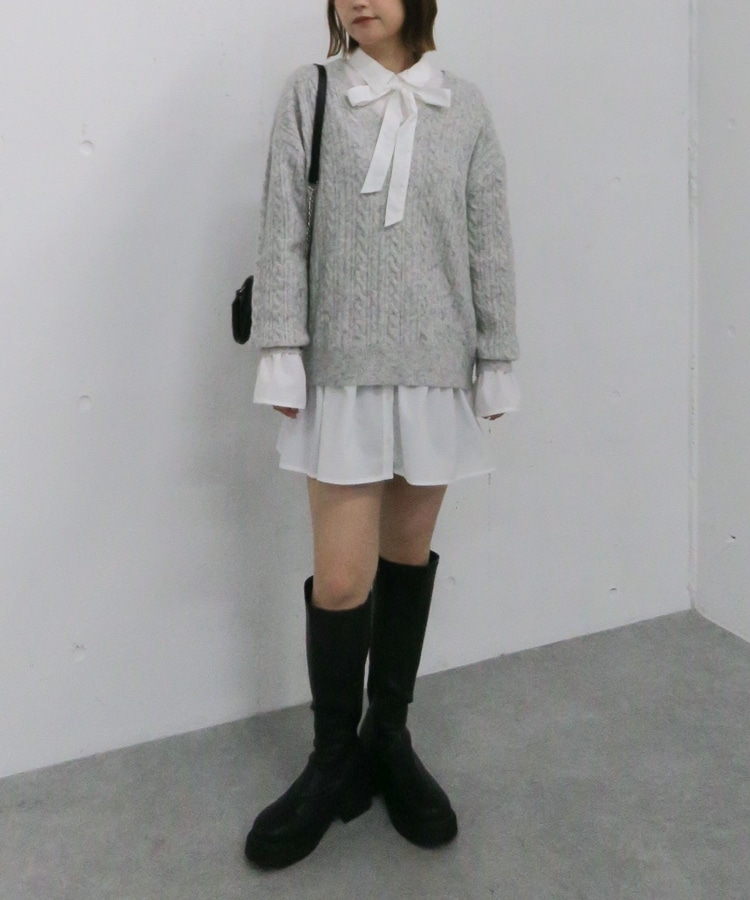 ■一枚で決まるお出かけワンピース■冬のお出かけにぴったりなセットワンピース。ケーブルニットとふわっと広がるシャツワンピが相性抜群。着丈長めのケーブルニットは一気に冬気分を盛り上げてくれます。しっかりとした編地であたたかく着て頂けます。シャツをレイヤードしてもごわつかないシルエット。袖周りにはボリュームをしっかりとプラス。セットのシャツワンピースは裾がふんわりと広がります。また足をカバーしてくれるので細見え効果◎シャツタイプなのできちんと見えも叶います。ボウタイは取り外し可能。セットはもちろん別々でも可愛く着こなせます。ーーーーーーーーーーーーーーー透け感:なし裏地:なし伸縮性:あり光沢感:なし生地厚さ:普通洗濯方法:ニット:手洗い推奨、シャツ:洗濯可※詳しいお手入れ方法は商品についているタグをご覧くださいーーーーーーーーーーーーーーー※ご利用のモニター環境により、実際の色味と多少異なる場合がございます。