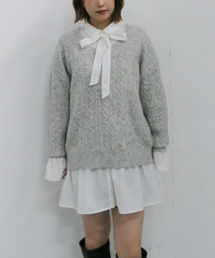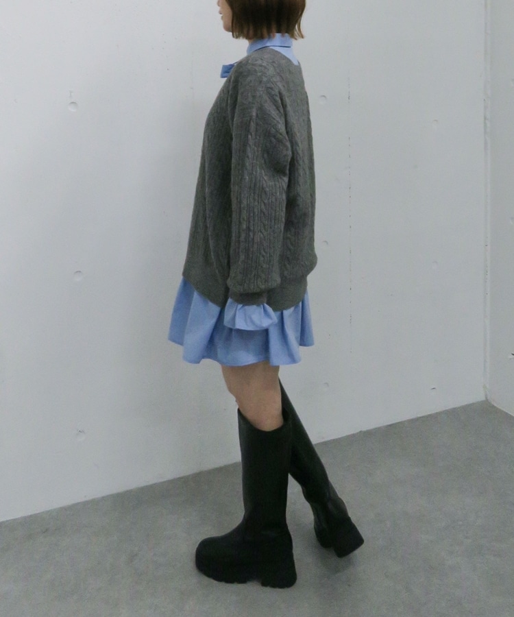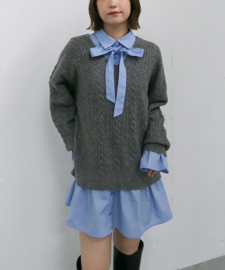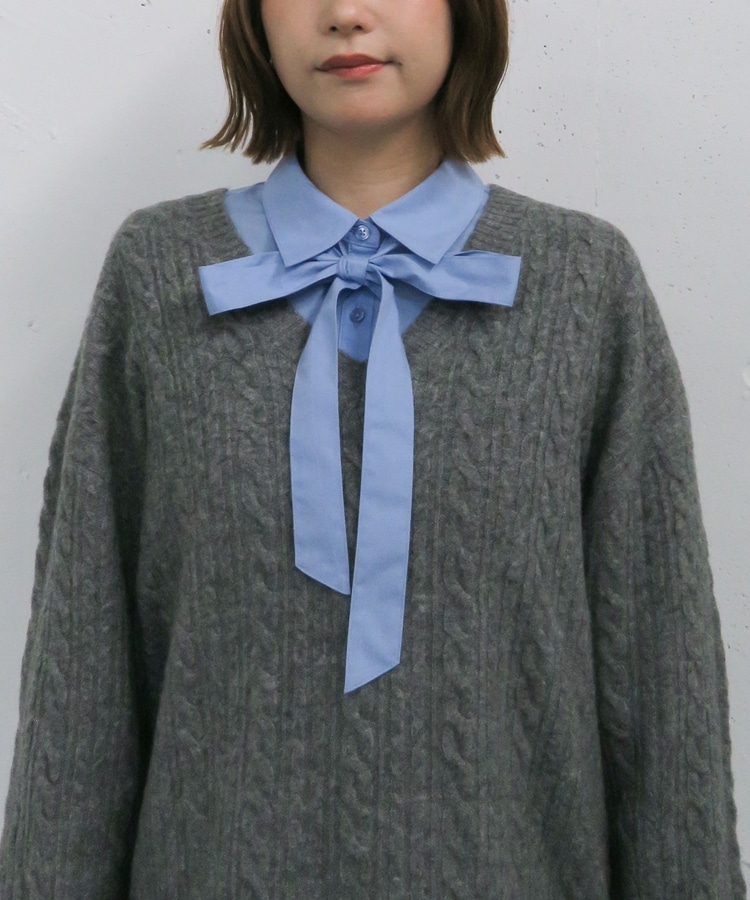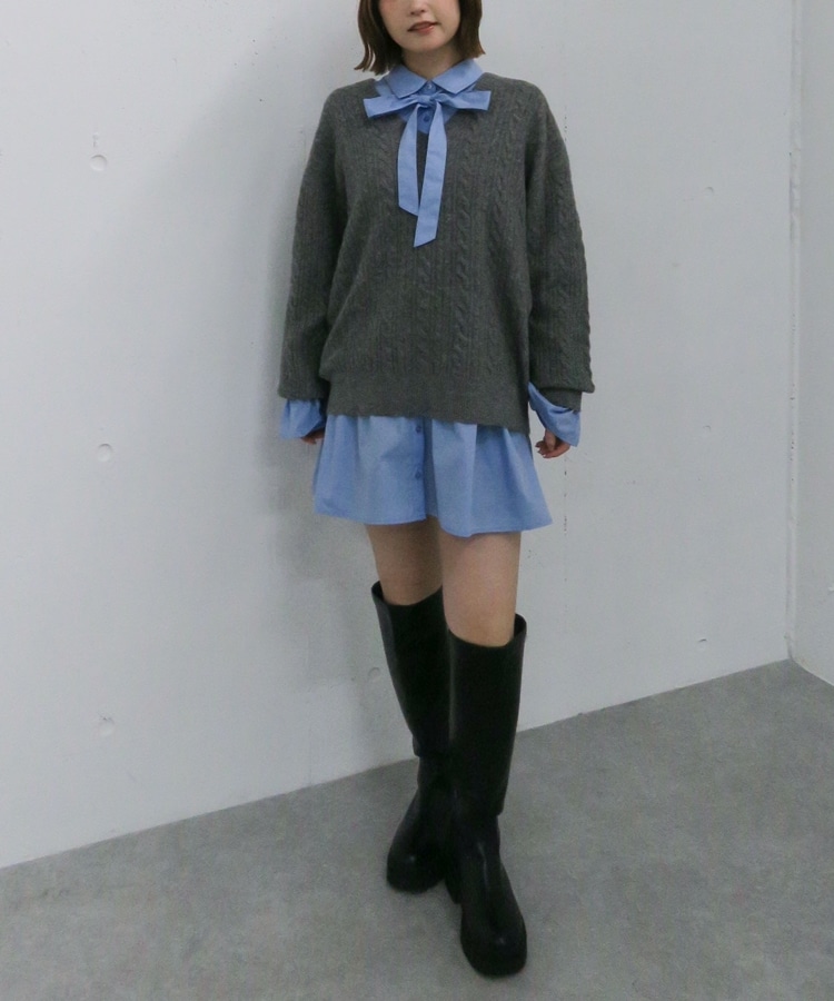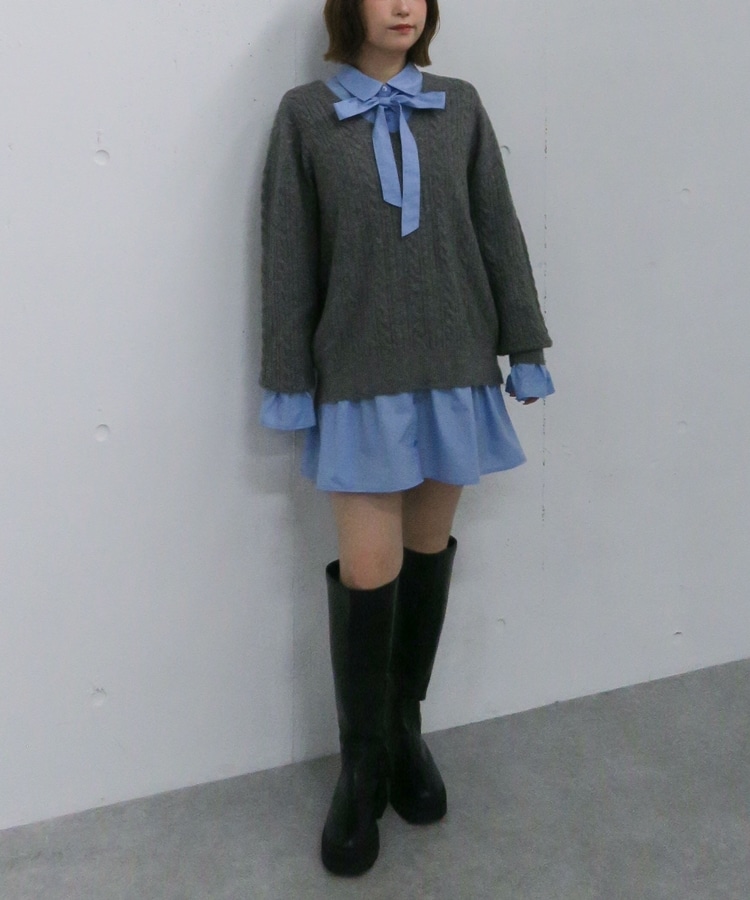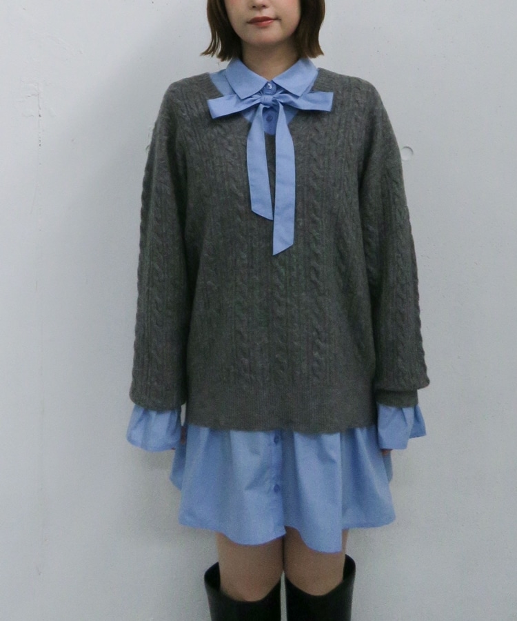 ■一枚で決まるお出かけワンピース■冬のお出かけにぴったりなセットワンピース。ケーブルニットとふわっと広がるシャツワンピが相性抜群。着丈長めのケーブルニットは一気に冬気分を盛り上げてくれます。しっかりとした編地であたたかく着て頂けます。シャツをレイヤードしてもごわつかないシルエット。袖周りにはボリュームをしっかりとプラス。セットのシャツワンピースは裾がふんわりと広がります。また足をカバーしてくれるので細見え効果◎シャツタイプなのできちんと見えも叶います。ボウタイは取り外し可能。セットはもちろん別々でも可愛く着こなせます。ーーーーーーーーーーーーーーー透け感:なし裏地:なし伸縮性:あり光沢感:なし生地厚さ:普通洗濯方法:ニット:手洗い推奨、シャツ:洗濯可※詳しいお手入れ方法は商品についているタグをご覧くださいーーーーーーーーーーーーーーー※ご利用のモニター環境により、実際の色味と多少異なる場合がございます。