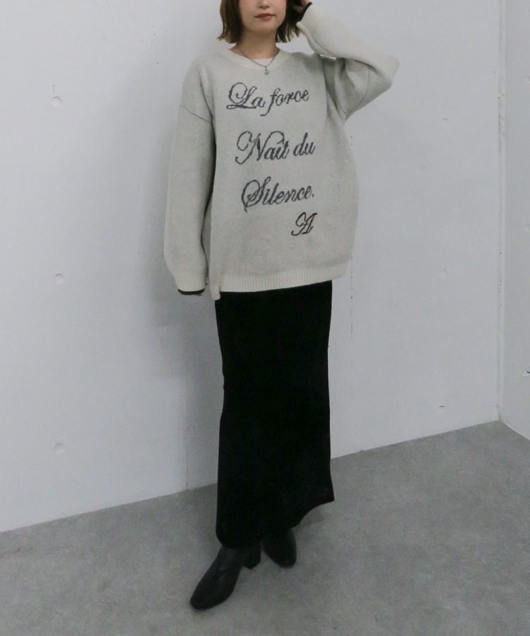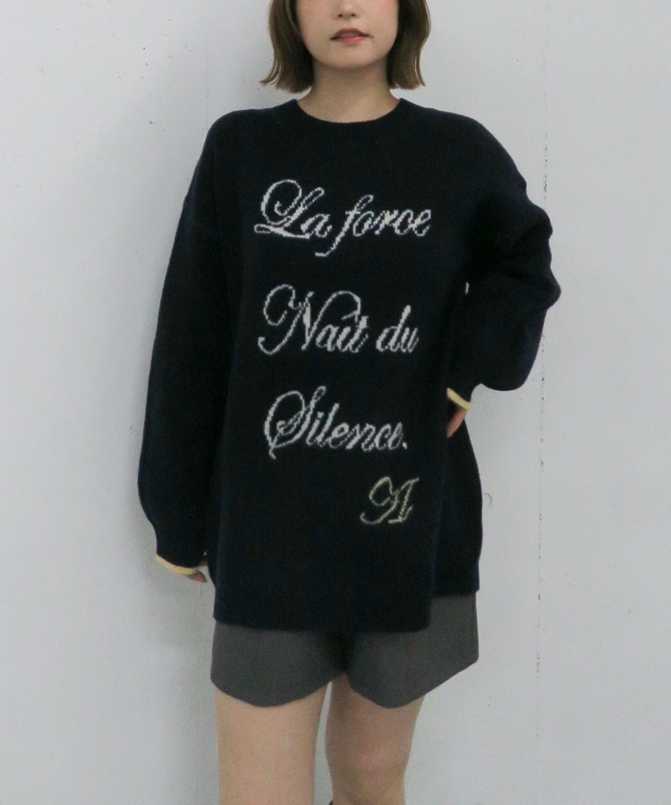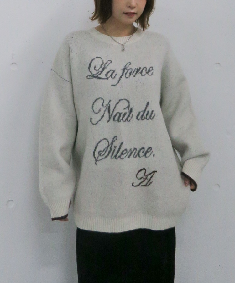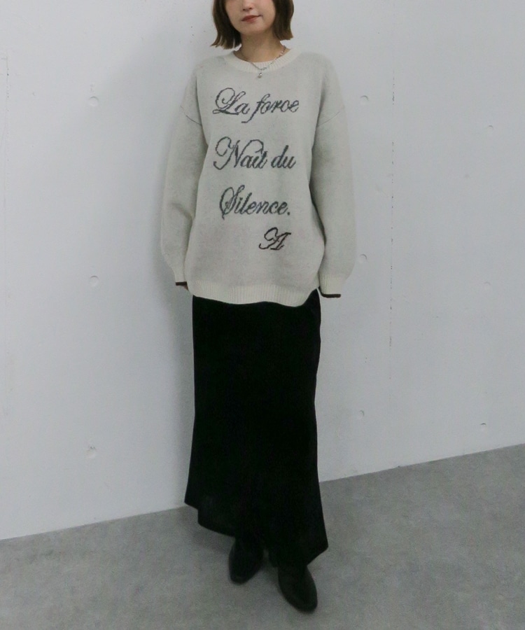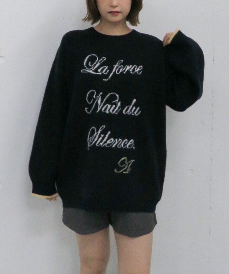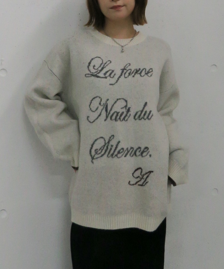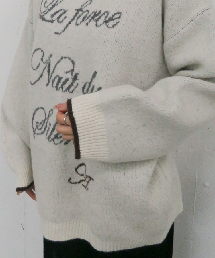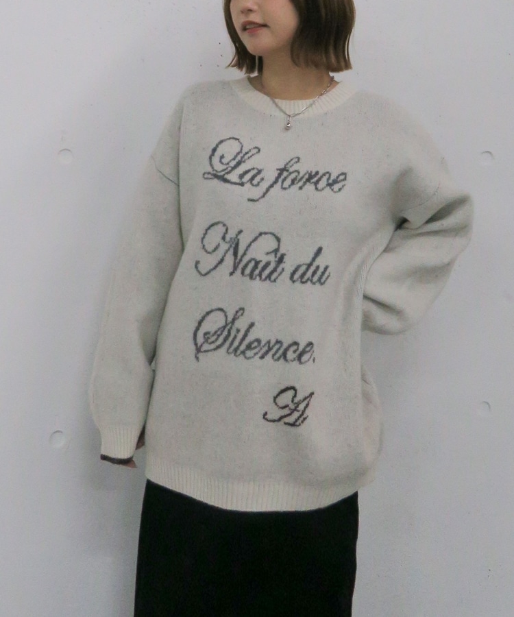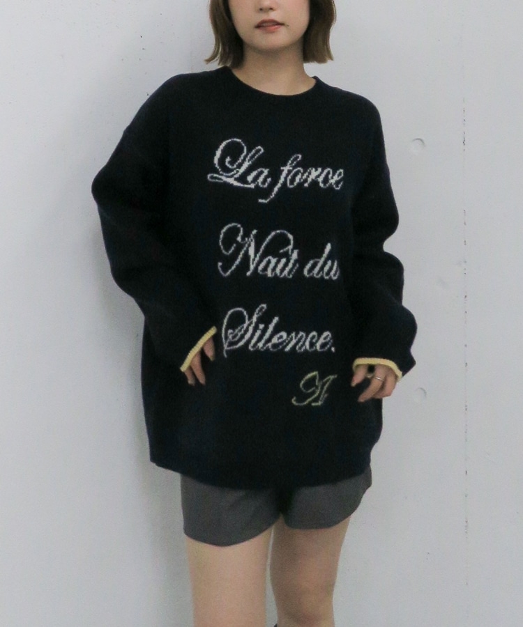 ■トレンドを着こなすならコレ■今季トレンドのロゴニット!カジュアルにもフェミニンにも着こなせます。オーバーにゆったりと着こなせるシルエット。腰が隠れるぐらいの丈感。しっかりとしたニット生地であたたかさも◎ロゴは筆記体で子供っぽくならず、どんな世代の方でも着こなして頂けます。ミニボトムでワンピース風に、スラックスやデニムを合わせてルーズに着るのもおススメです。ーーーーーーーーーーーーーーー透け感:なし裏地:なし伸縮性:あり光沢感:なし生地厚さ:厚め洗濯方法:手洗い推奨※詳しいお手入れ方法は商品についているタグをご覧くださいーーーーーーーーーーーーーーー※ご利用のモニター環境により、実際の色味と多少異なる場合がございます。