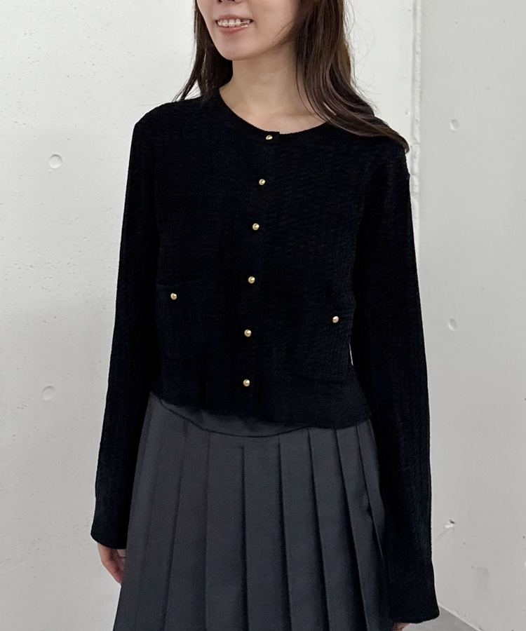 金ボタンが目を引く一枚はスタイリングの主役に。