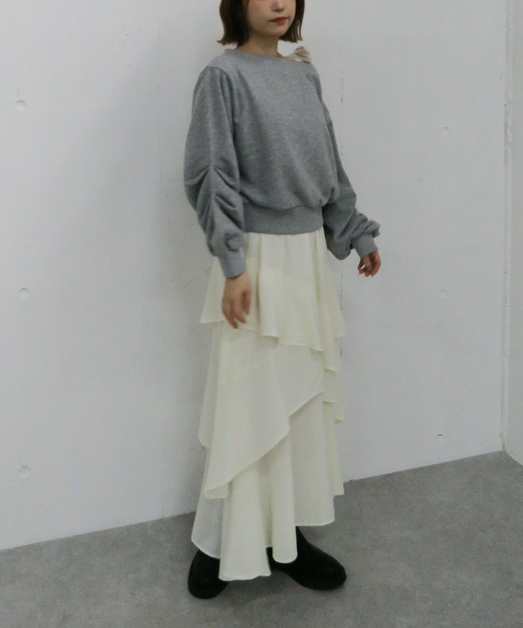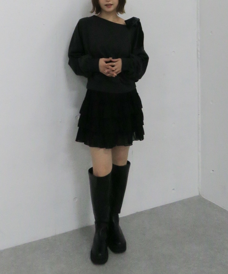 アウターのインにもおすすめな素材感なので、冬はアウターに忍ばせて脱いでも可愛いスタイリングに♪