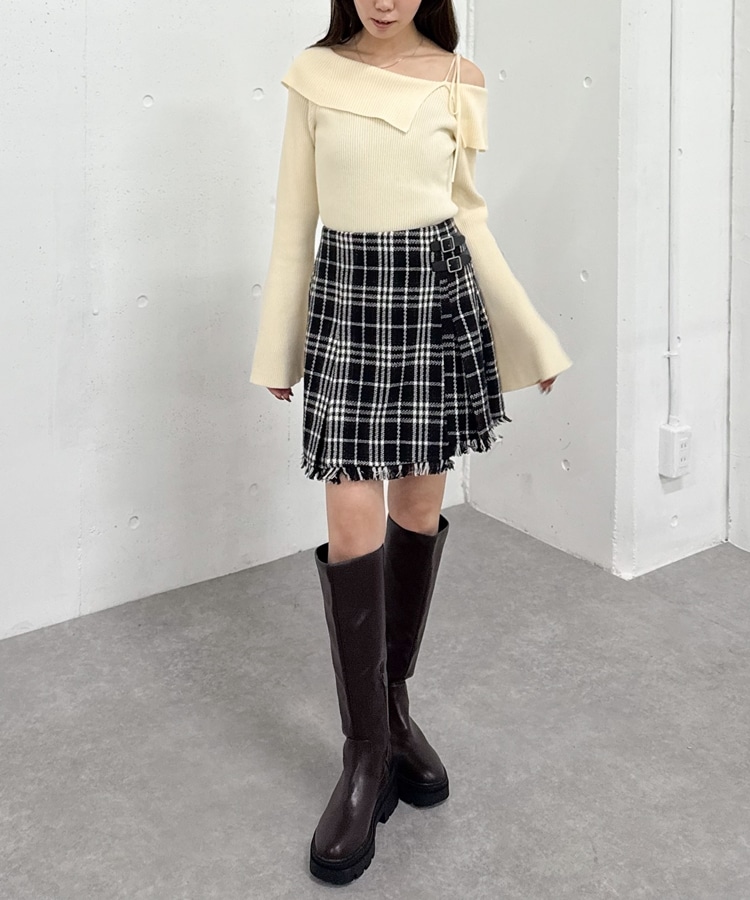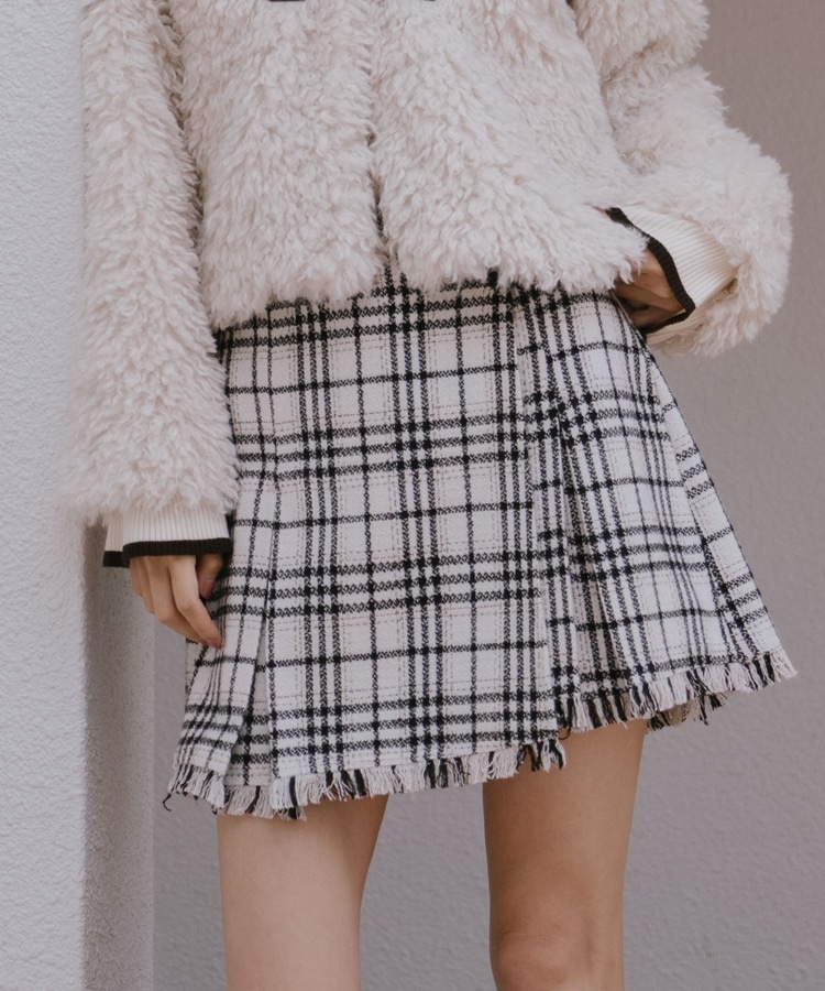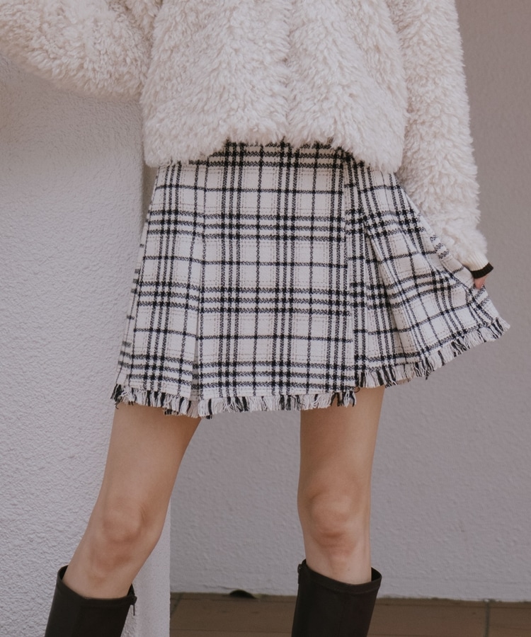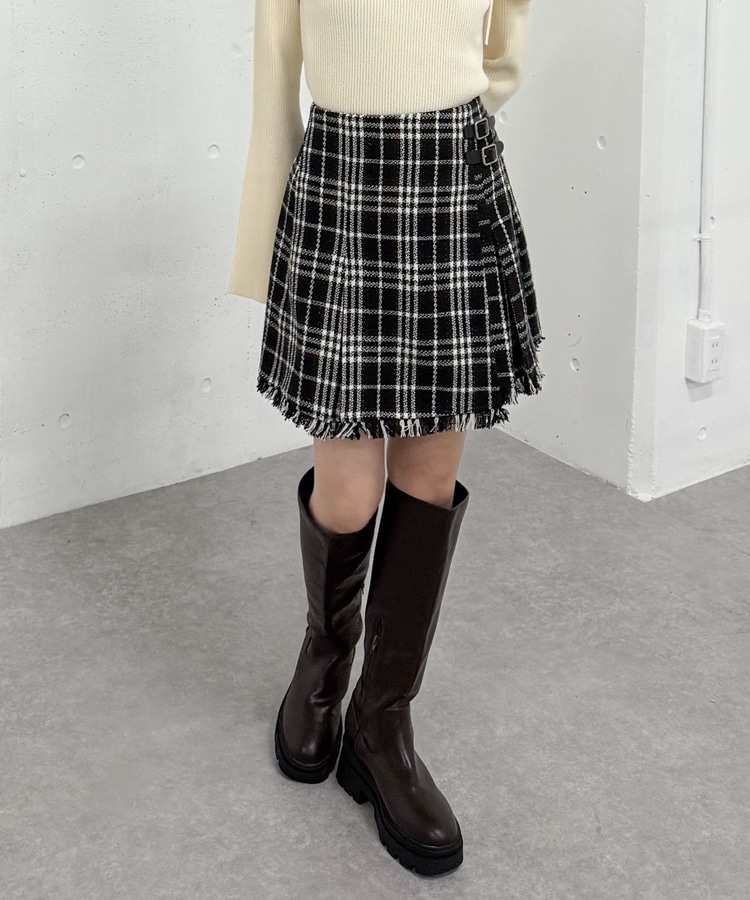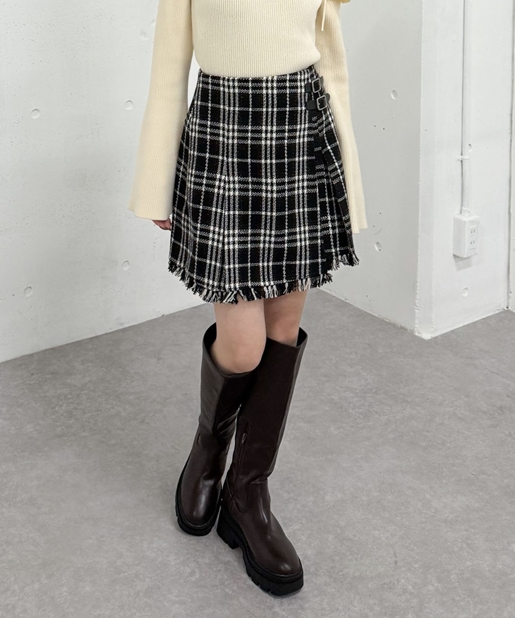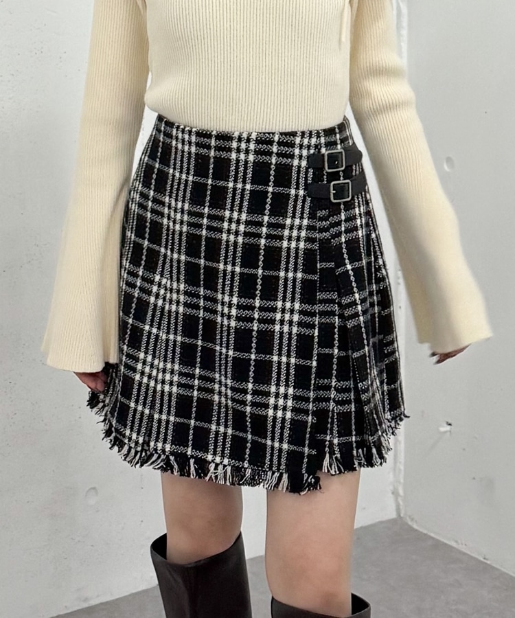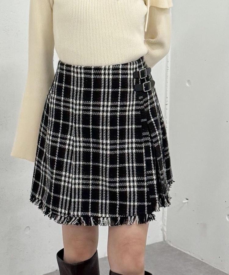 ■ツイード×チェックで冬モードに■サイドのベルトとラップのデザインがポイントのミニスカート。台形シルエットで脚をすっきり見せてくれます◎後ろはゴムでニットのインもしやすい仕様♪インナーパンツ付きで安心です。シンプルなシルエットで、合わせるトップスを選ばず着まわせるのが嬉しいポイント!甘めにあわせたホリデーコーデにもおすすめです。ーーーーーーーーーーーーーーー透け感:なし裏地:あり伸縮性:背面ゴム光沢感:なし生地厚さ:普通洗濯方法:洗濯可能※詳しいお手入れ方法は商品についているタグをご覧くださいーーーーーーーーーーーーーーー※ご利用のモニター環境により、実際の色味と多少異なる場合がございます。
