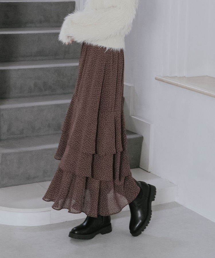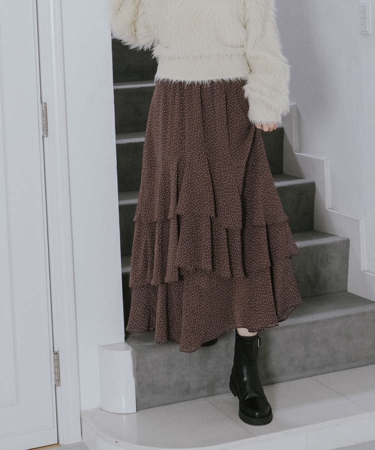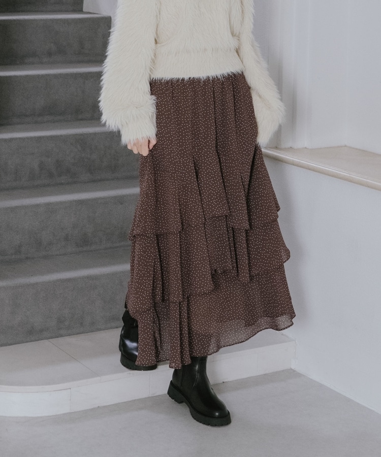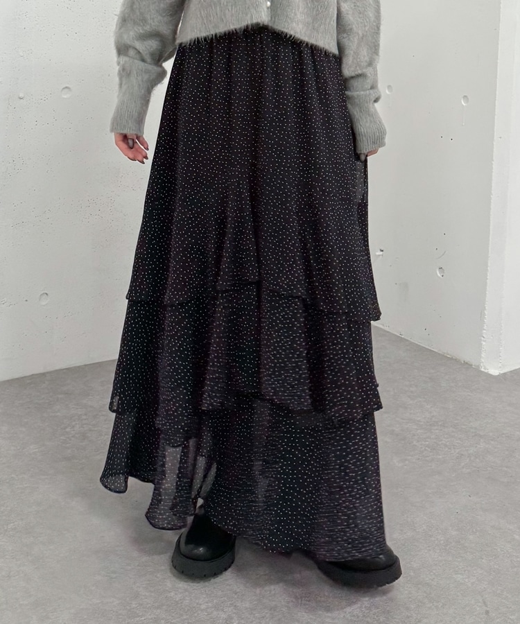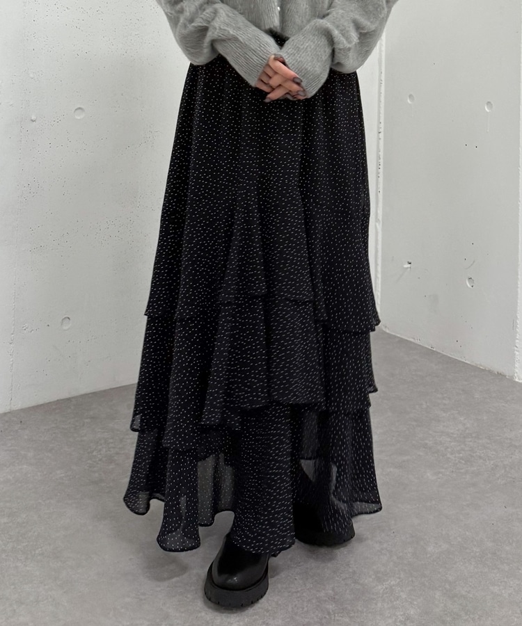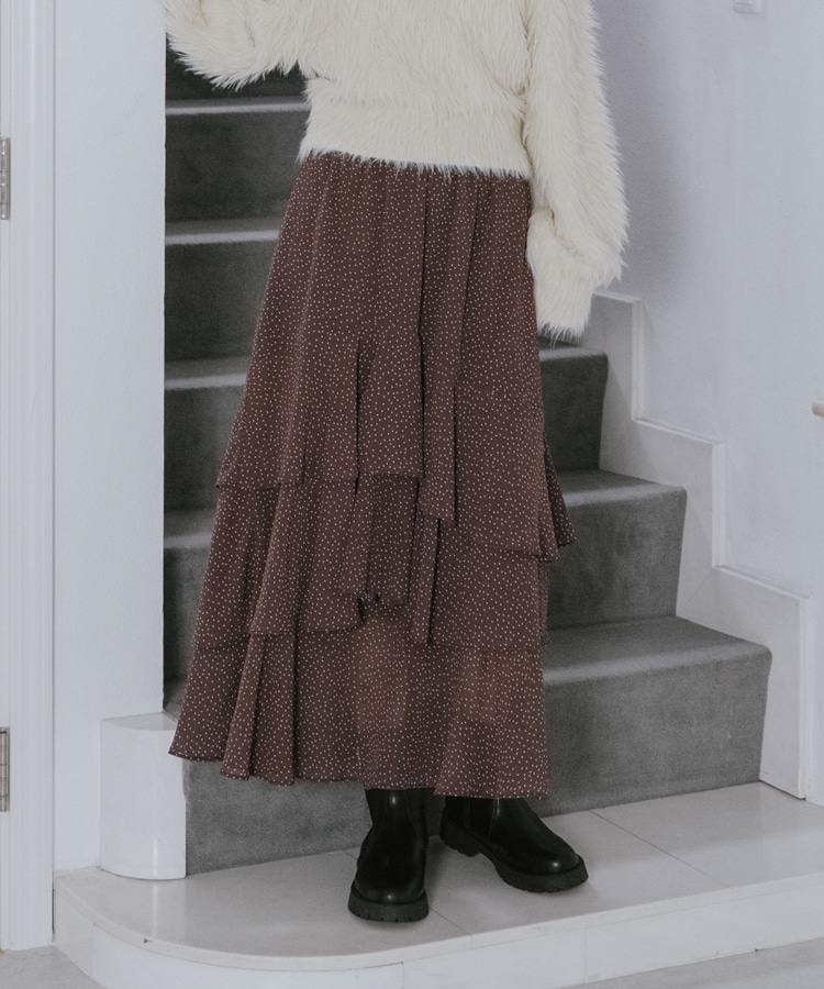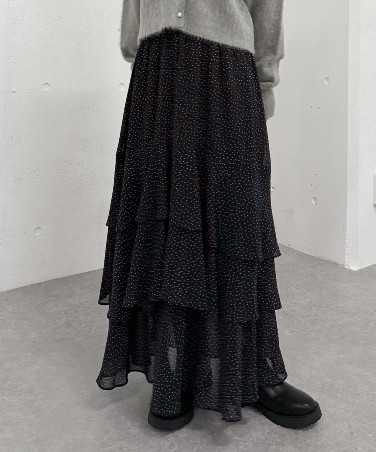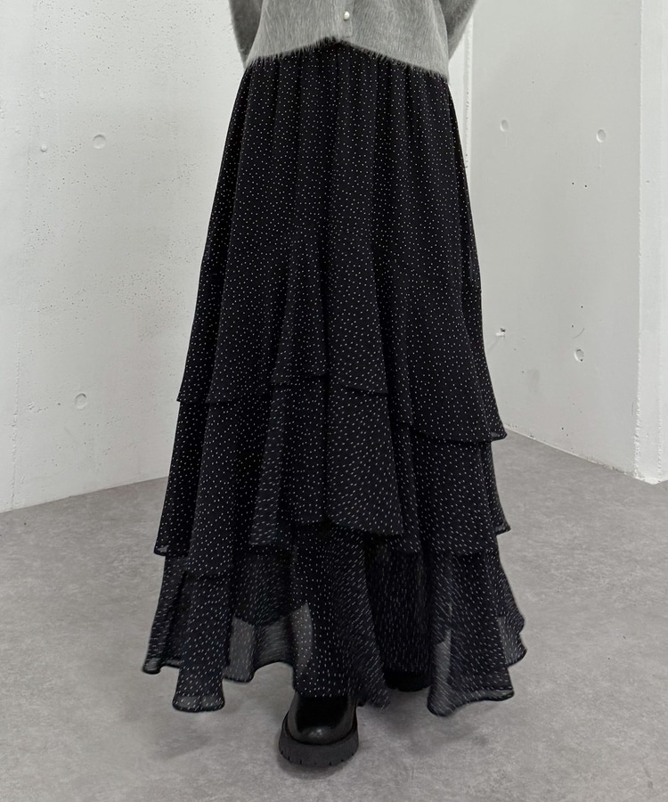 ■歩くたびにときめく、揺れ感スカート■動くたびにふわっと揺れるフリルが女性らしさを演出するティアードスカート。細かめのドット柄は甘くなりすぎず、どんなスタイルにも合わせやすいデザインです。柄タイプはコーデの主役に、無地タイプは着回しアイテムとしても活躍◎360度どこから見ても美しいシルエットで、歩くたびに気分が上がる1枚です。ーーーーーーーーーーーーーーー透け感:アイボリーややあり裏地:あり伸縮性:ウエストゴム光沢感:なし生地厚さ:普通洗濯方法:洗濯可※詳しいお手入れ方法は商品についているタグをご覧くださいーーーーーーーーーーーーーーー※ご利用のモニター環境により、実際の色味と多少異なる場合がございます。