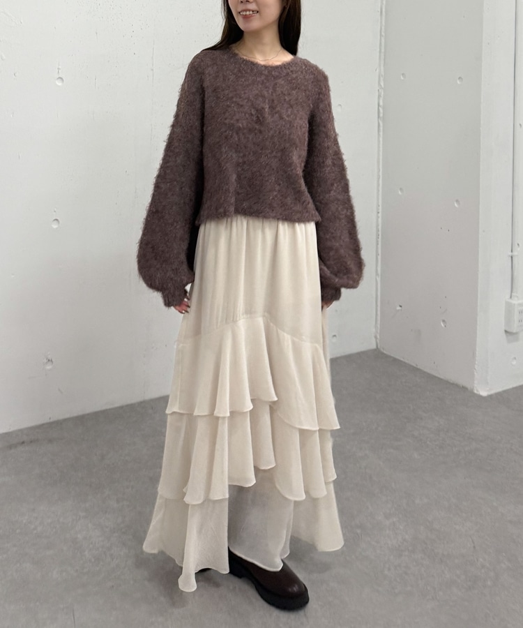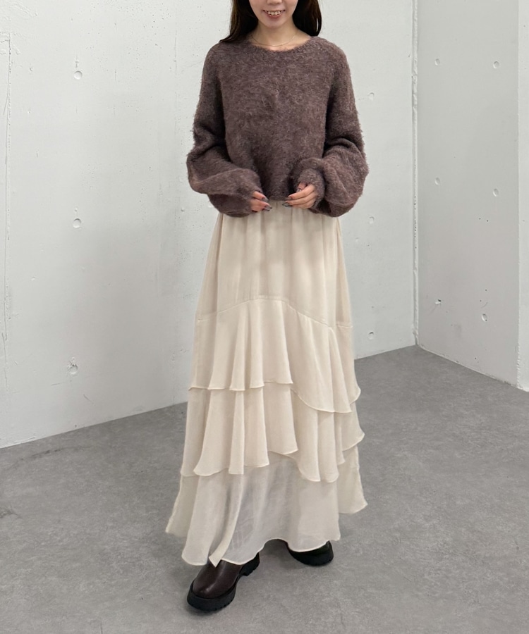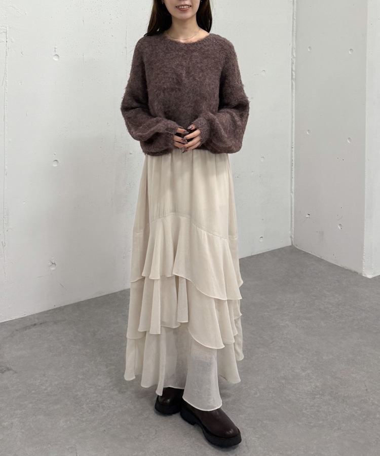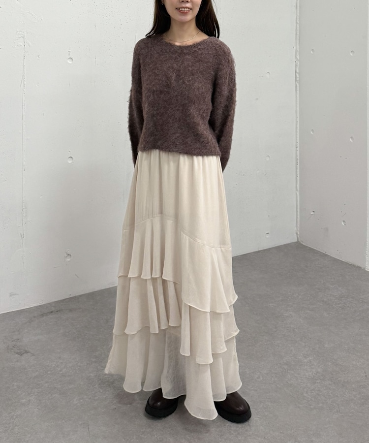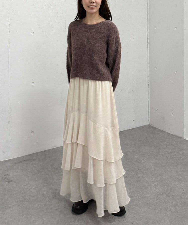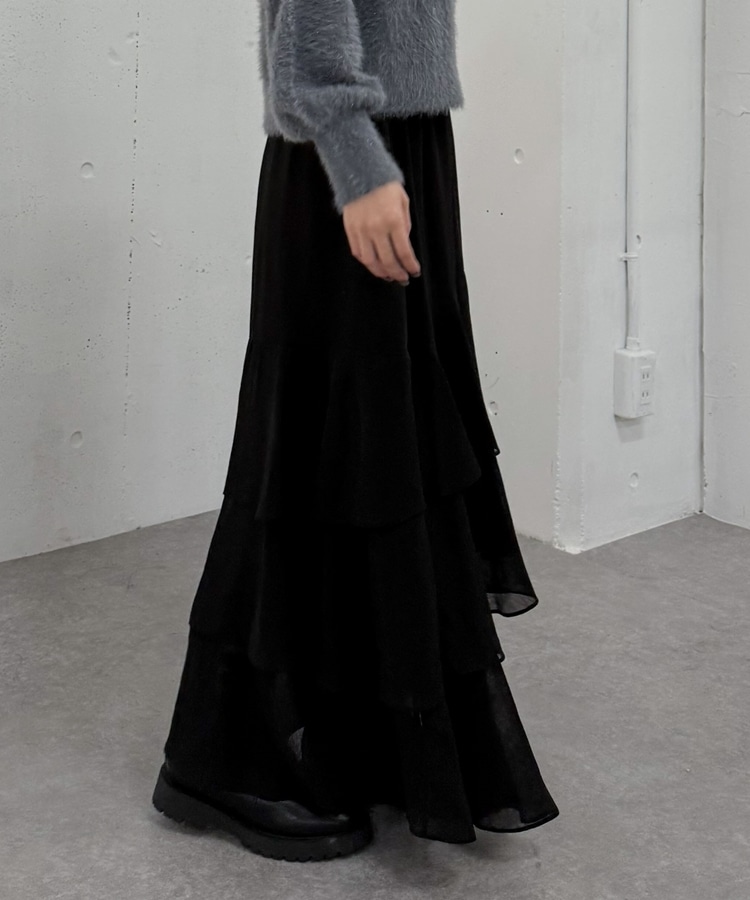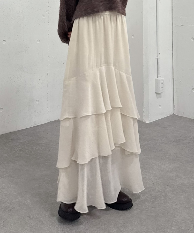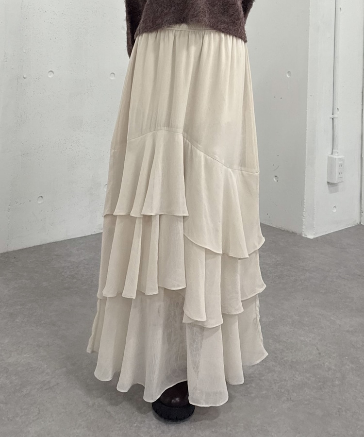 ■歩くたびにときめく、揺れ感スカート■動くたびにふわっと揺れるフリルが女性らしさを演出するティアードスカート。細かめのドット柄は甘くなりすぎず、どんなスタイルにも合わせやすいデザインです。柄タイプはコーデの主役に、無地タイプは着回しアイテムとしても活躍◎360度どこから見ても美しいシルエットで、歩くたびに気分が上がる1枚です。ーーーーーーーーーーーーーーー透け感:アイボリーややあり裏地:あり伸縮性:ウエストゴム光沢感:なし生地厚さ:普通洗濯方法:洗濯可※詳しいお手入れ方法は商品についているタグをご覧くださいーーーーーーーーーーーーーーー※ご利用のモニター環境により、実際の色味と多少異なる場合がございます。
