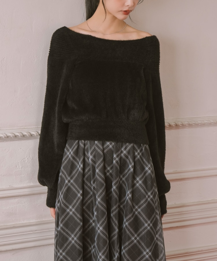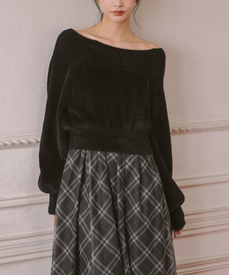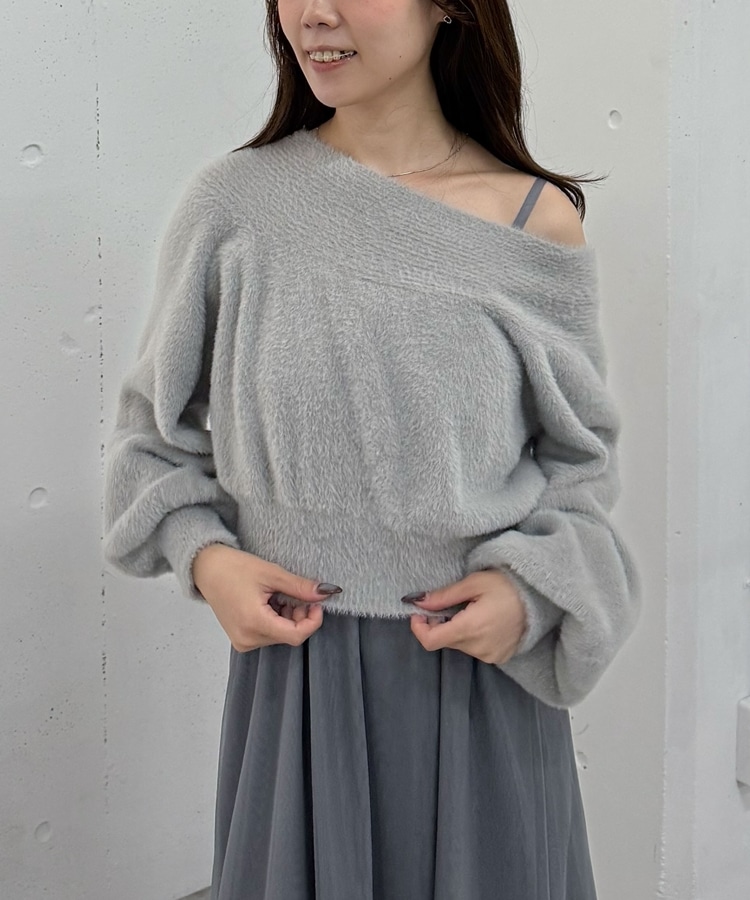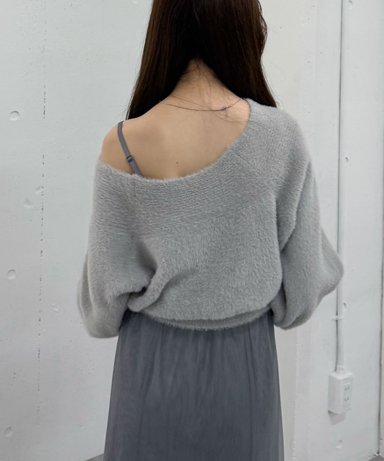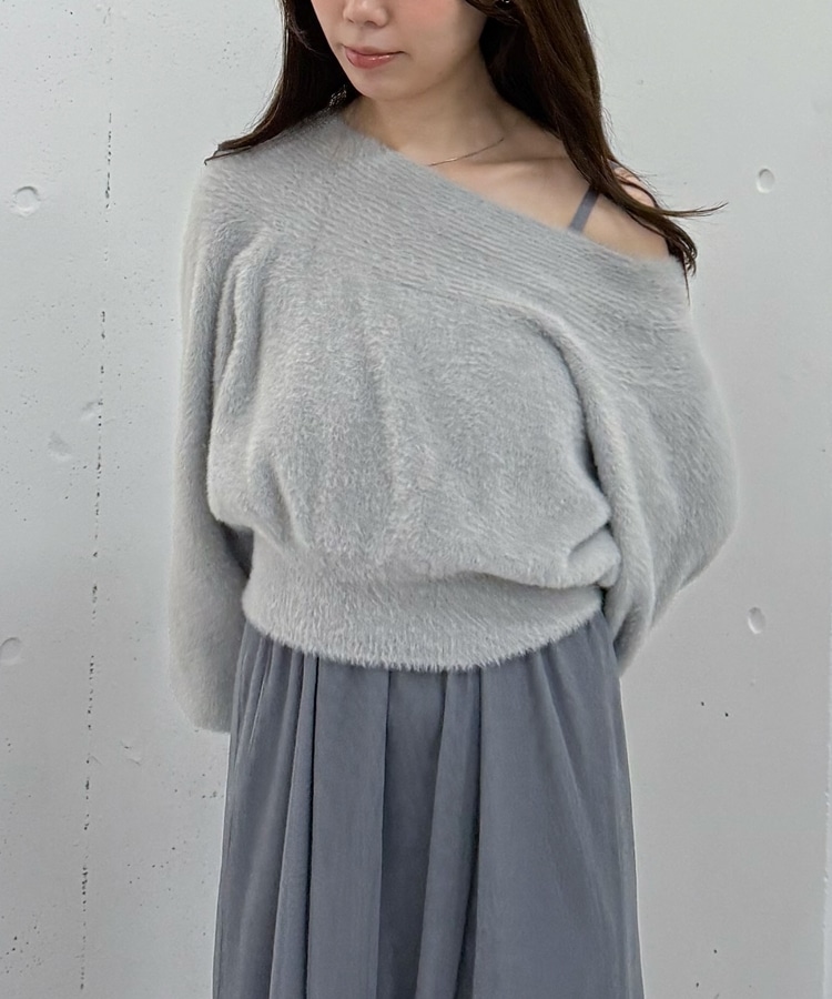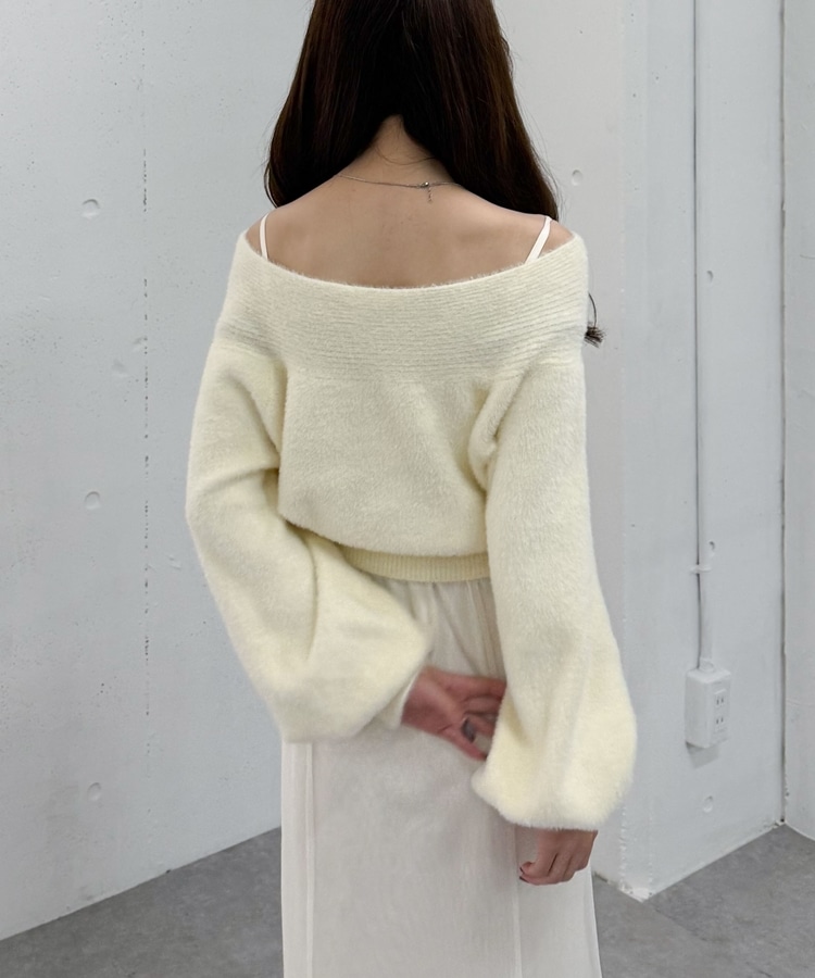 毛足短めの柔らかい肌当たりのオフショルニット。