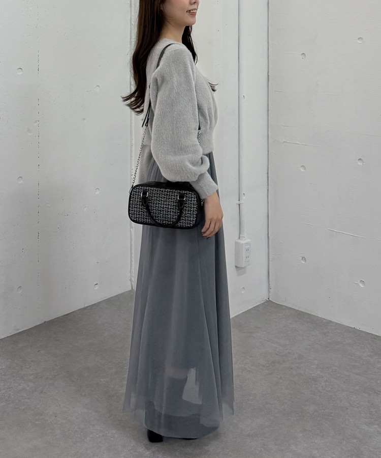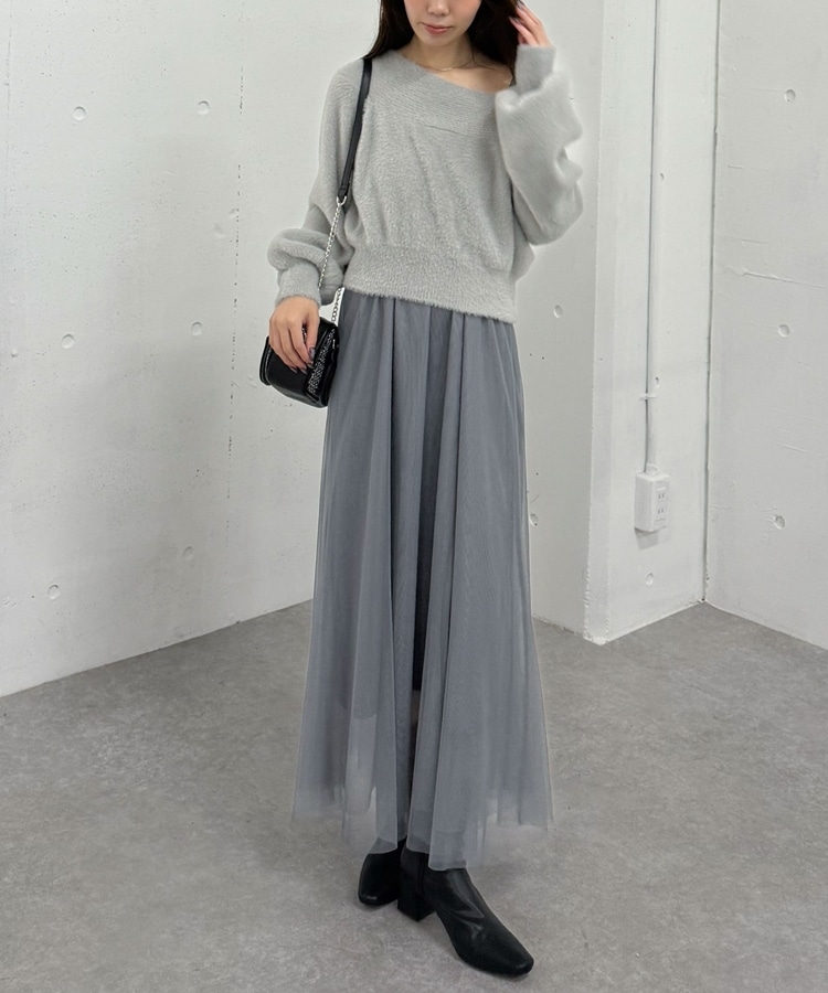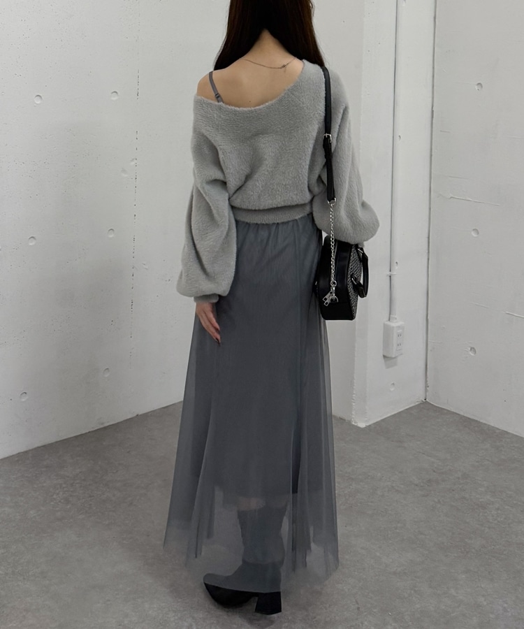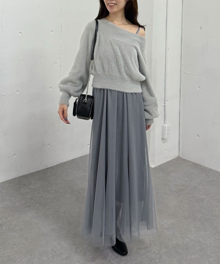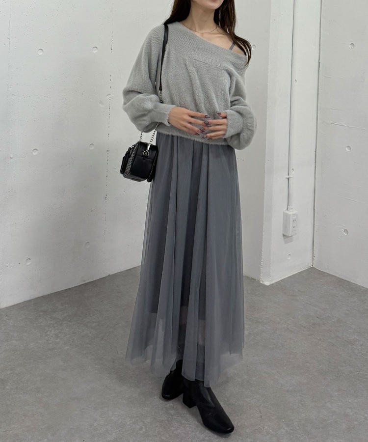 フェザーオフショルニット×チュールキャミワンピースSET GRAY