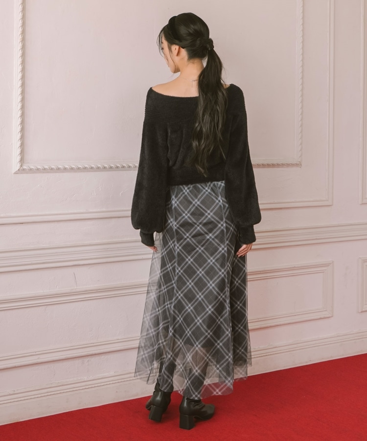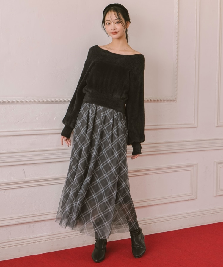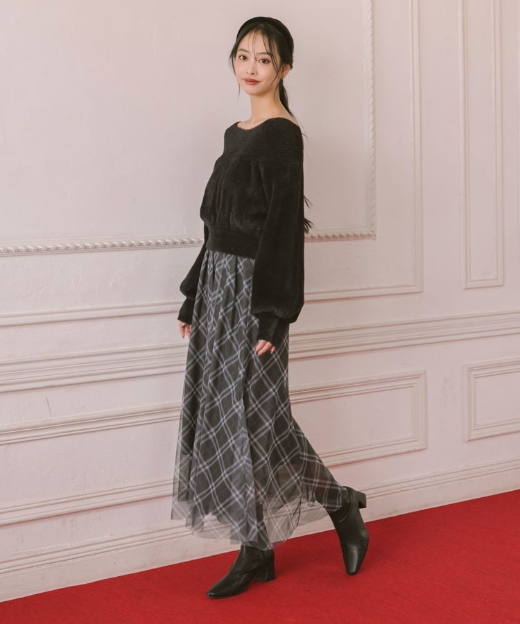 フェザーオフショルニット×チュールキャミワンピースSET BLACK