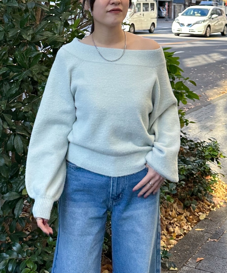 ラメマシュマロオフショルニットプルオーバー GREEN