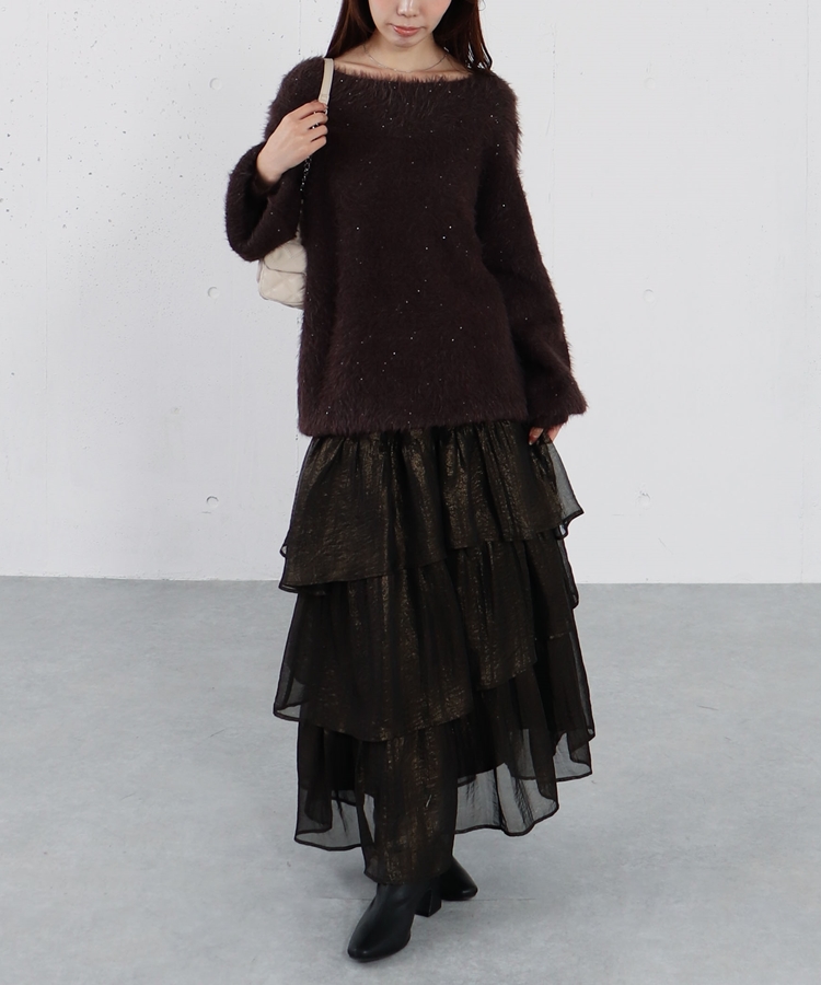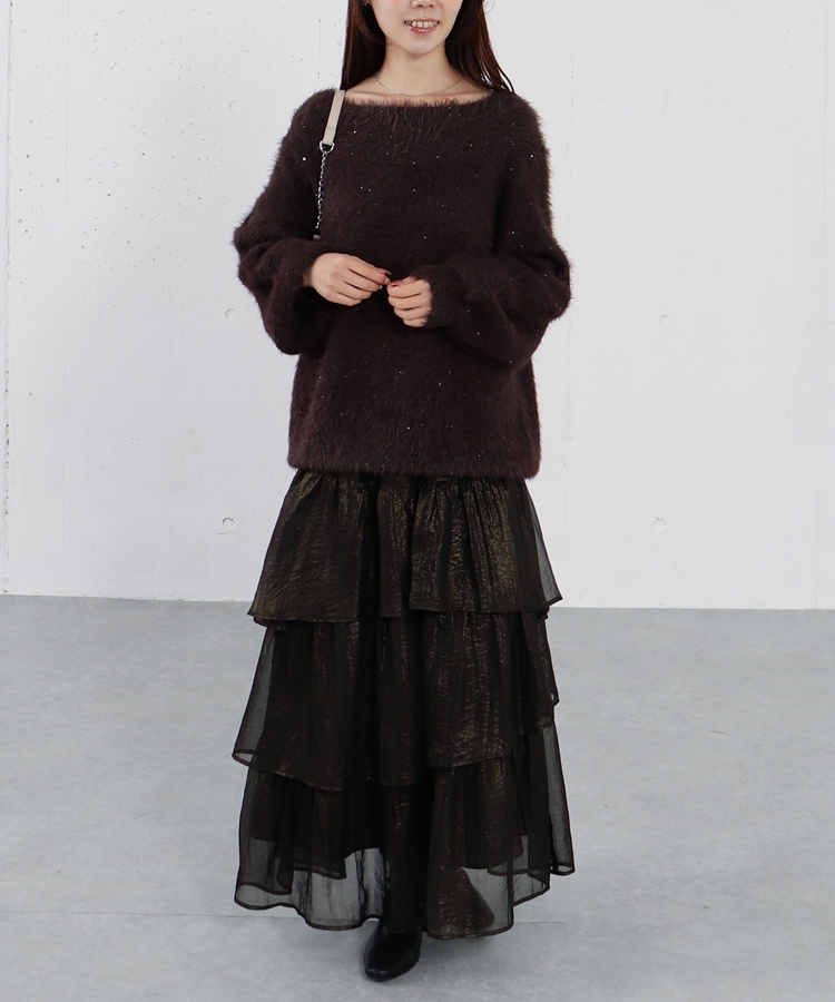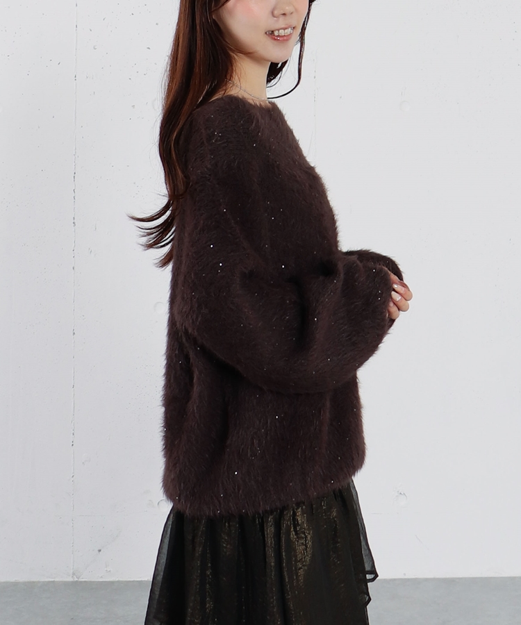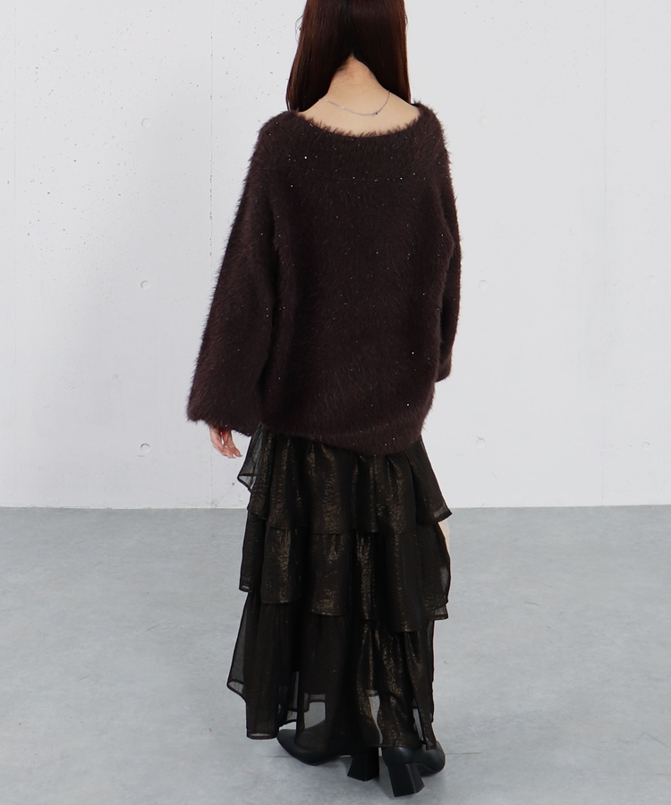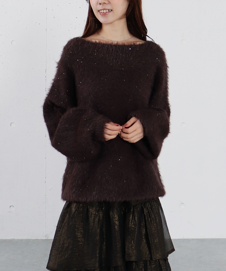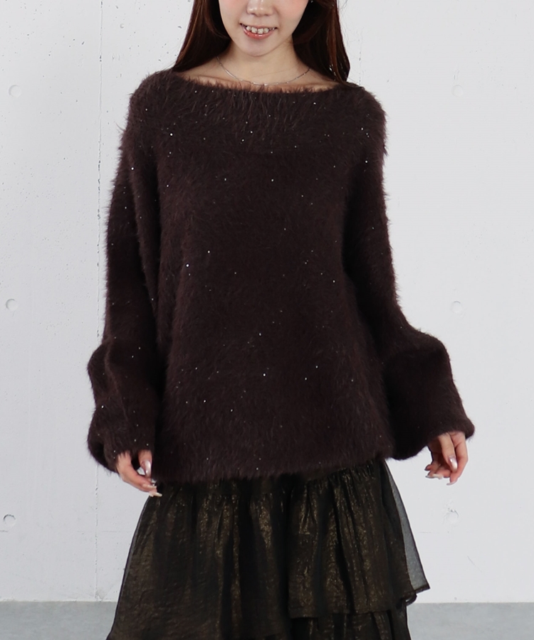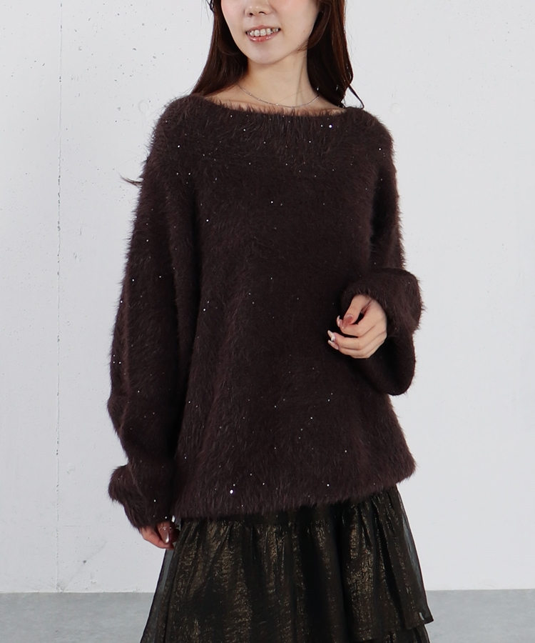 スパンコールフェザーオフショルミドルニットプルオーバー BROWN