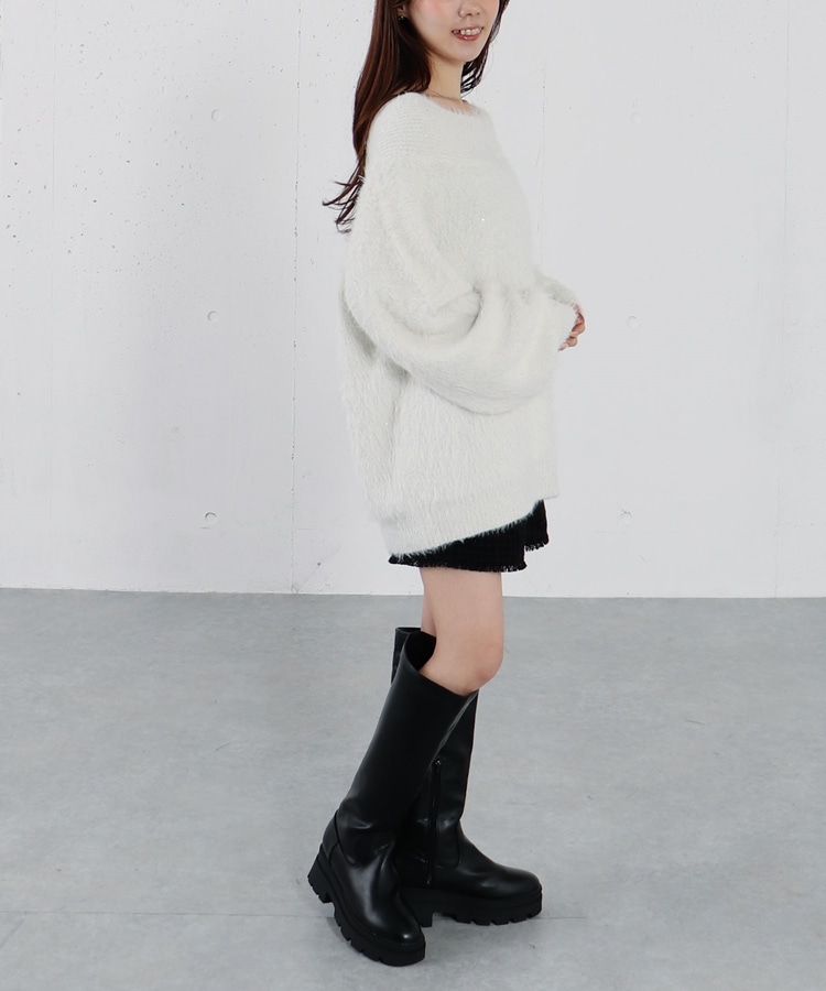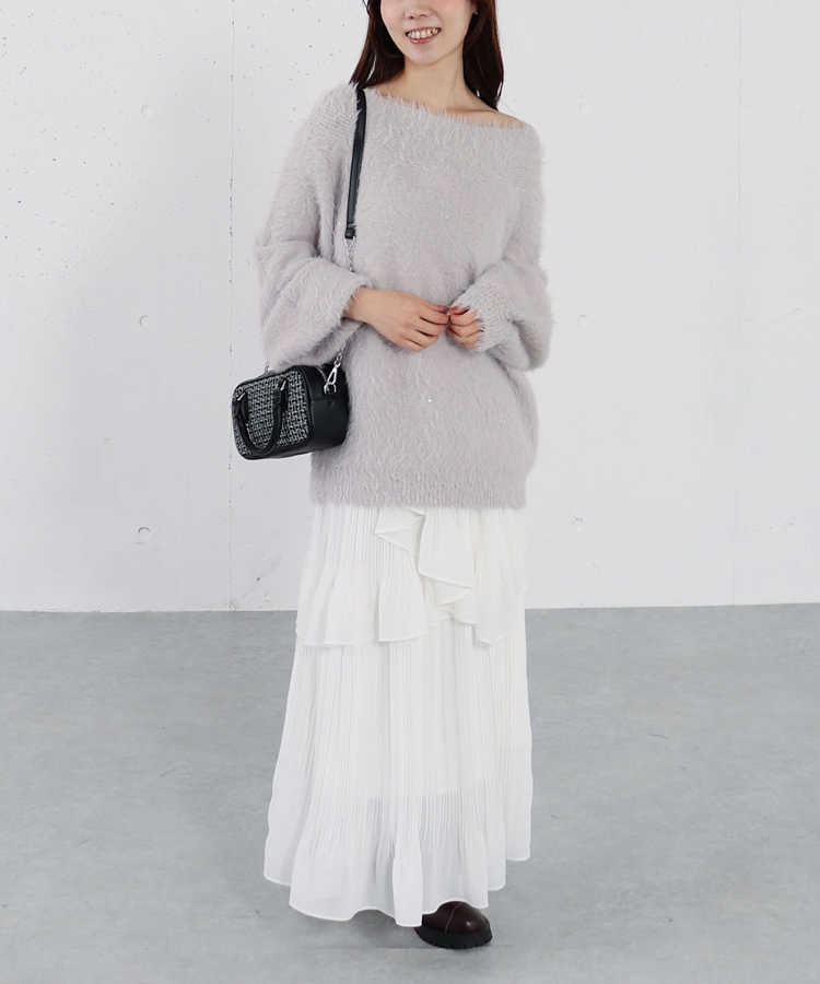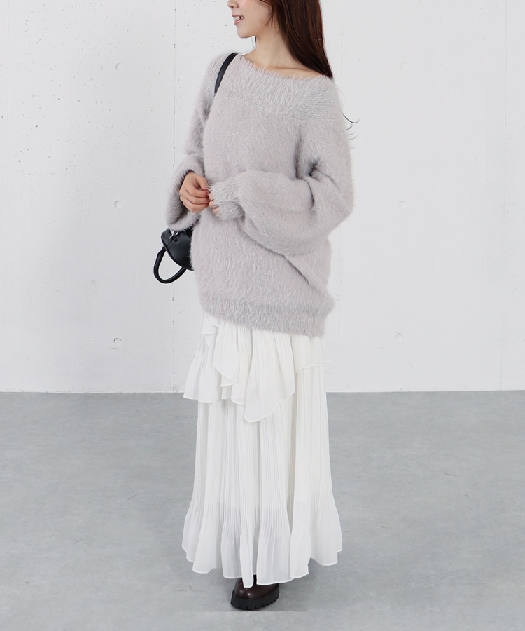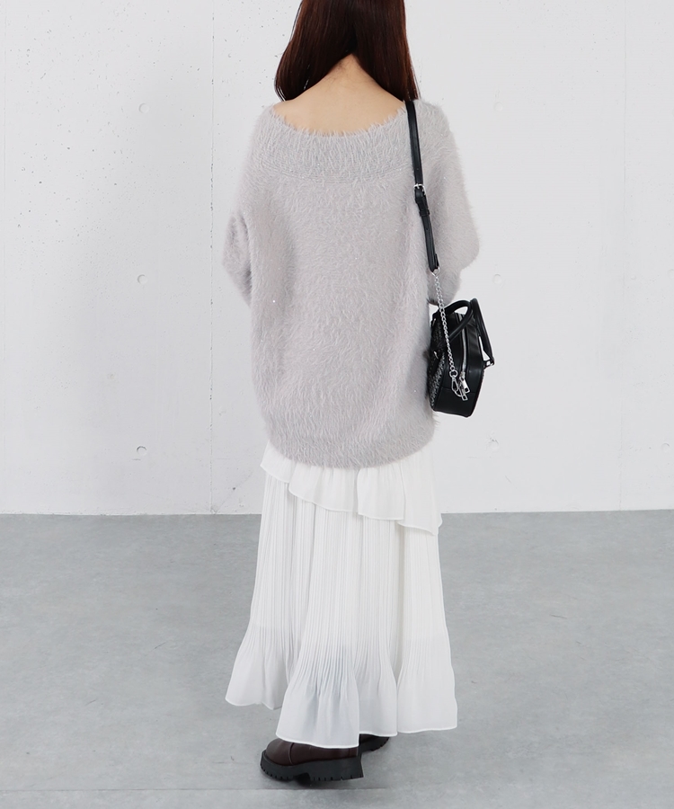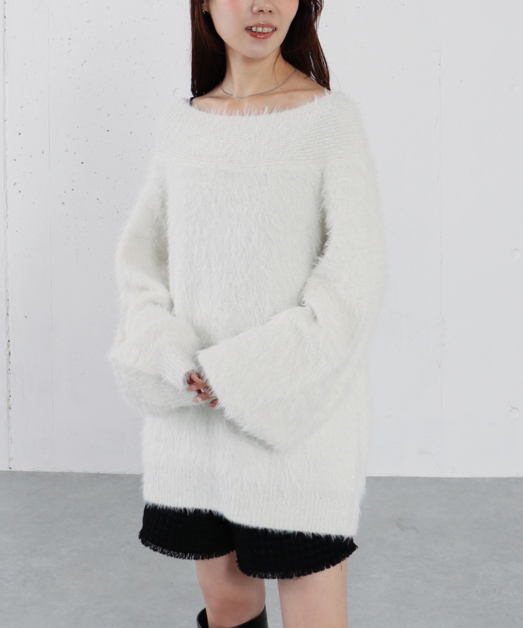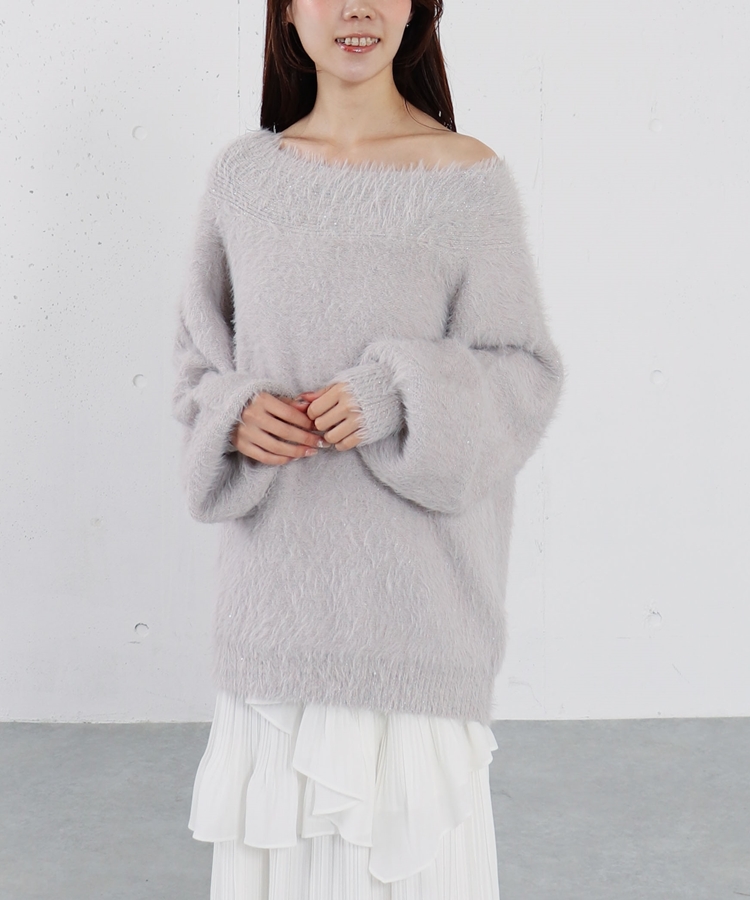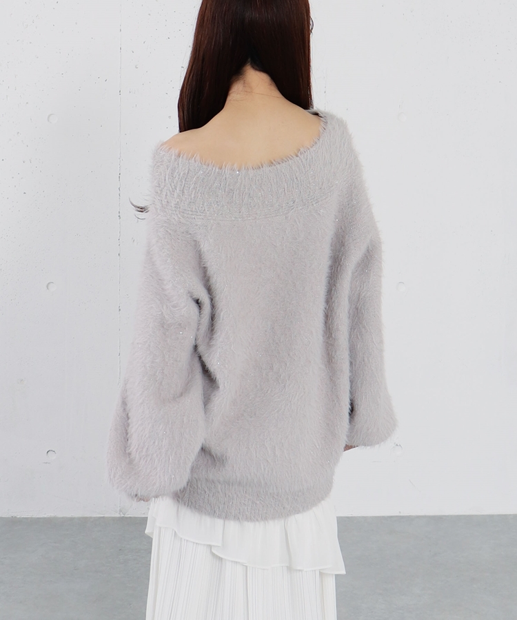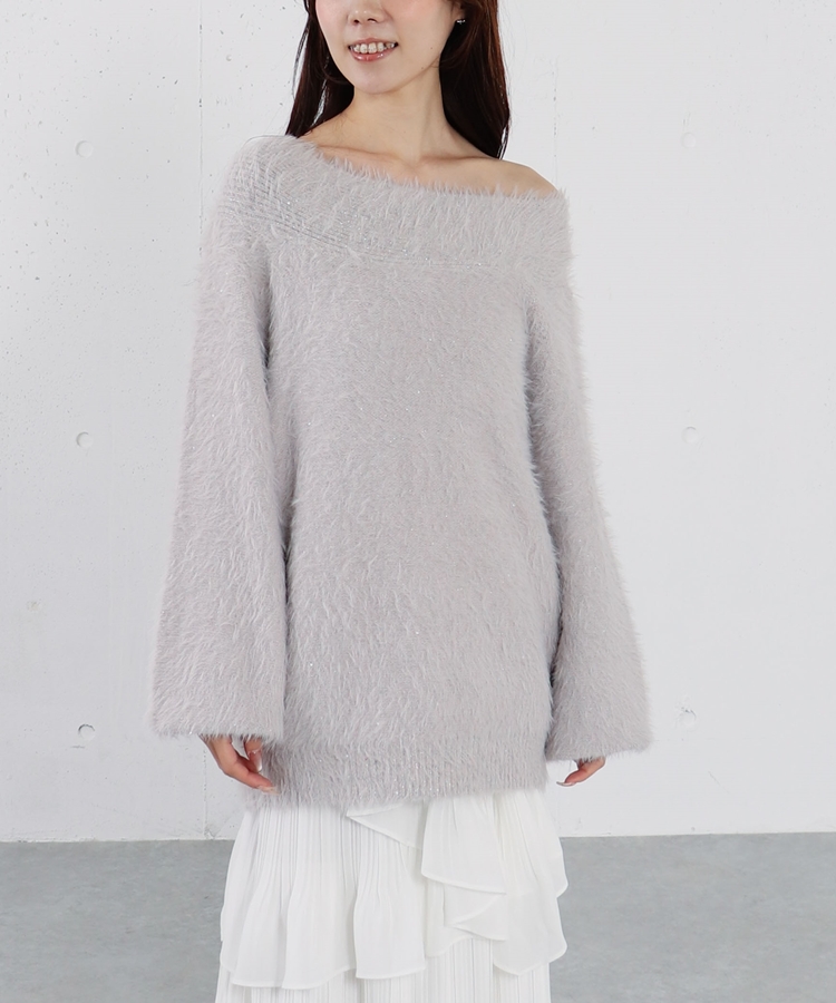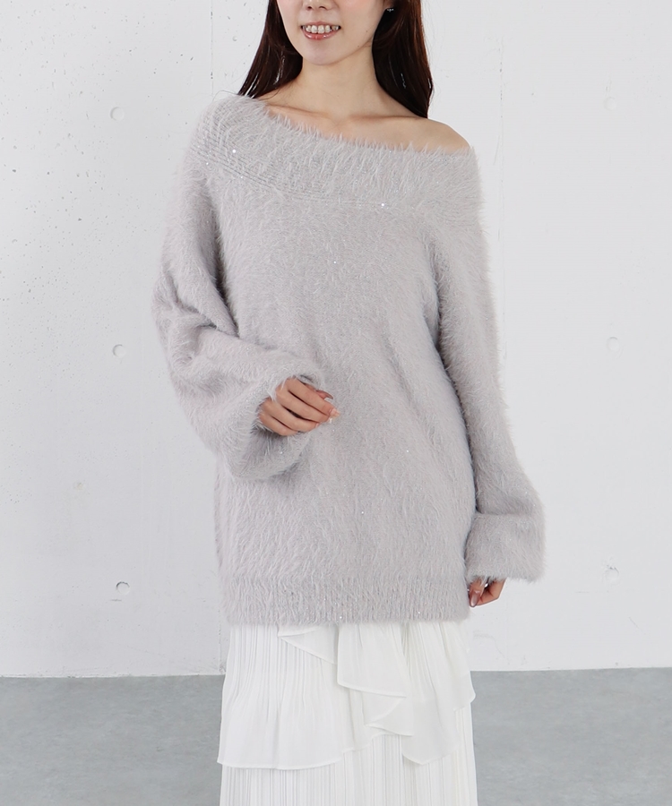 スパンコールフェザーオフショルミドルニットプルオーバー