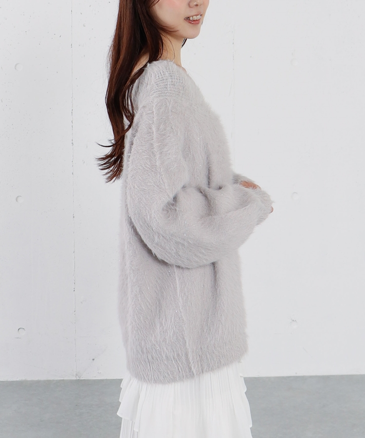 スパンコールのさりげないきらめきと、フェザーのふわっとした質感が魅力のオフショルニット。