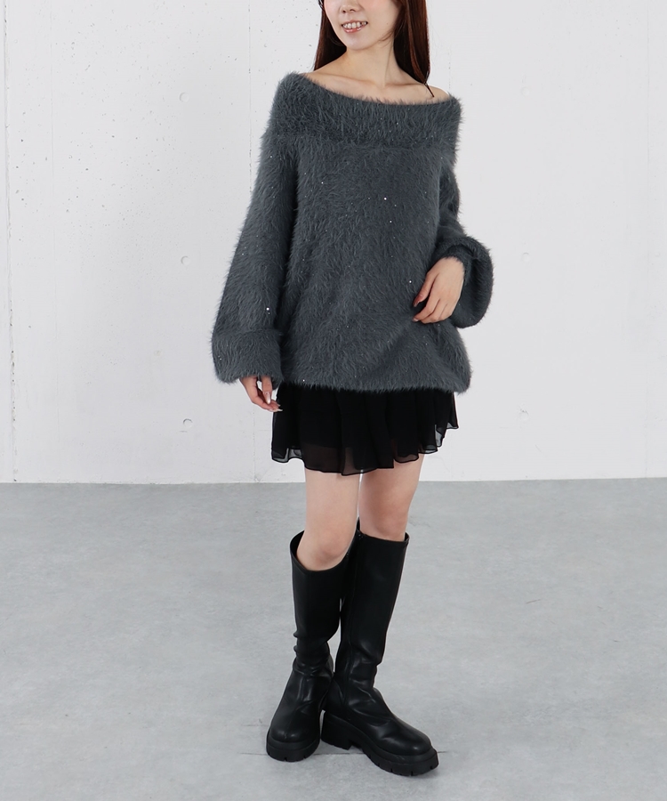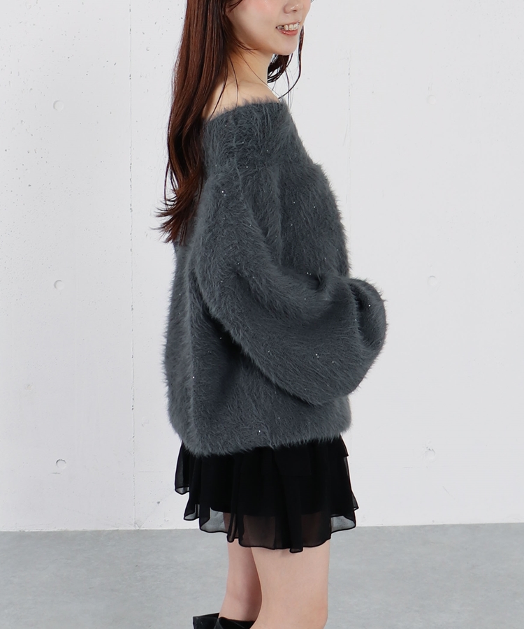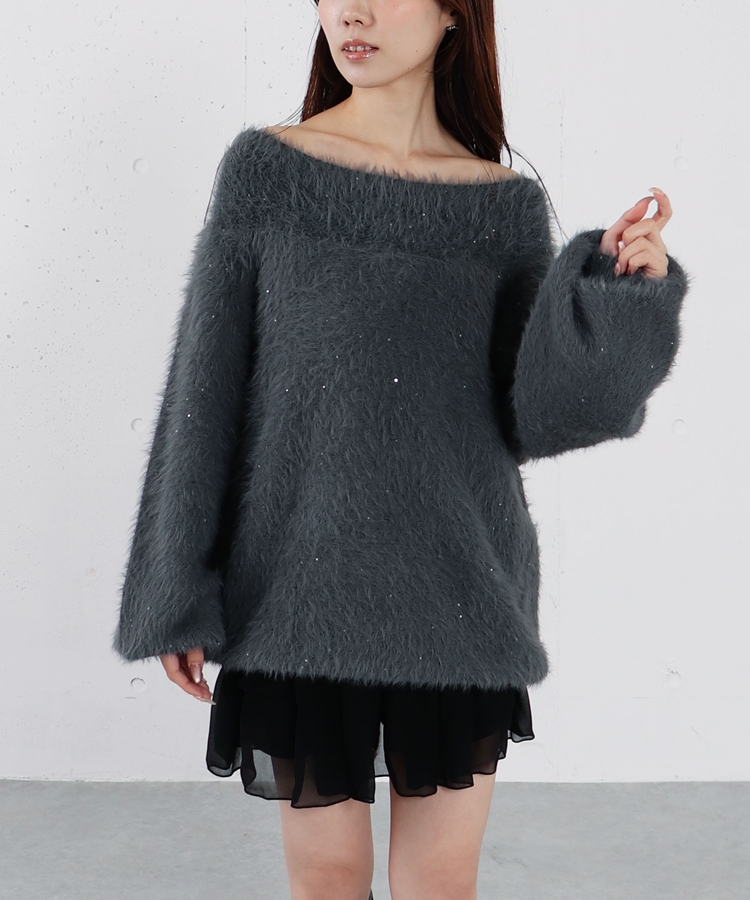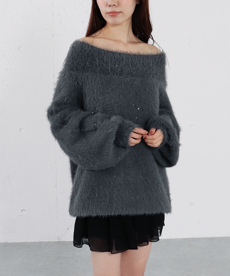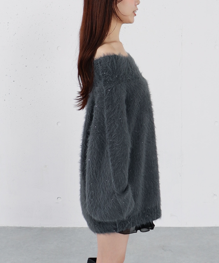 スパンコールフェザーオフショルミドルニットプルオーバー CHARCOAL GRAY