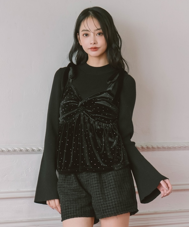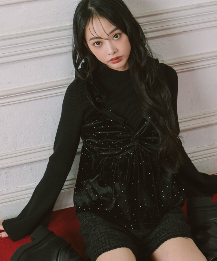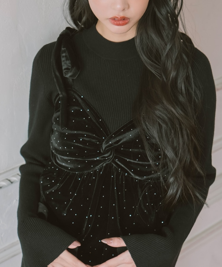 ラインストーンベロアビスチェ×フレアリブニットSET BLACK
