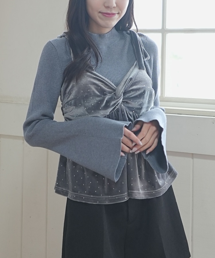 ラインストーンベロアビスチェ×フレアリブニットSET