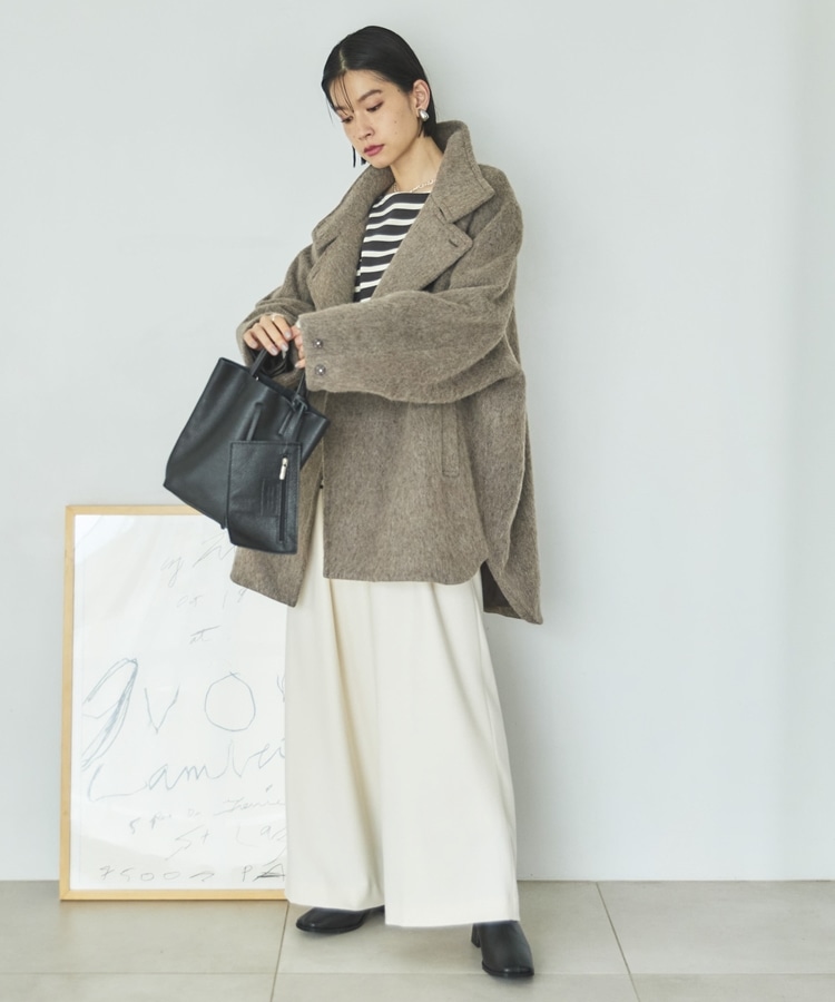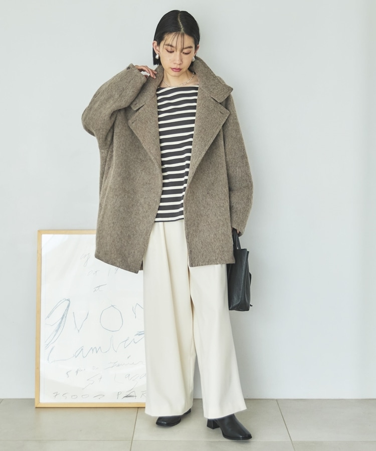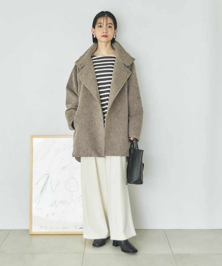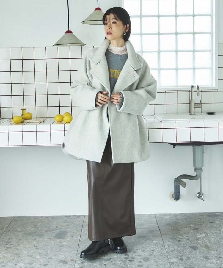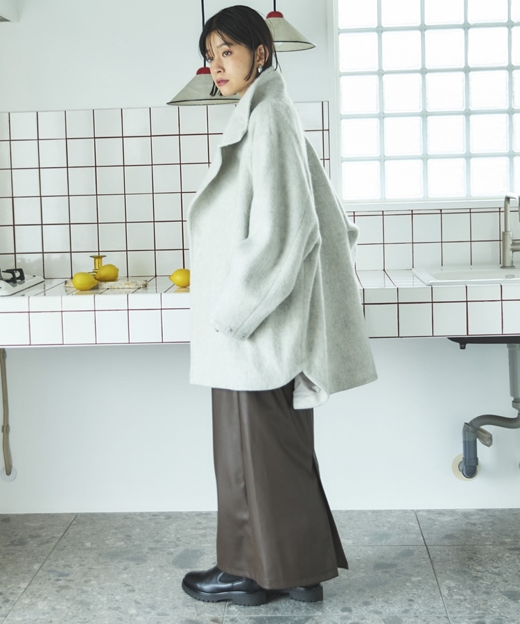 ・閉めるとスタンドカラーですっきり、開けるとPコートのようなシルエットに