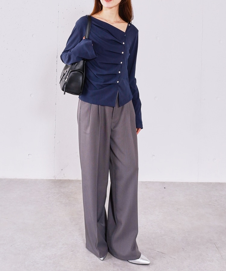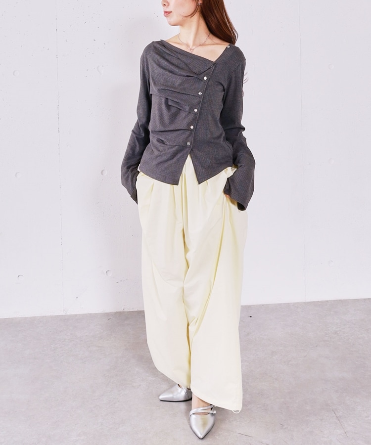 ■すっきり見えと着映えが叶う■archivesで大人気のデザイントップスが再登場!アシンメトリーの目を引くデザインで着映え間違いなし。襟元にボタンがつき、上まで閉じでも着用できる2way仕様になりました。袖口と裾のスリットが抜け感をプラス。斜めに施されたギャザーデザインが、シルエットをすっきりと見せてくれます。デニムでカジュアルに、ミニボトムで韓国ライクな着こなしが楽しめます。レザーやスウェードなどの秋素材とも相性抜群◎ーーーーーーーーーーーーーーー透け感:なし裏地:なし伸縮性:あり光沢感:なし生地厚さ:普通洗濯方法:洗濯可※詳しいお手入れ方法は商品についているタグをご覧くださいーーーーーーーーーーーーーーー※ご利用のモニター環境により、実際の色味と多少異なる場合がございます。