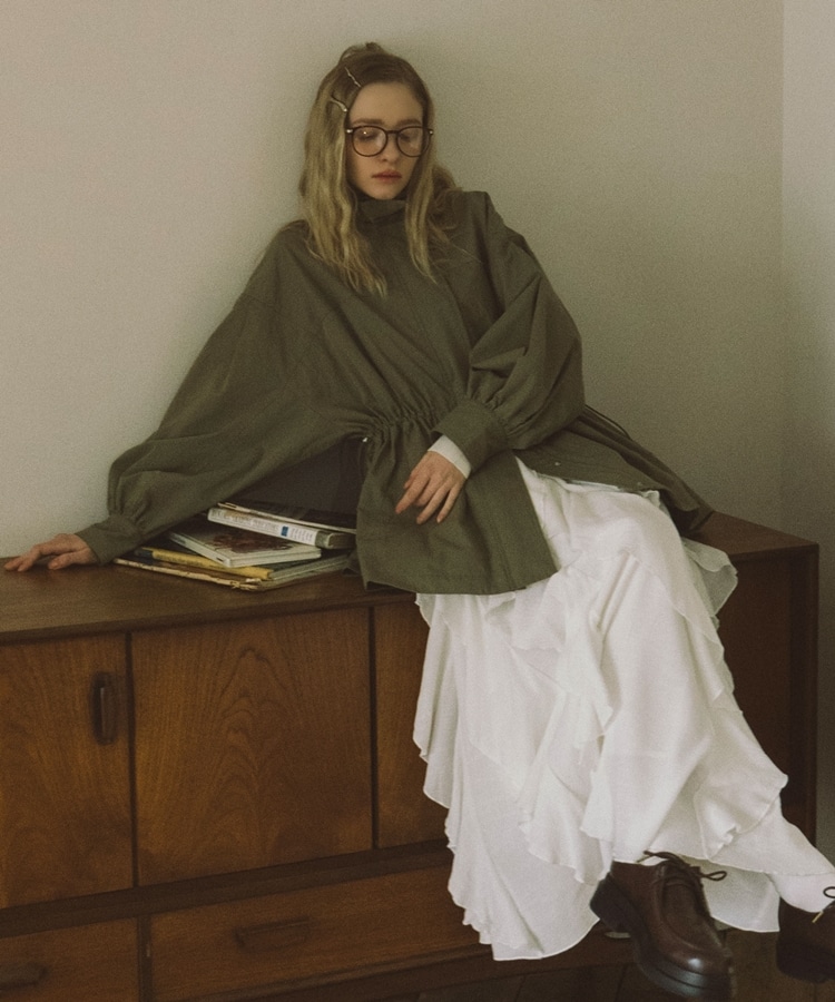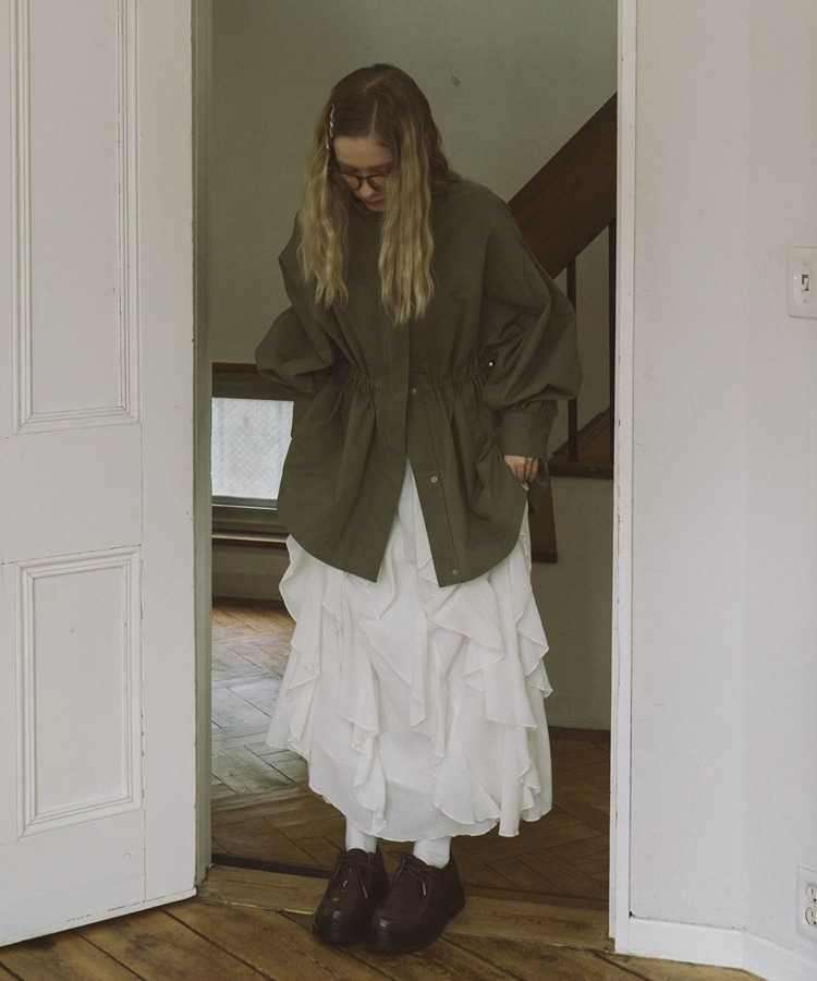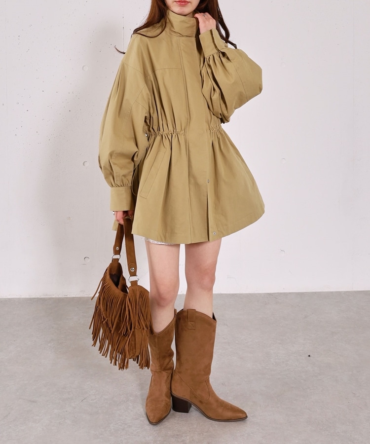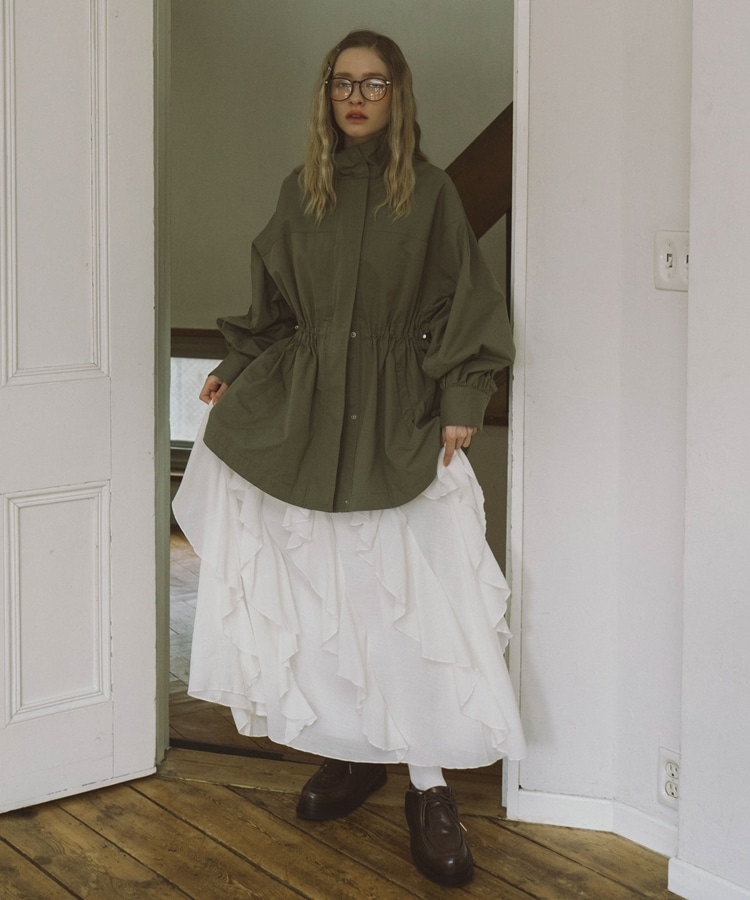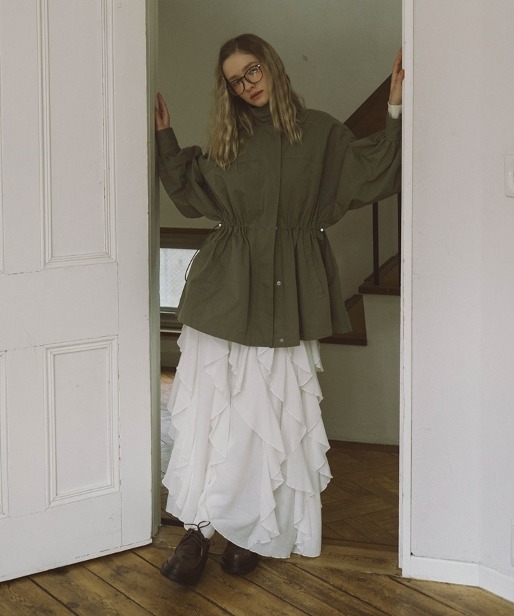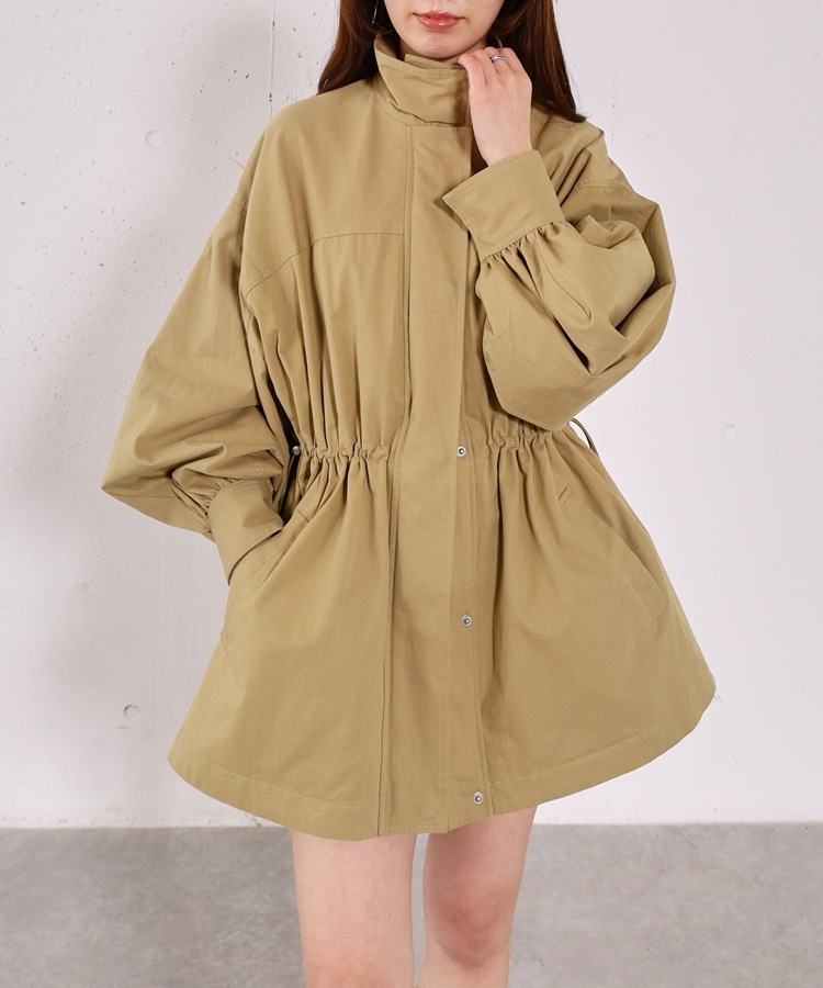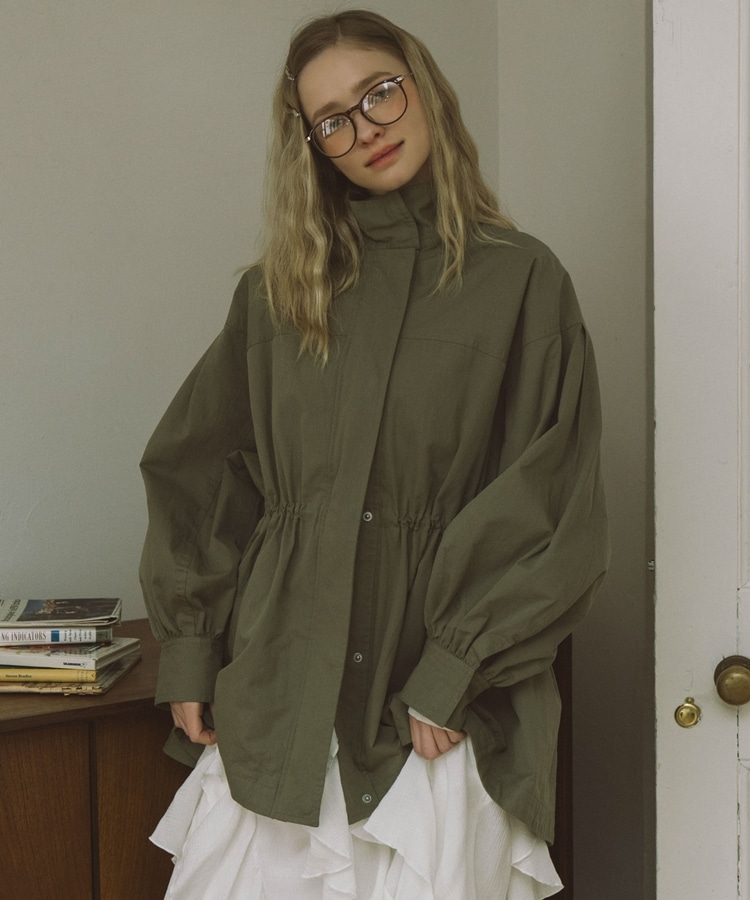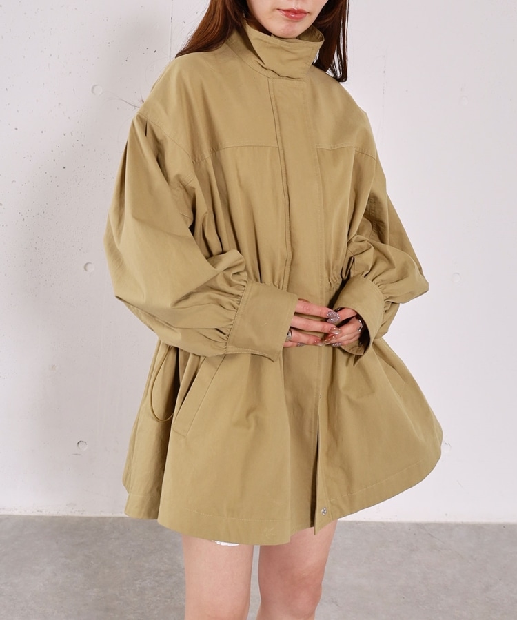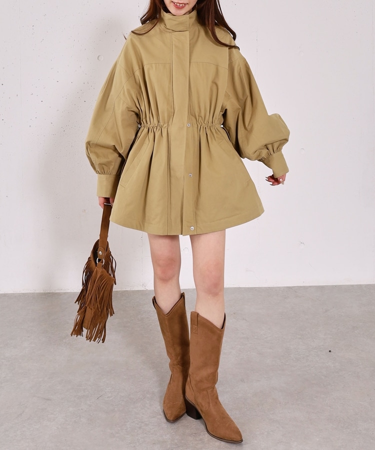 ・ウエストの絞りでワンピース風にも着られるミリタリジャケット