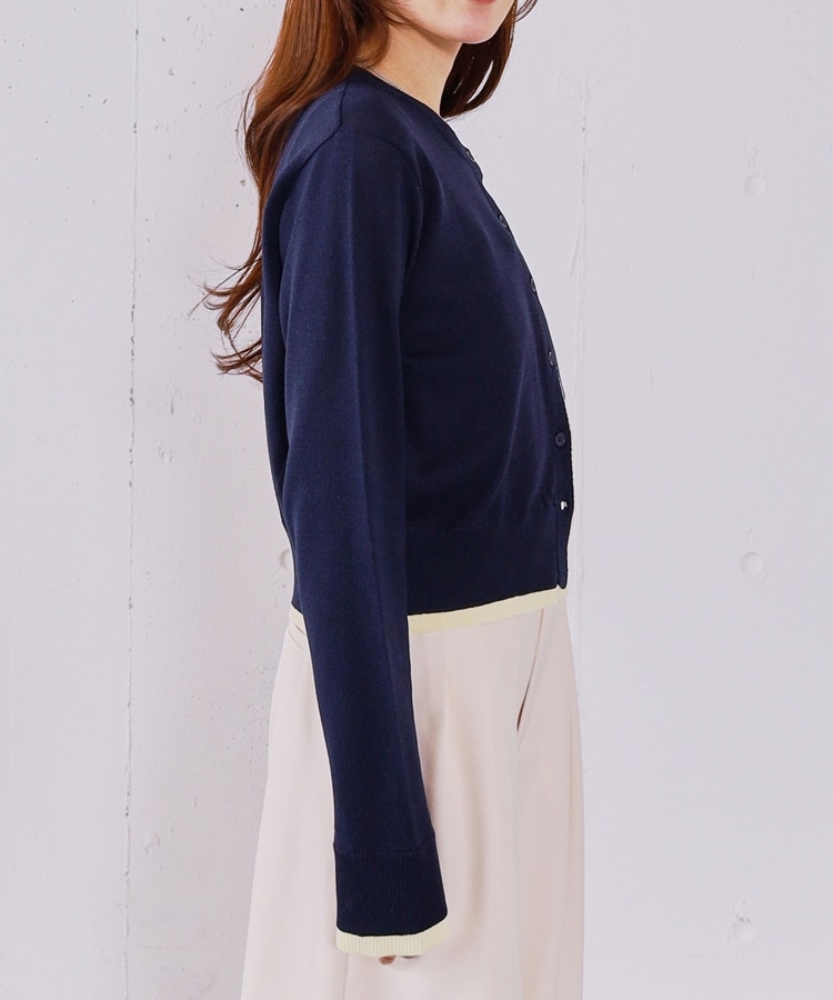 ・バイカラーでレイヤード風に仕上げた、着映えするカーディガン