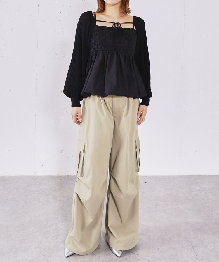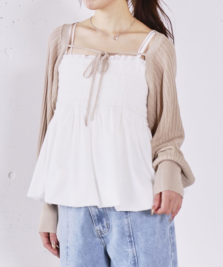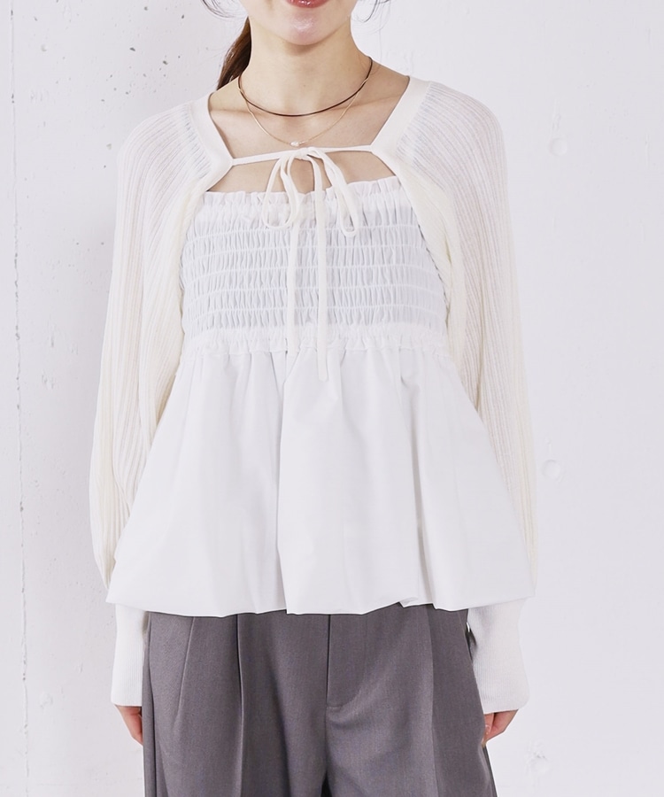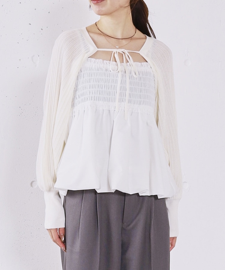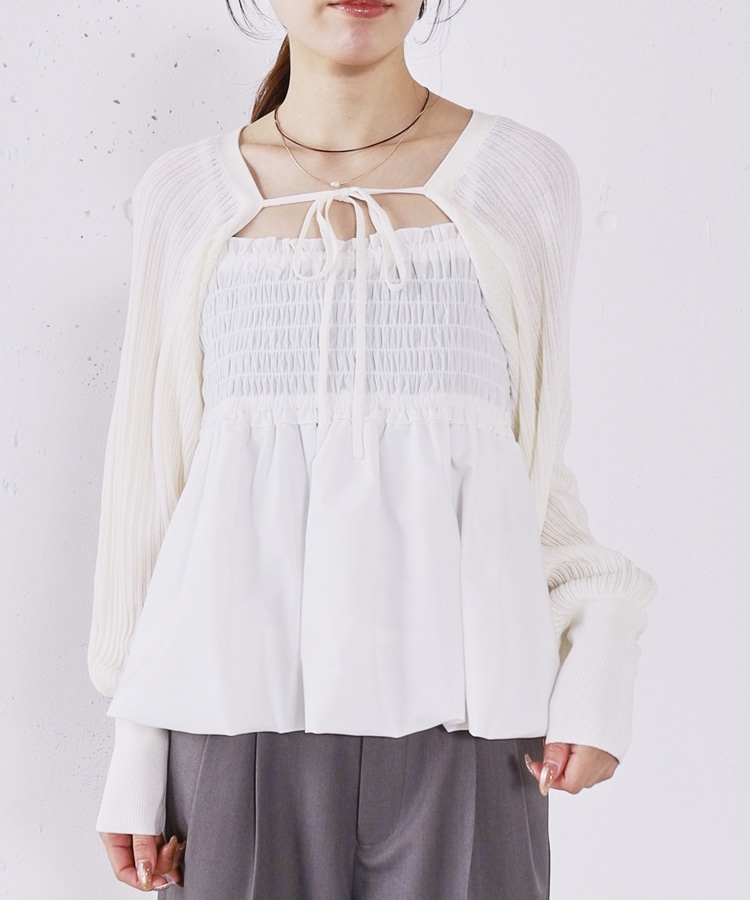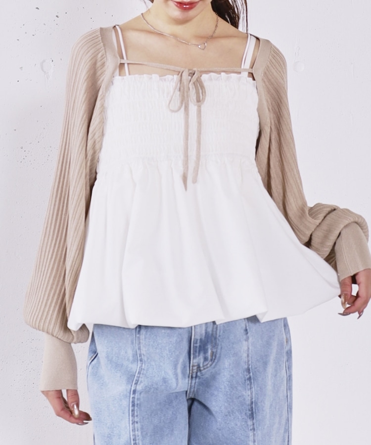 ■ふんわりきれいめバルーンビスチェ×ニットボレロSET■【デザイン】・胸元にシャーリングを施し、胸下切り替えからふんわり広がるバルーンビスチェ・立体感のあるシルエットで、女性らしく華やかな印象に・ボレロ丈のニットはコンパクトなバランスで着痩せ効果も◎・フロントで紐を結ぶデザインで、さりげないリボンが可愛いポイント・手首部分がきゅっと締まり、袖はぽわんとしたシルエットで柔らかい印象に・セットでも単体でも使える、着回し力の高いアイテム【素材感】・ボレロは程よく薄手のニット素材で、ロングシーズン活躍・柔らかく肌なじみの良い質感で、快適な着心地・ビスチェはシルエットがきれいに出る、程よいハリ感のある素材ーーーーーーーーーーーーーーー透け感:なし裏地:なし伸縮性:あり光沢感:なし生地厚さ:普通洗濯方法:可(手洗い推奨)※詳しいお手入れ方法は商品についているタグをご覧くださいーーーーーーーーーーーーーーー※ご利用のモニター環境により、実際の色味と多少異なる場合がございます。【スタイリング】・デニムやカーゴパンツと合わせて、甘さを抑えたカジュアルコーデに・スラックスと合わせて、バランスの取れたきれいめスタイルに・それぞれ単体使いで、ワンピースやTシャツにプラスするのもおすすめ▼スタッフ別の詳しい着こなしは下の COORDINATE をチェック