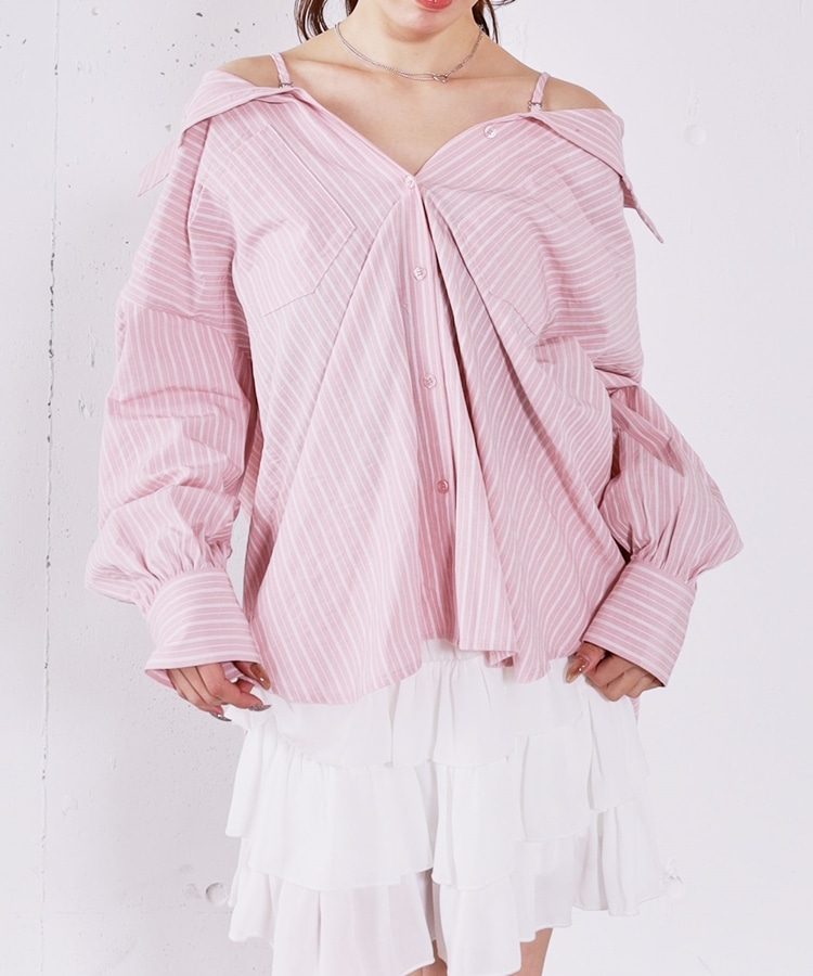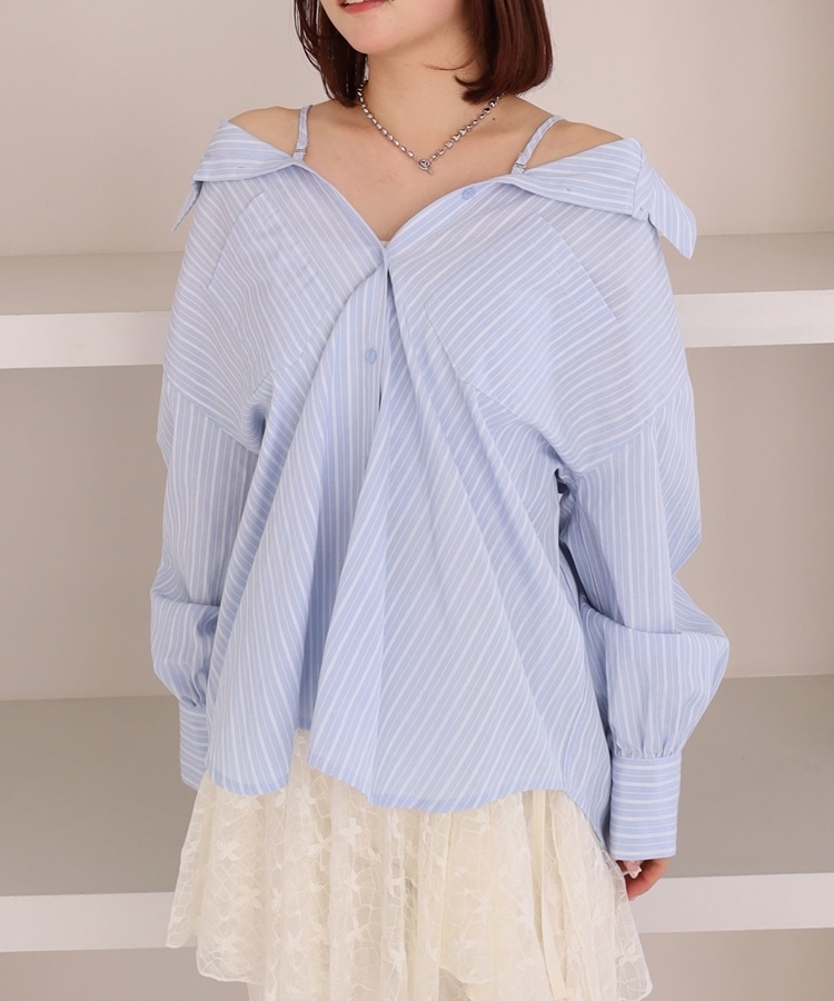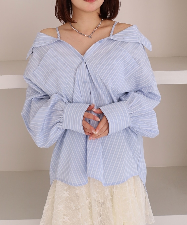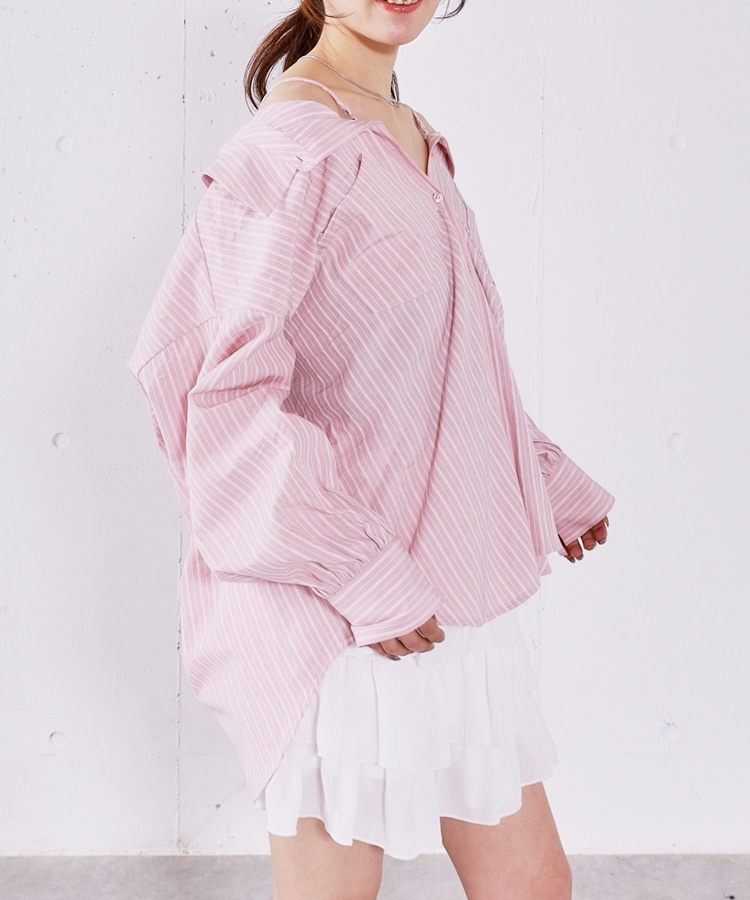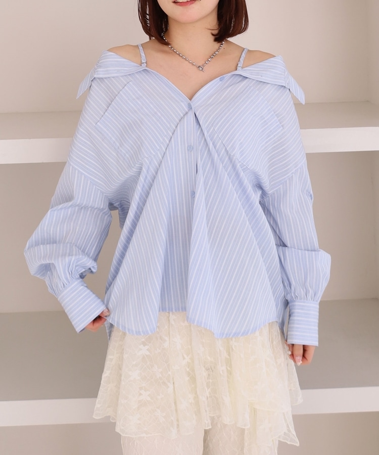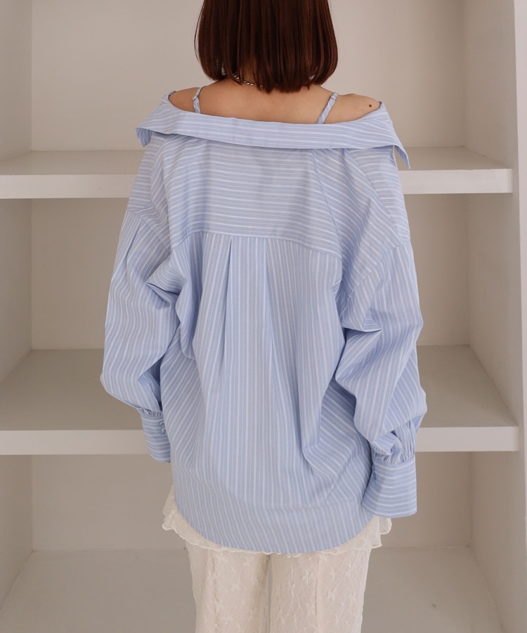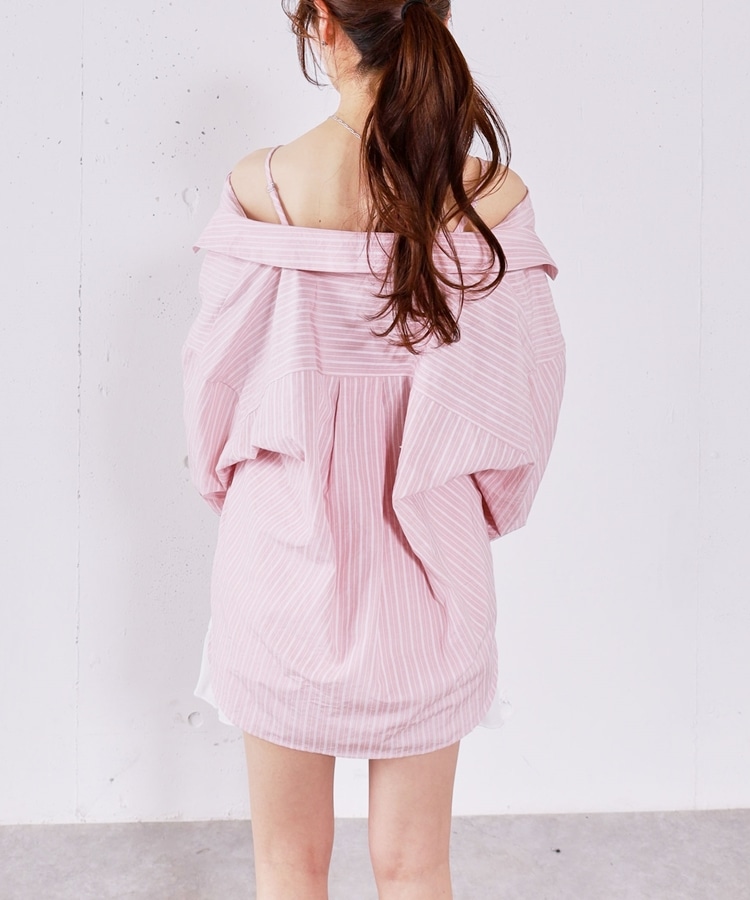 ・シンプルなシャツデザインながら、オフショルにすることで一気に旬な印象に